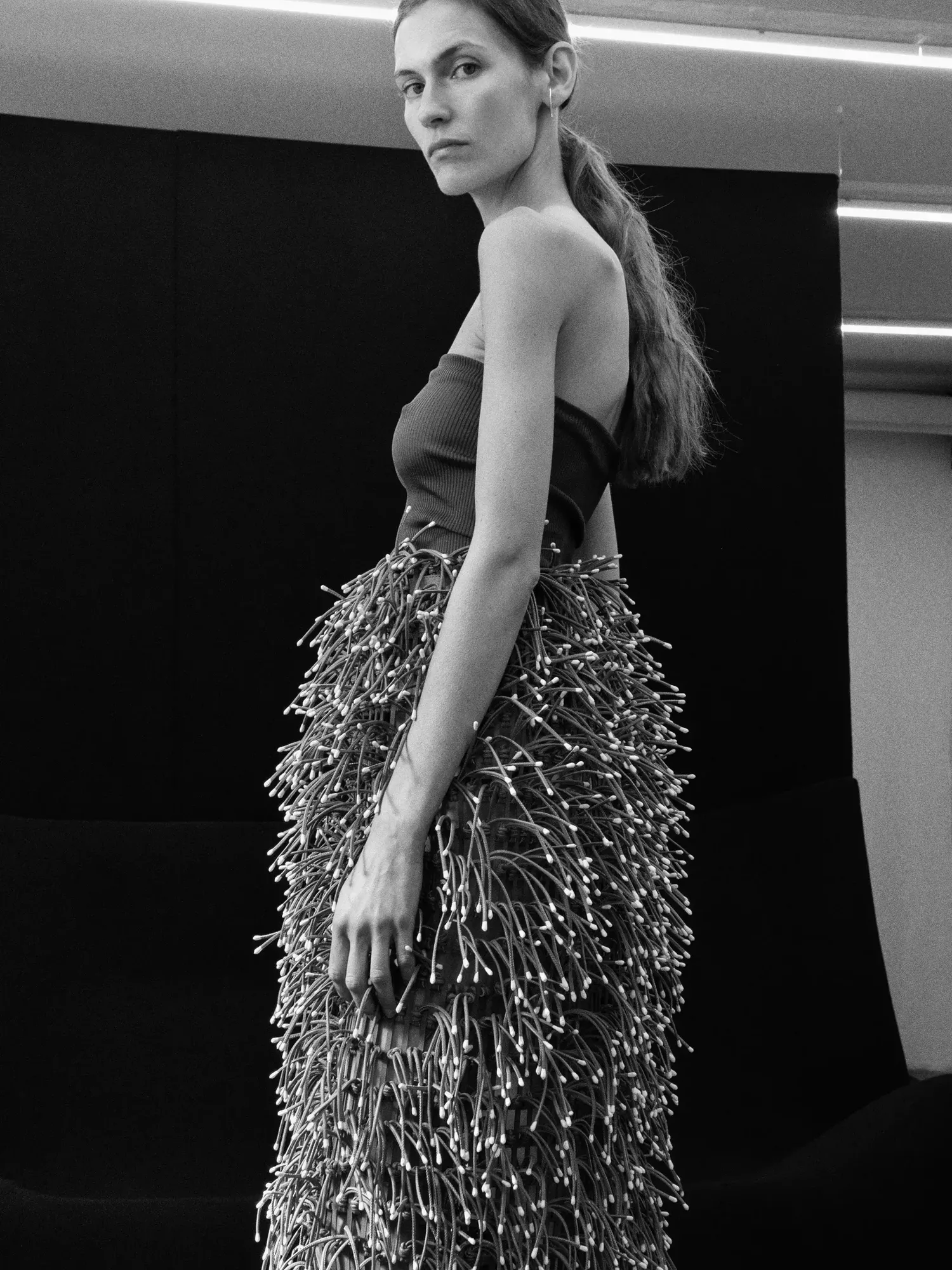 A third new name to look out for is Natascha Thougaard Domino, a recent graduate of Weissensee Kunsthochschule Berlin and one-time Skovgaard intern and dresser at the Royal Ballet, will stage a performance/runway on a public street.
