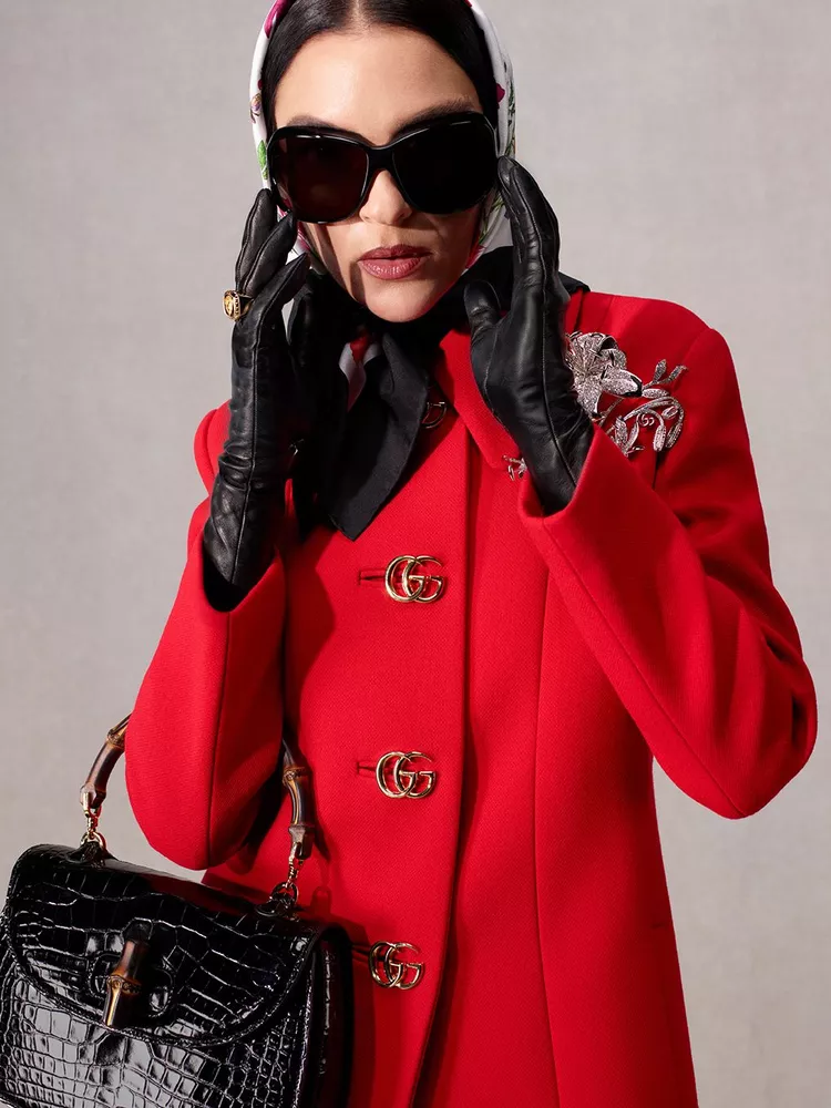 As for the standout pieces, a re-proportioned new take on the iconic Bamboo 1847 bag is sure to be a hit, as is the adaptable Vittoria pump, which can be worn as a mule with the back folded down (a very Demna detail if there ever was one). Also on offer, a vibrant red coat with a swinging 60s silhouette, complete with gold double G buttons.