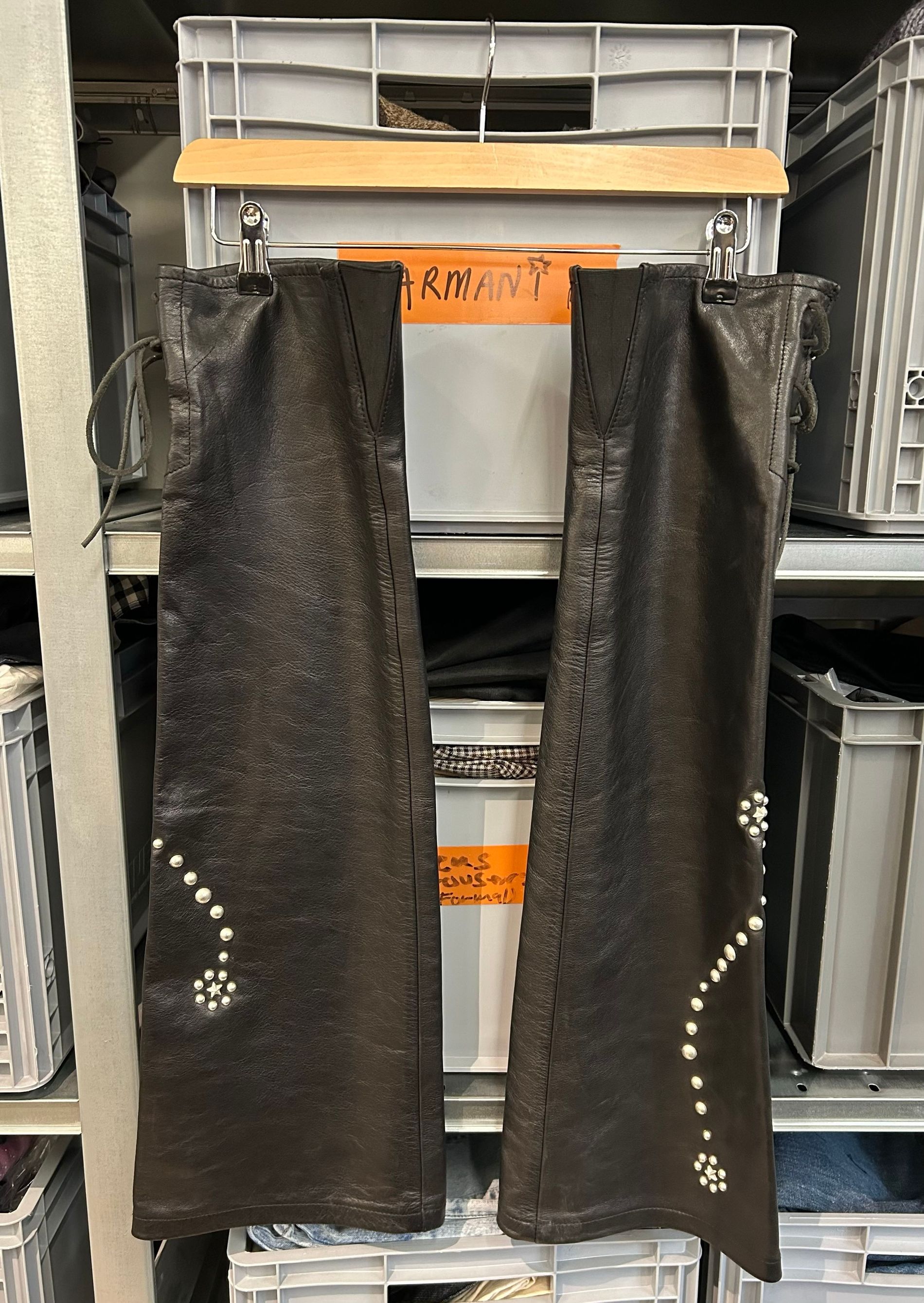 Leather chaps with metal beading at Our Legacy Workshop. Photo: Pontus Björkman