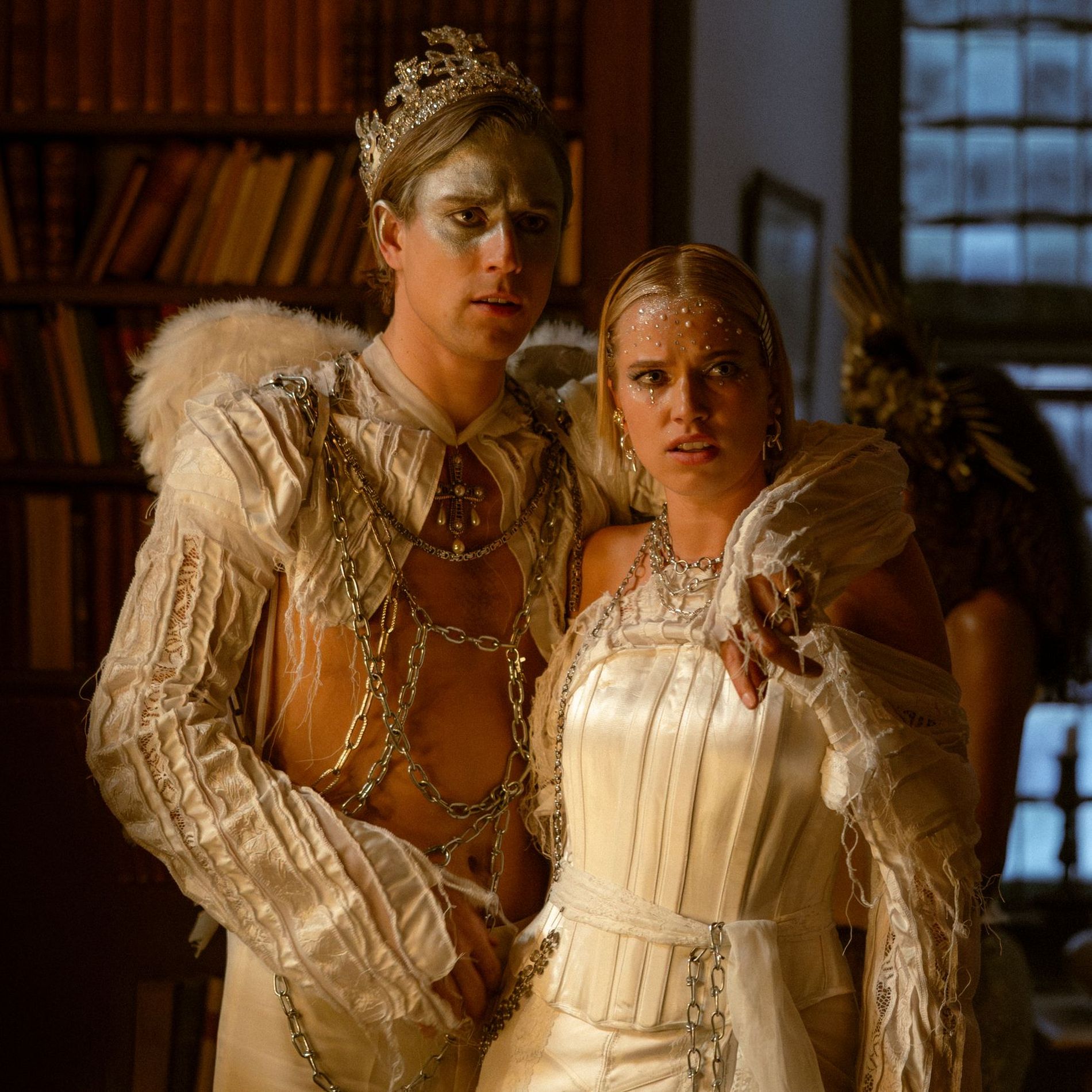 A regularly-dressed PR woman leads me inside Gamla Riksarkivet (formerly the National Archives, now an event venue), up a grand staircase and through the maze-like corridors to meet the film’s stars: Thea Sofie Loch Næss, Christian Fandango and Isac Calmroth. The trio of actors are also dressed for the party – Loch Næss in a dramatic white off-the-shoulder corseted gown, Calmroth in a velvet jacket and Fandango in a cropped shirt and dramatic silver makeup – but have broken character to find a quiet corner to chat.