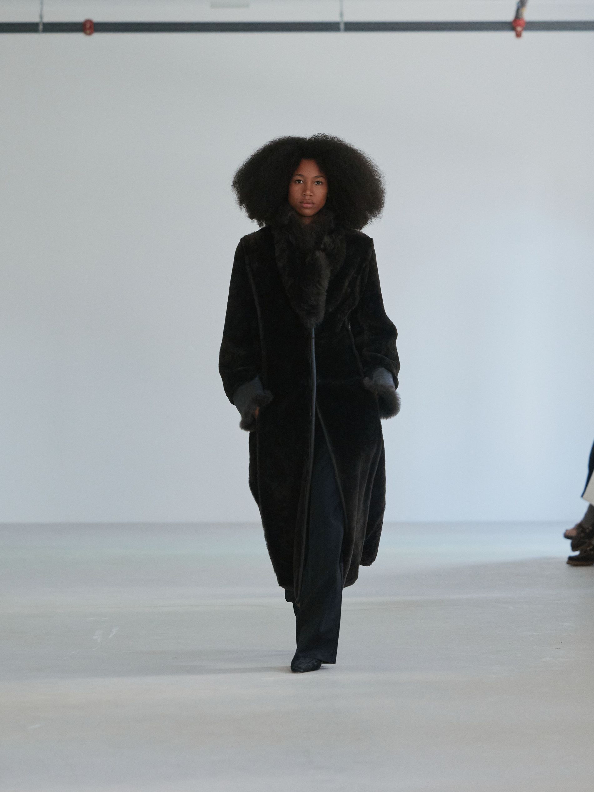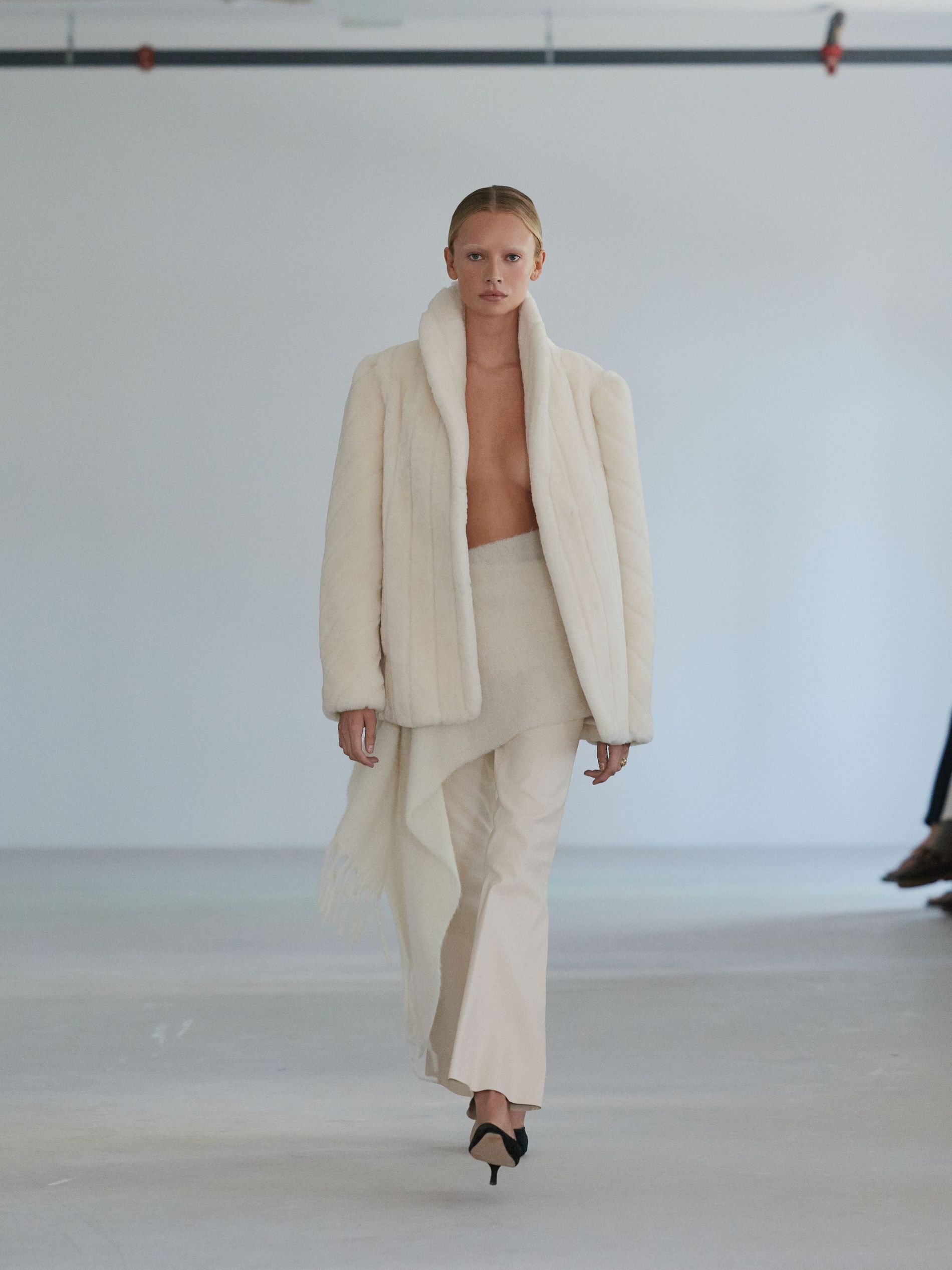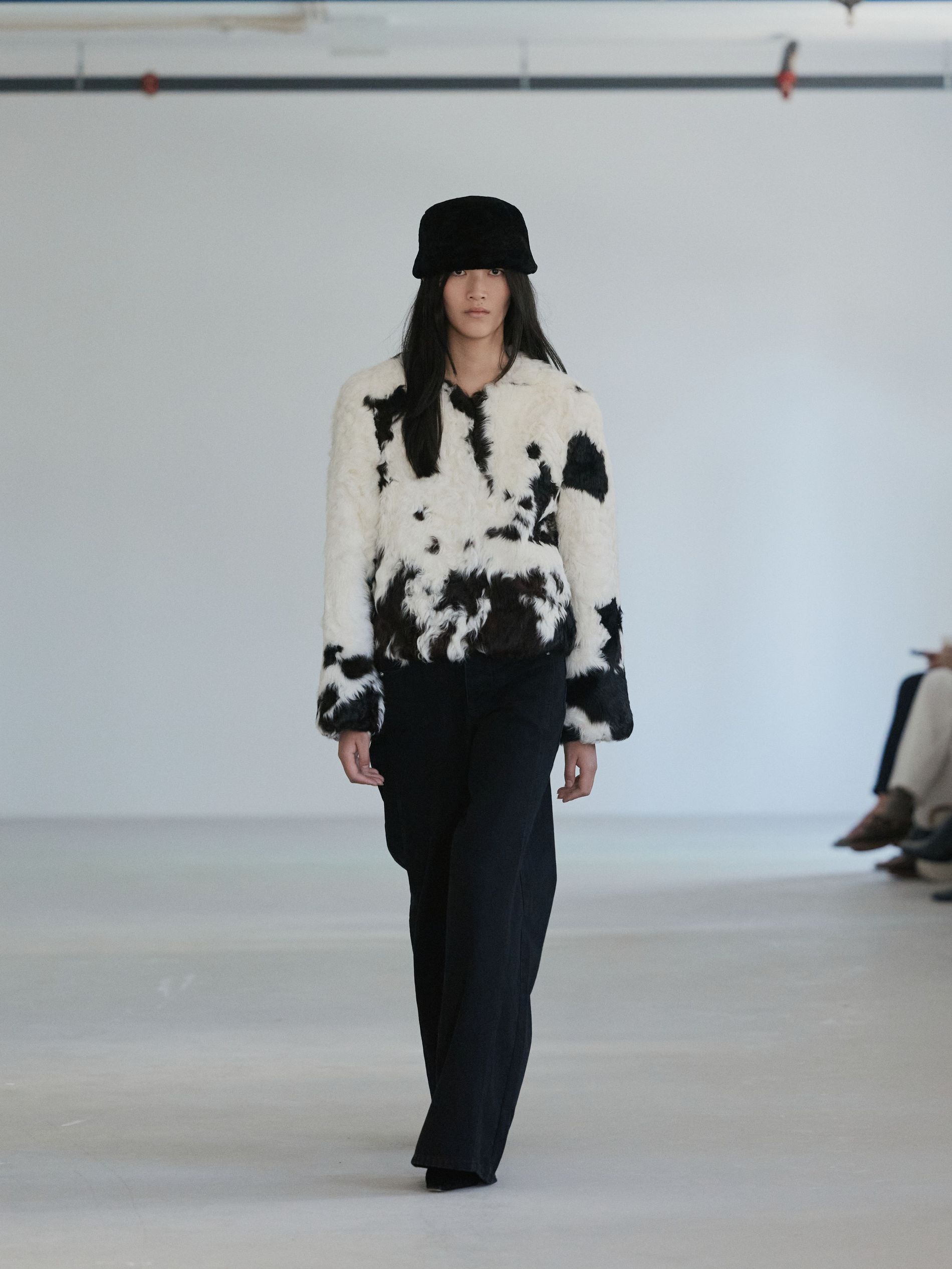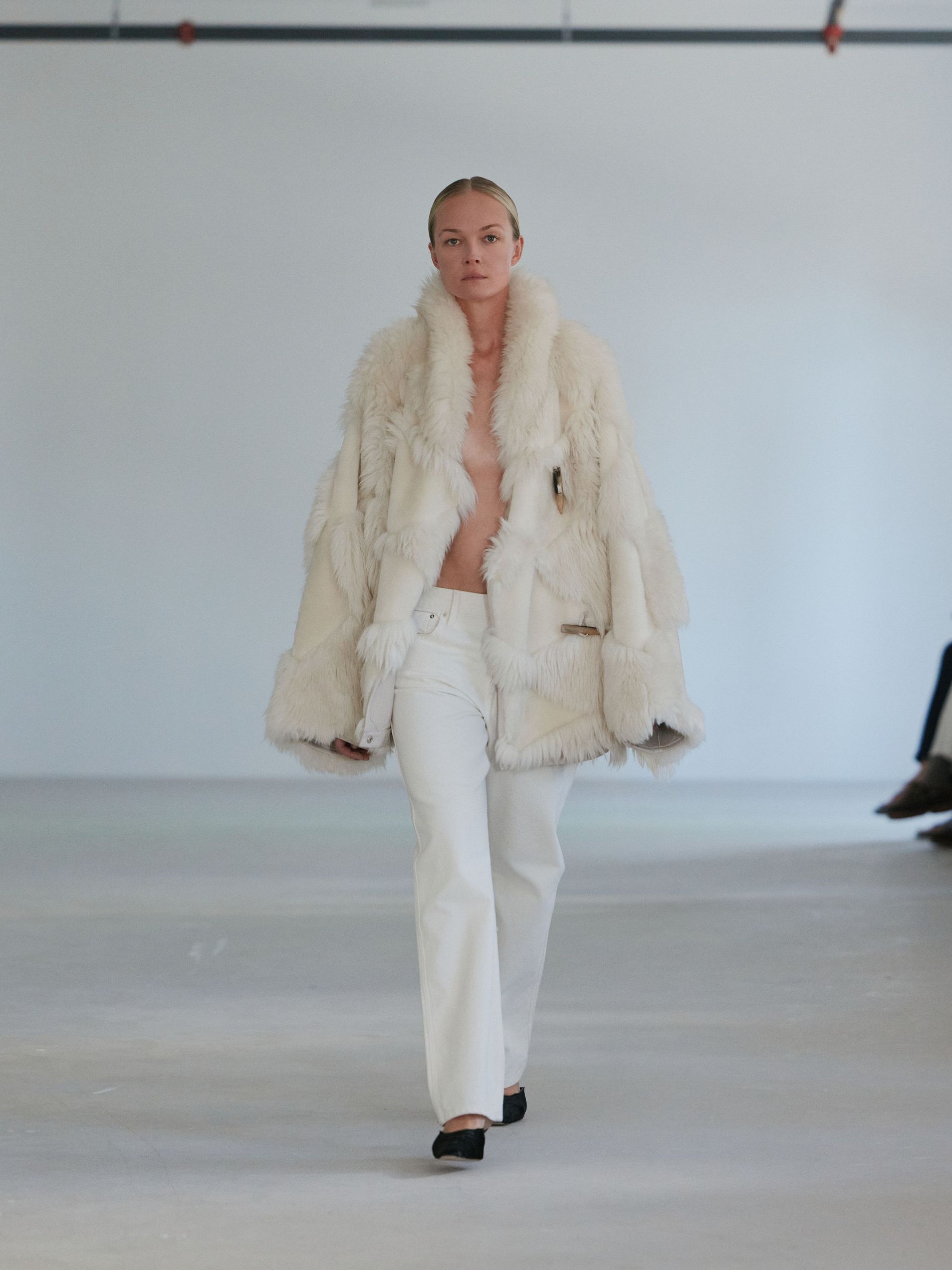 Given that the brand is a response to its Norwegian environment, it’s no surprise that the standout is the outerwear. Take, for instance, the reversible shearling and leather Hawk jacket. Cropped and with a high neck to protect against sharp Scandinavian winds, it’s the sort of piece one will reach for winter after winter. Balancing out these forever garments are standout showpieces – a leopard wrap around skirt, for instance, worn over black trousers, and a delicious goat shearling jacket.
