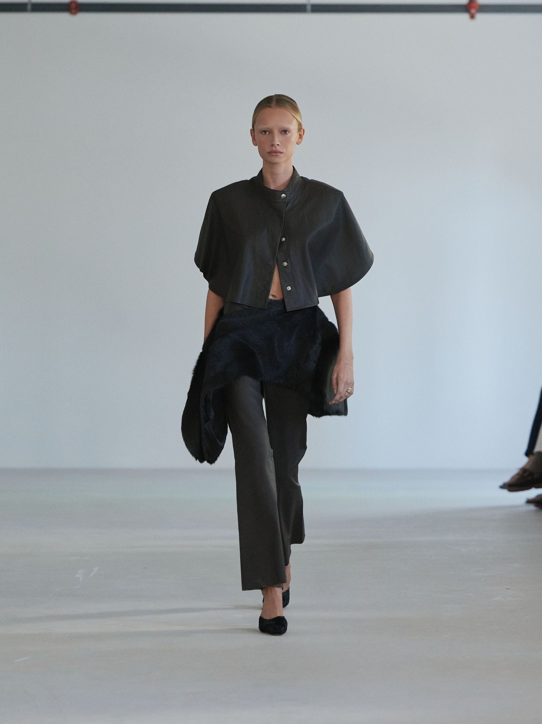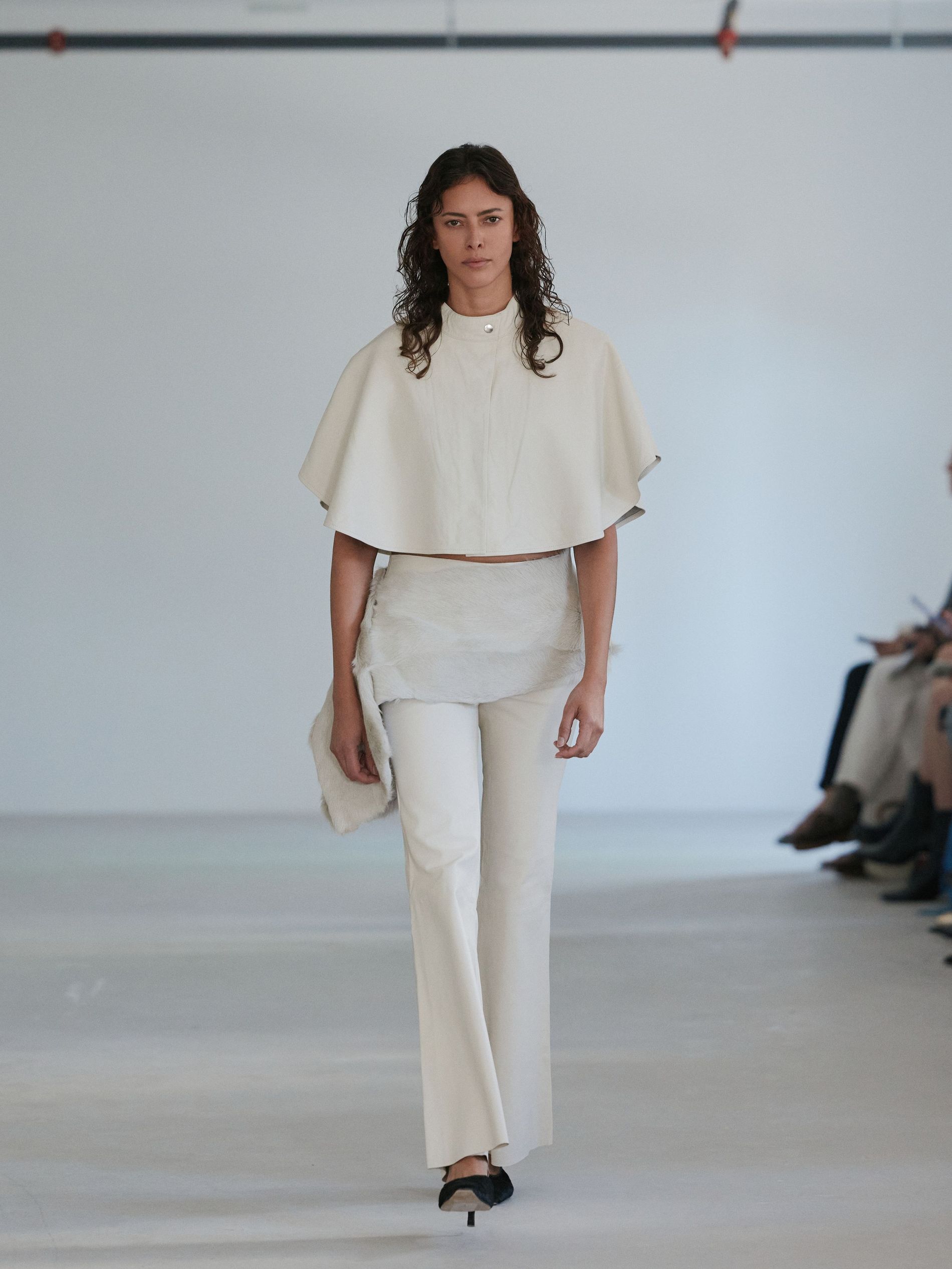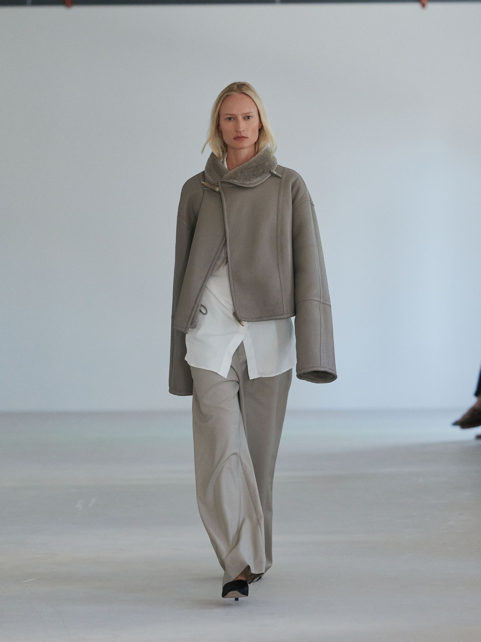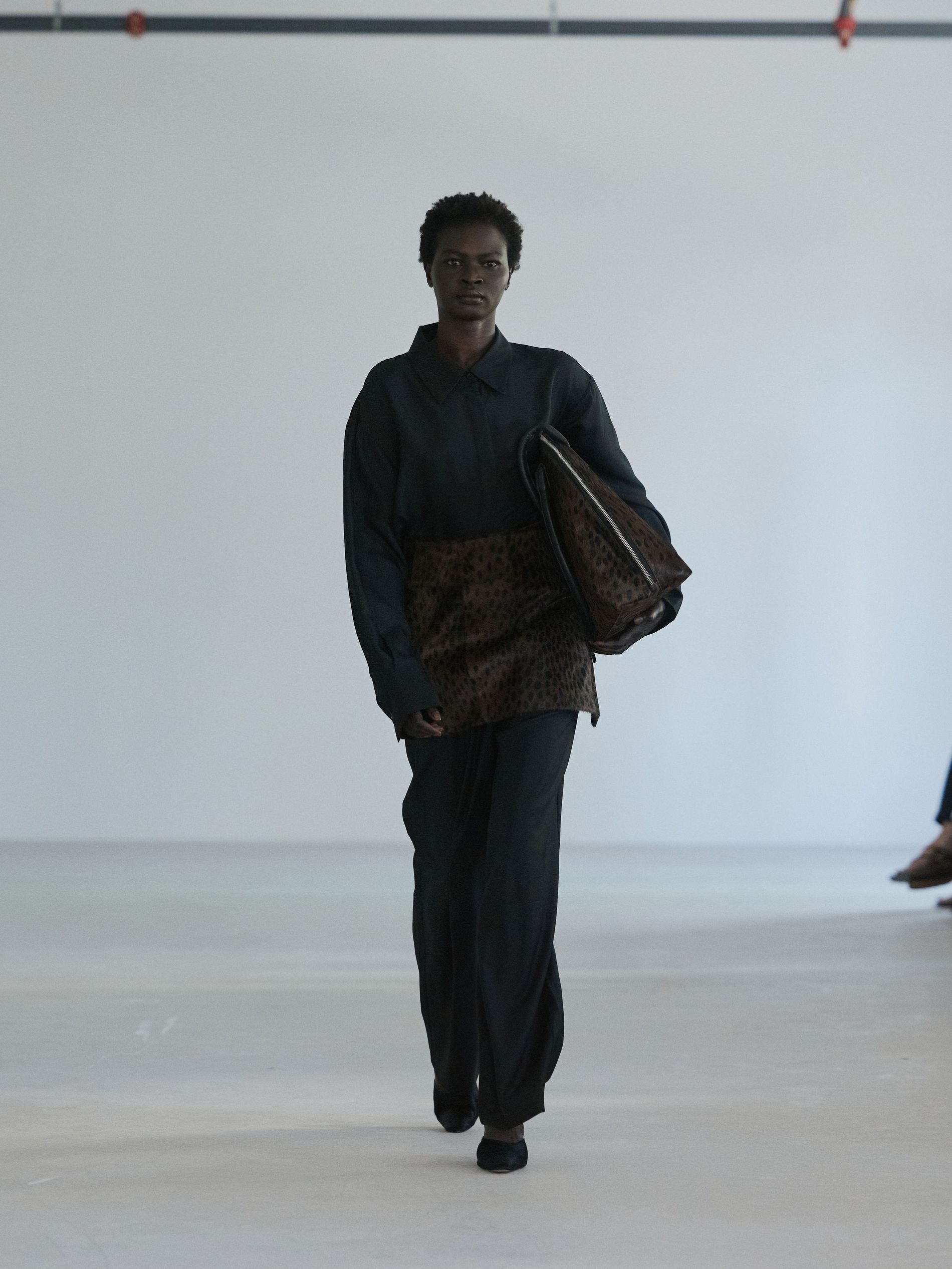 Given that the brand is a response to its Norwegian environment, it’s no surprise that the standout is the outerwear. Take, for instance, the reversible shearling and leather Hawk jacket. Cropped and with a high neck to protect against sharp Scandinavian winds, it’s the sort of piece one will reach for winter after winter. Balancing out these forever garments are standout showpieces – a leopard wrap around skirt, for instance, worn over black trousers, and a delicious goat shearling jacket.