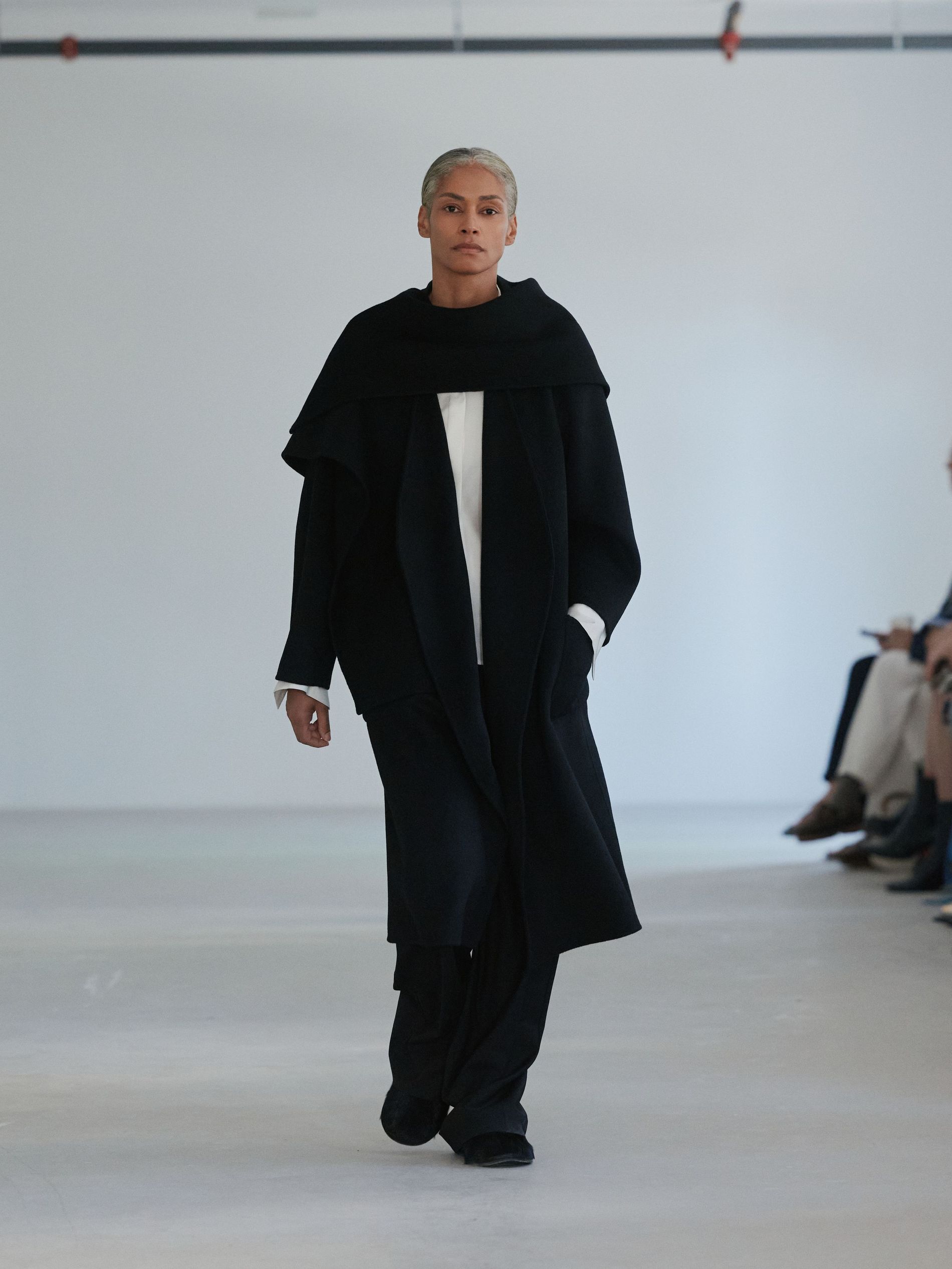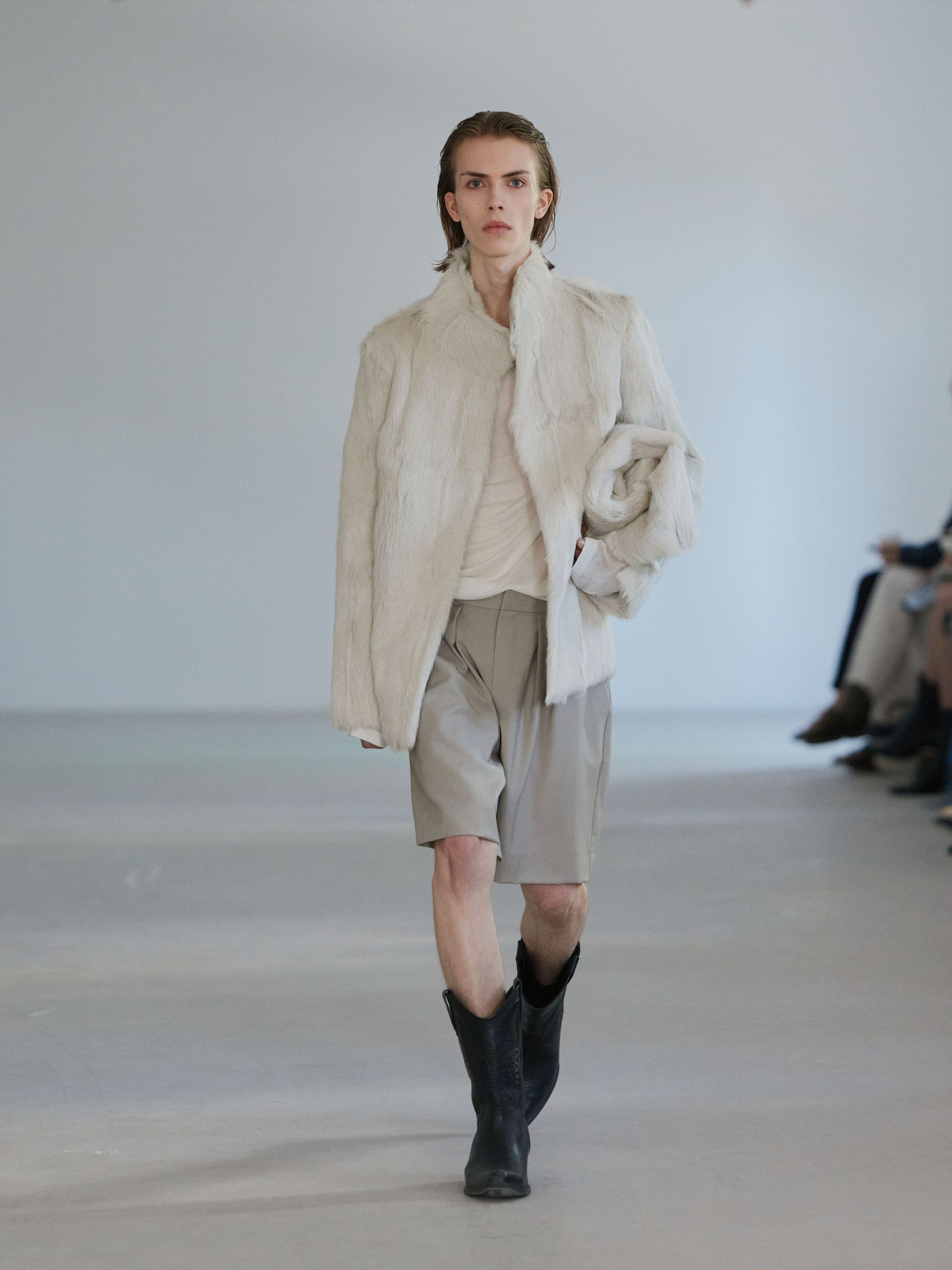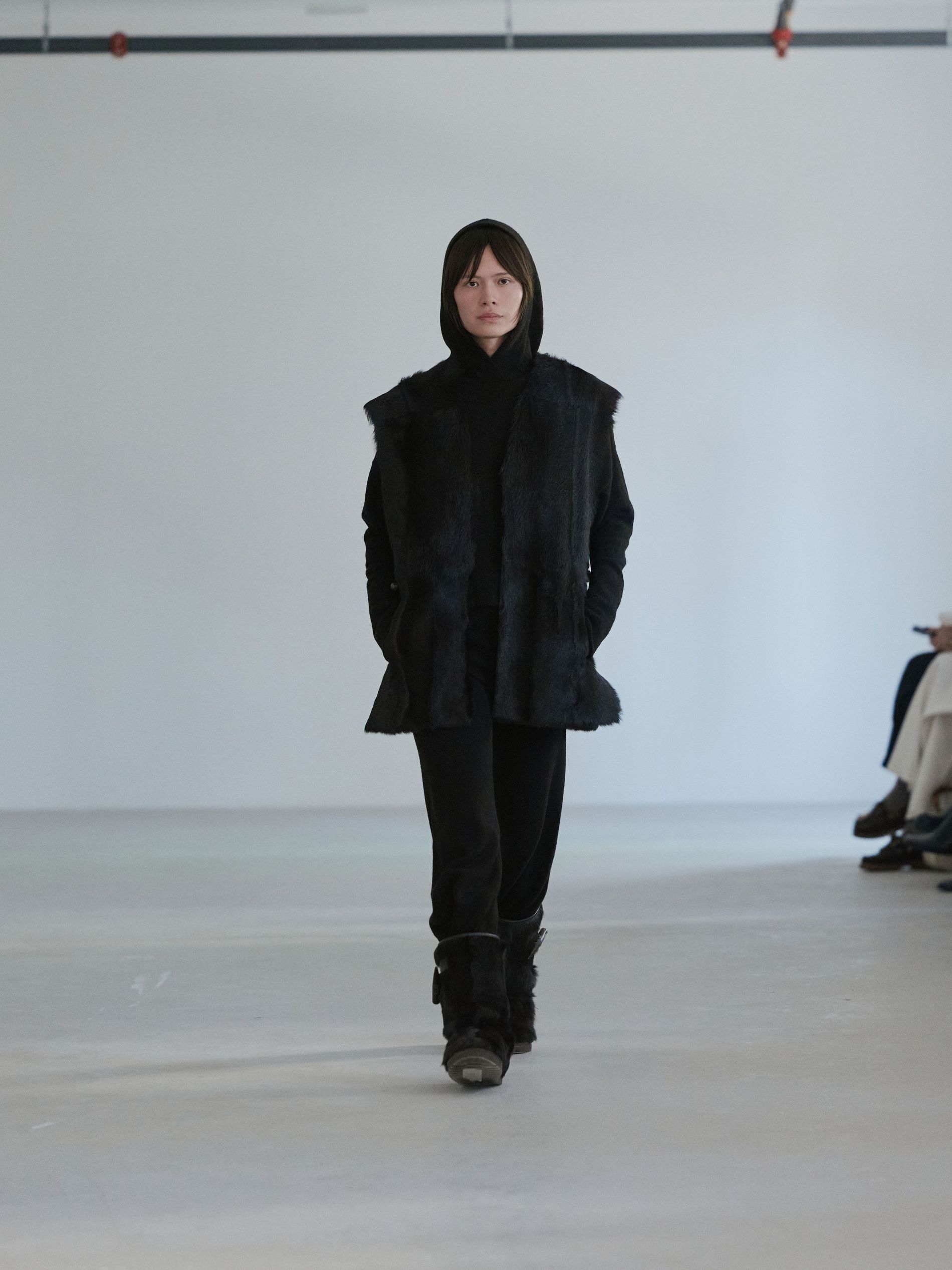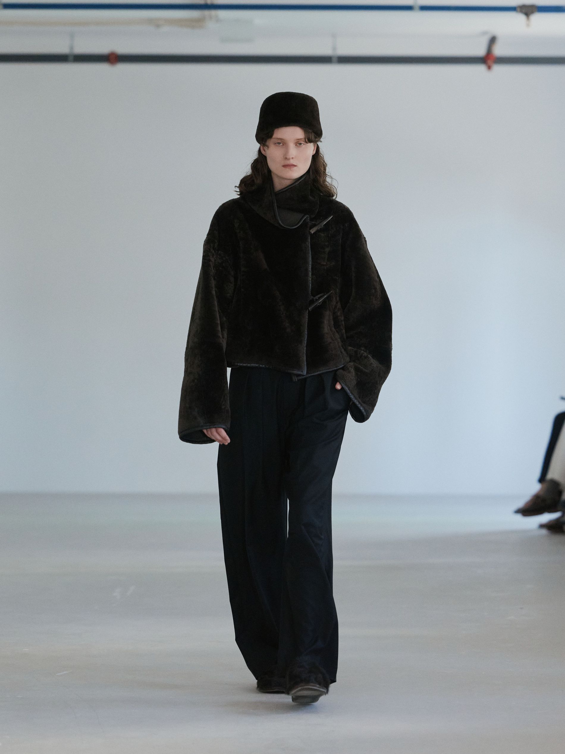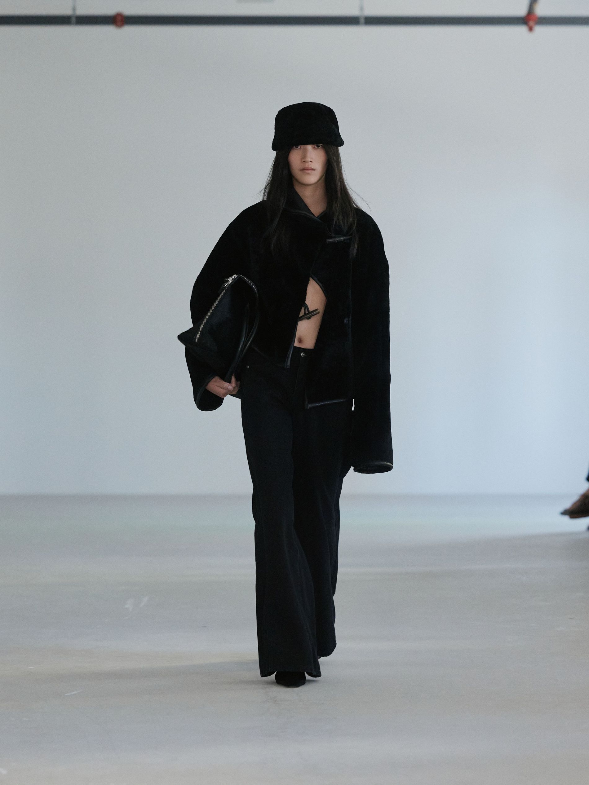 Given that the brand is a response to its Norwegian environment, it’s no surprise that the standout is the outerwear. Take, for instance, the reversible shearling and leather Hawk jacket. Cropped and with a high neck to protect against sharp Scandinavian winds, it’s the sort of piece one will reach for winter after winter. Balancing out these forever garments are standout showpieces – a leopard wrap around skirt, for instance, worn over black trousers, and a delicious goat shearling jacket.