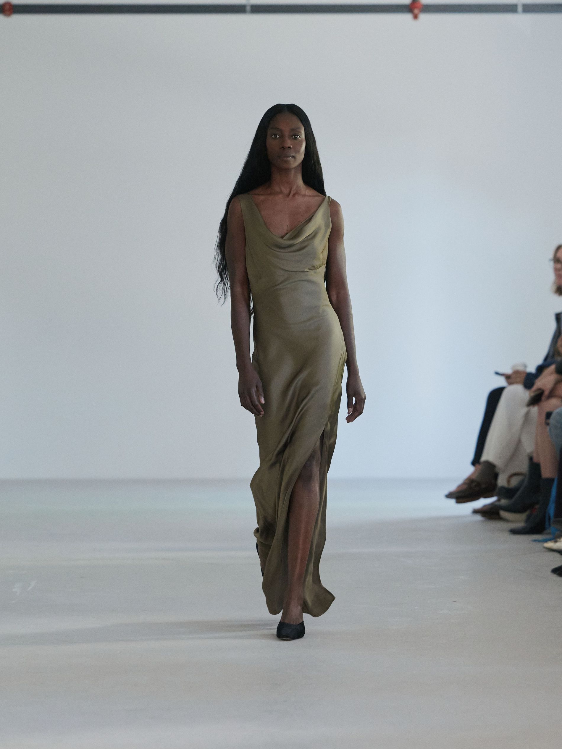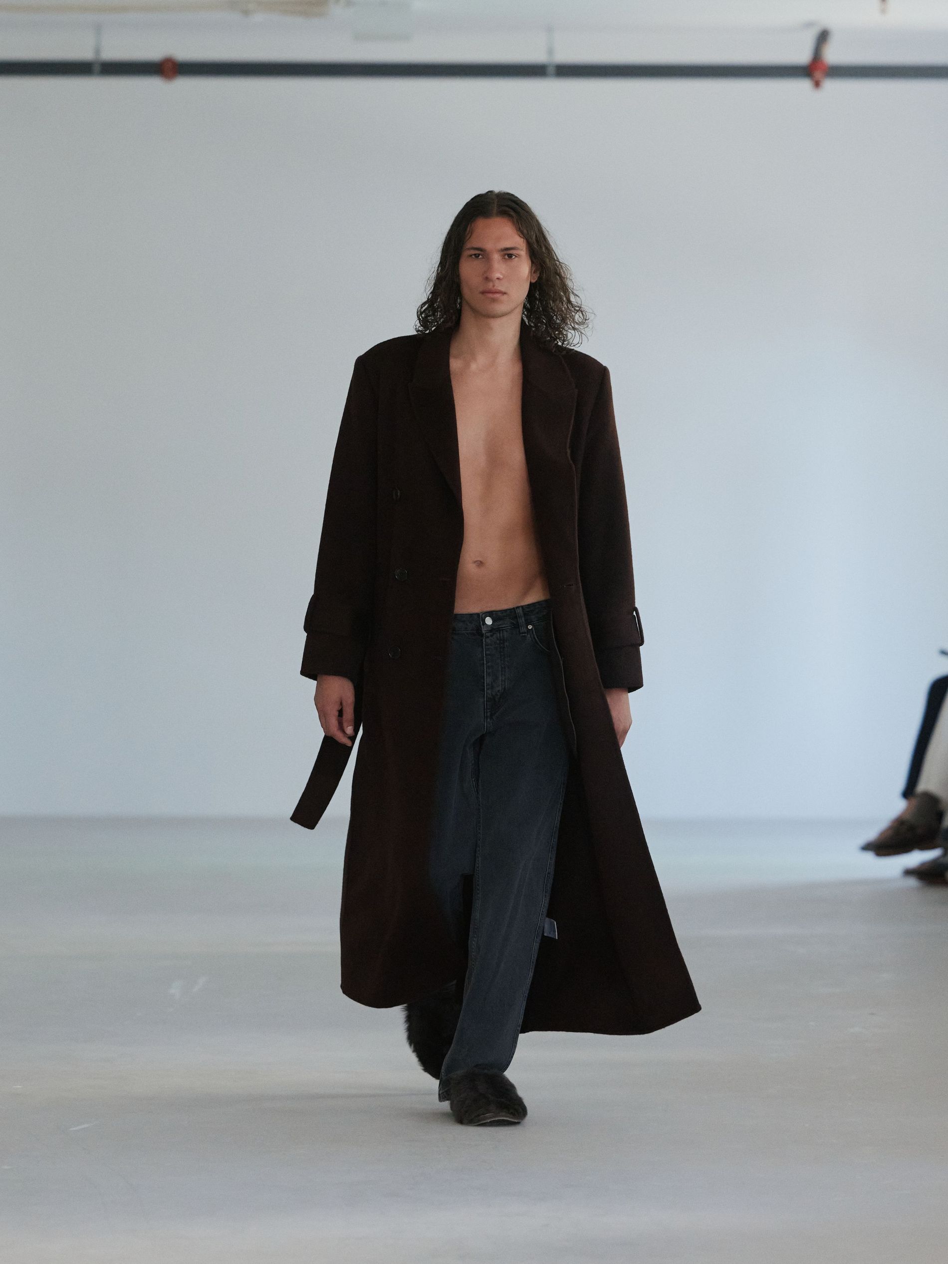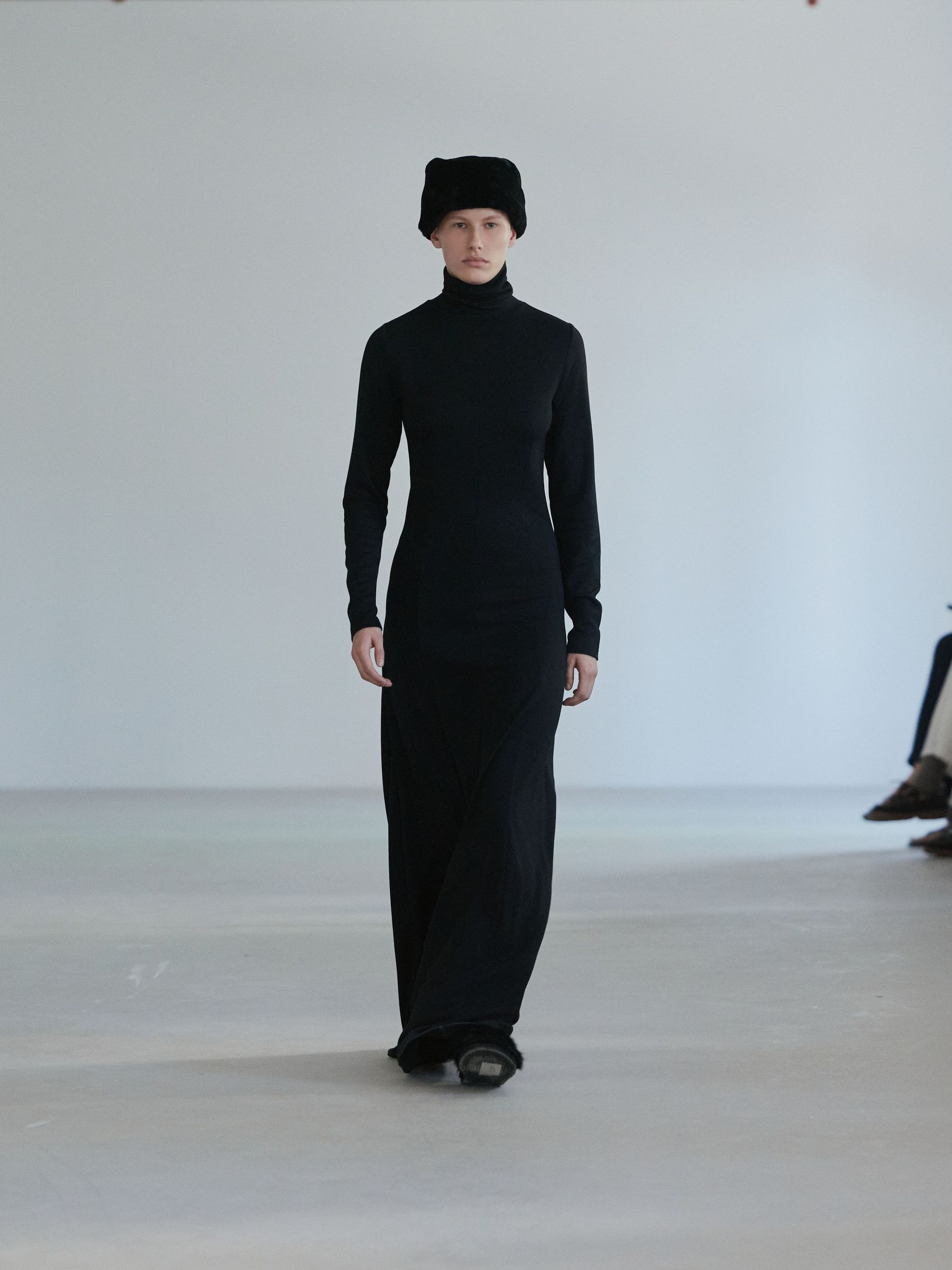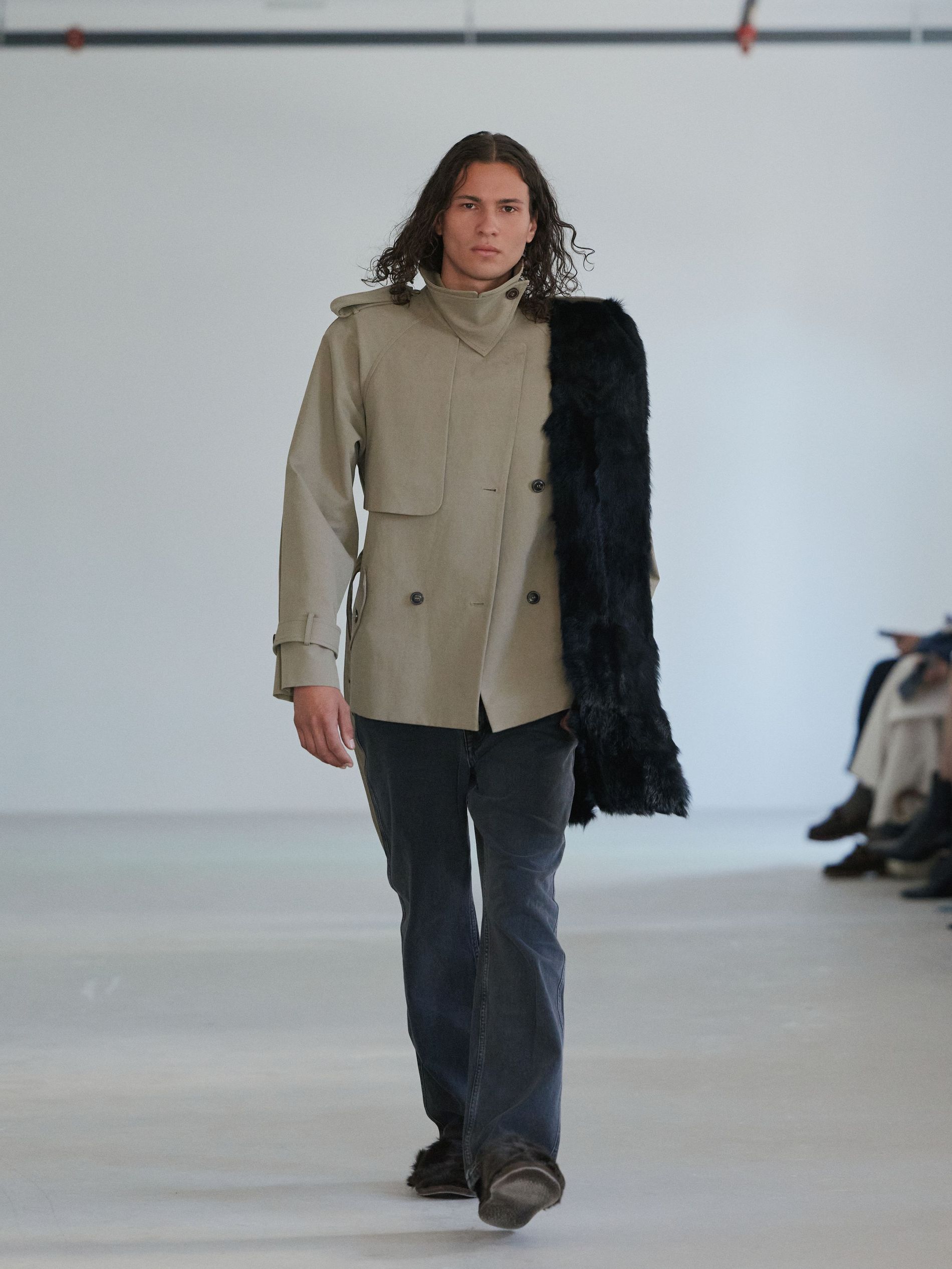 Given that the brand is a response to its Norwegian environment, it’s no surprise that the standout is the outerwear. Take, for instance, the reversible shearling and leather Hawk jacket. Cropped and with a high neck to protect against sharp Scandinavian winds, it’s the sort of piece one will reach for winter after winter. Balancing out these forever garments are standout showpieces – a leopard wrap around skirt, for instance, worn over black trousers, and a delicious goat shearling jacket.