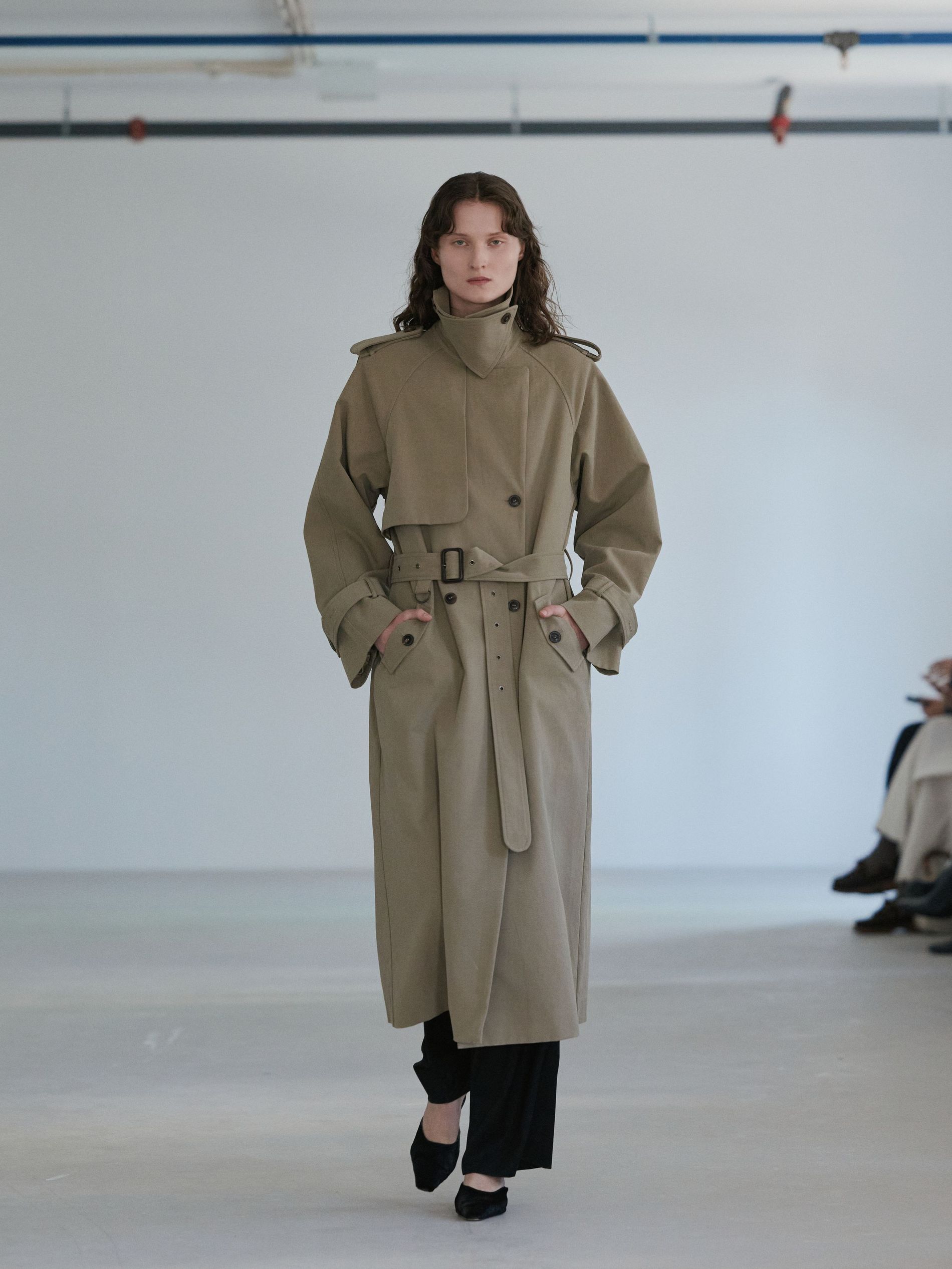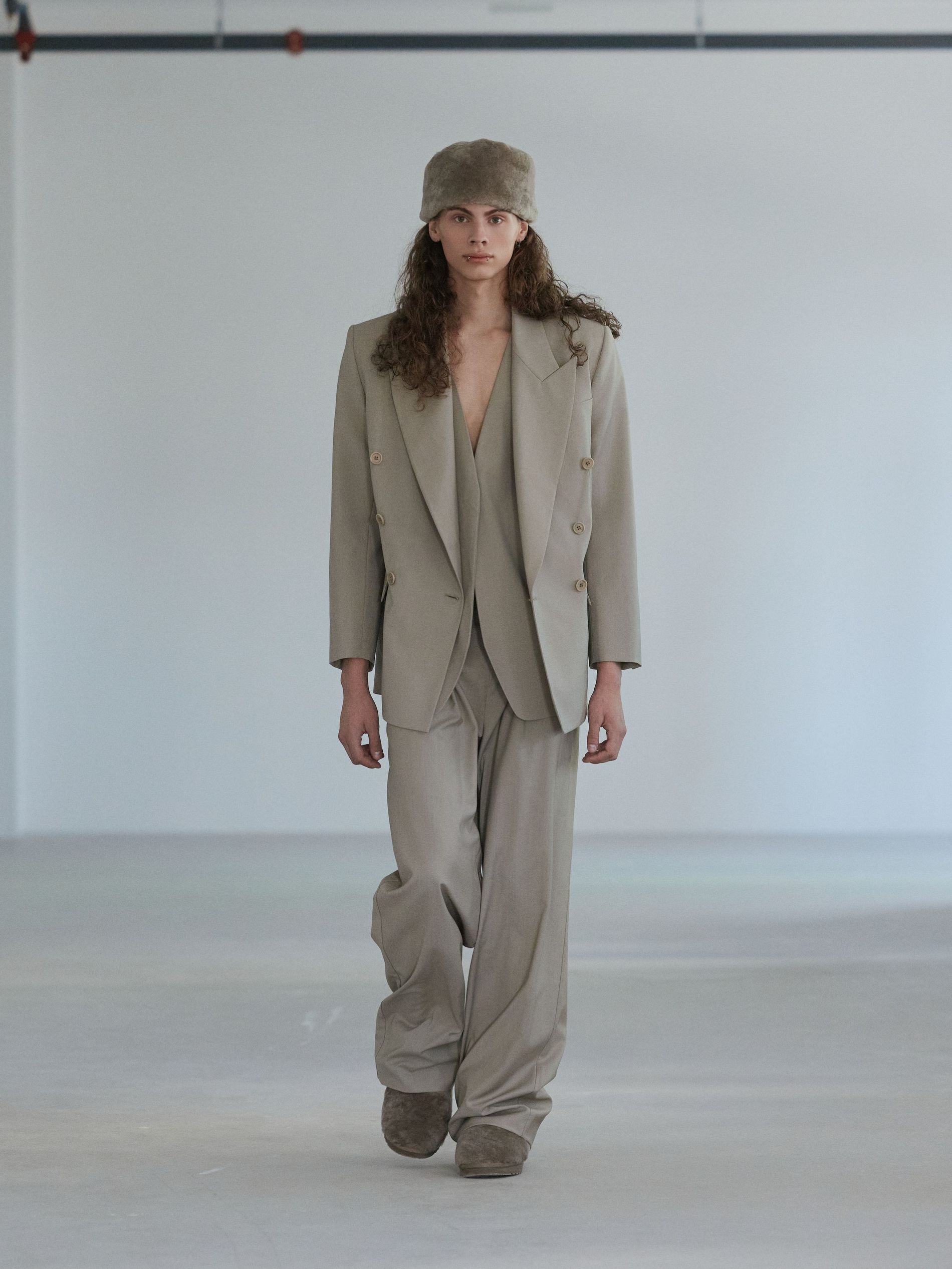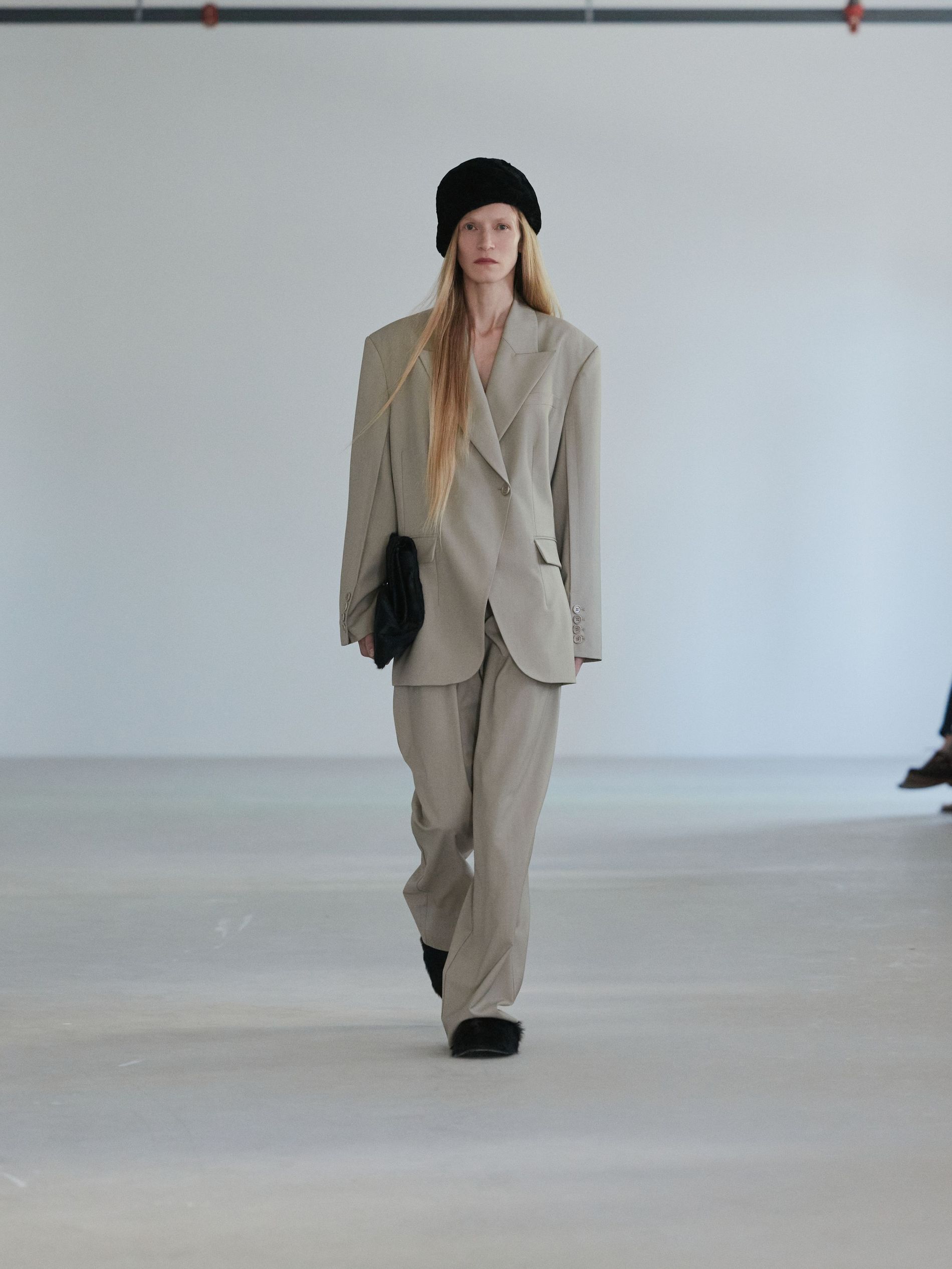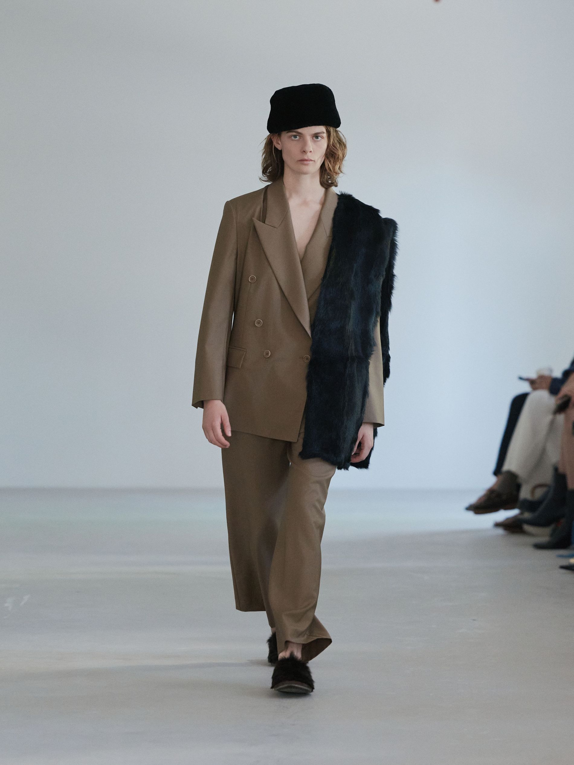 Throughout the collection, one finds the sort of tactile pieces that beg to be touched – hairy knits and fuzzy shearling, buttery leathers and oversized knits, all in that earthy palette of taupe, brown and ecru. No-nonsense relaxed tailoring adds a bit of toughness – these are clothes for the sort of woman (or man) who’s utterly prepared. The looks are finished by fuzzy shearling boots and slouchy pillbox hats – pieces that are at once covetable and function-forward - as well as a great furry scarf, cleverly styled under the epaulette of a classic trench coat.