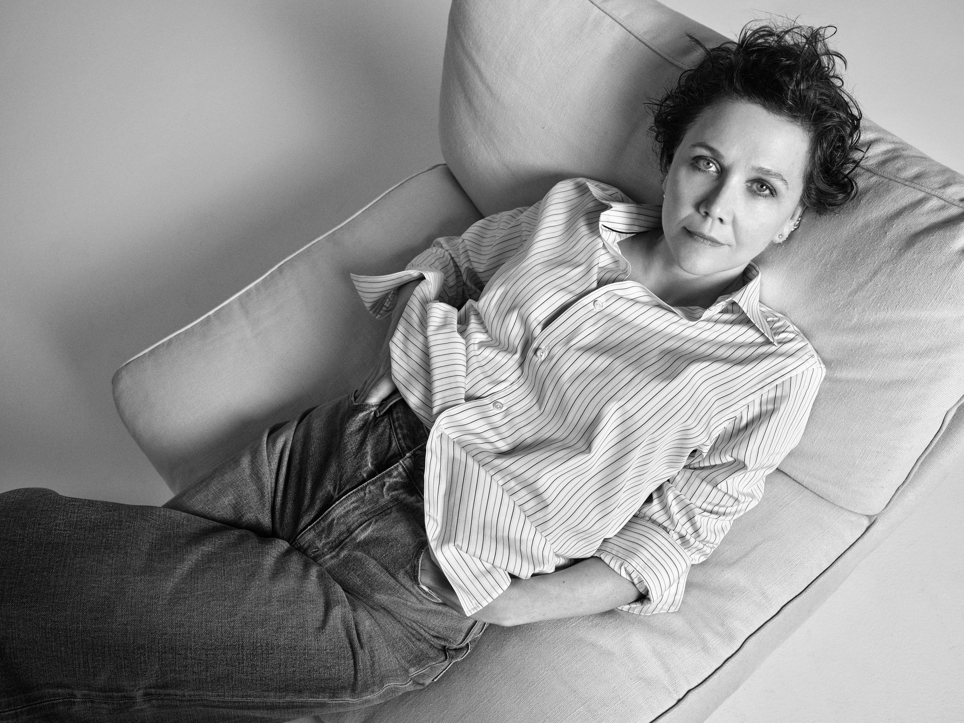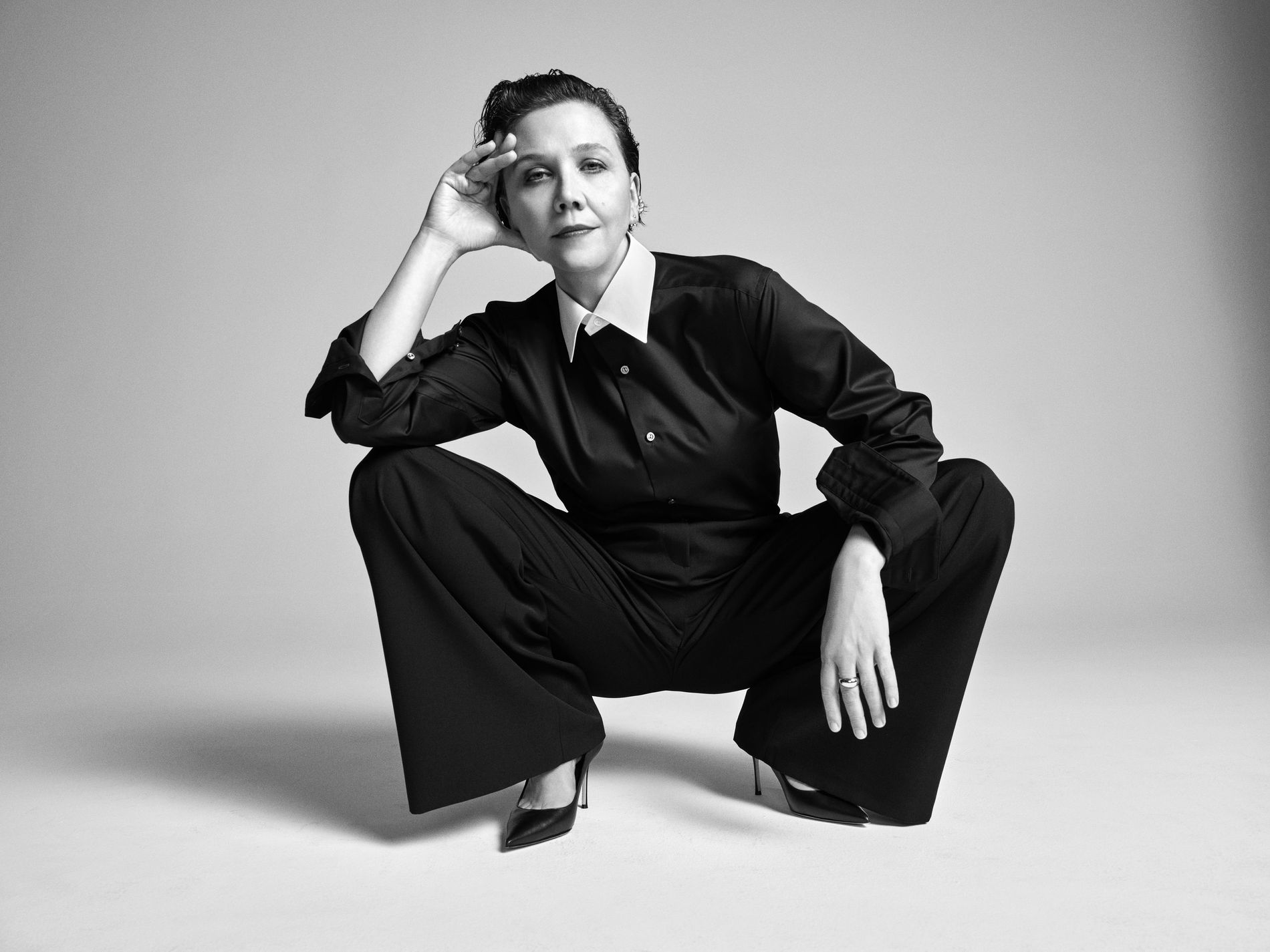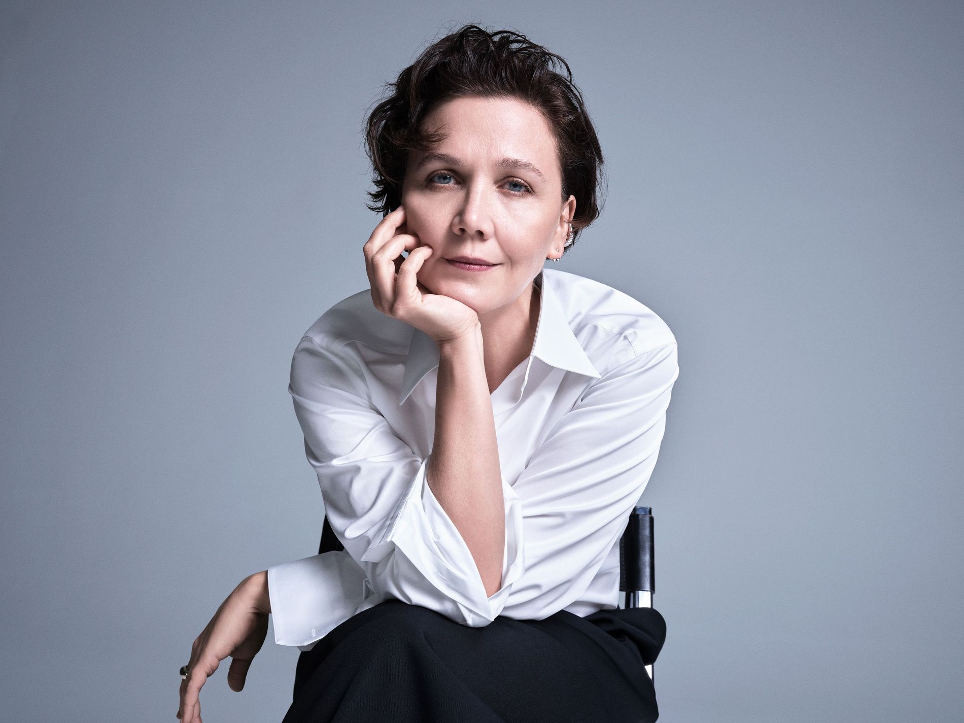 This is hardly the first time Gyllenhaal has dabbled in borrowed-from-the-boys tailoring. Not only is she partial to a suit on the red carpet, she’s also served indelible tailored looks on-screen, most notably in cult hit Secretary and as assistant DA Rachel Dawson in The Dark Knight. It’s no surprise, then, that Gyllenhaal has an opinion or two when it comes to the perfect dress shirt. “I like my shirts to be a bit oversized,” she says. “I also like when they’re soft enough, or thin enough in the fabric, that you can still see your body underneath or at least feel your body underneath the shirt.”