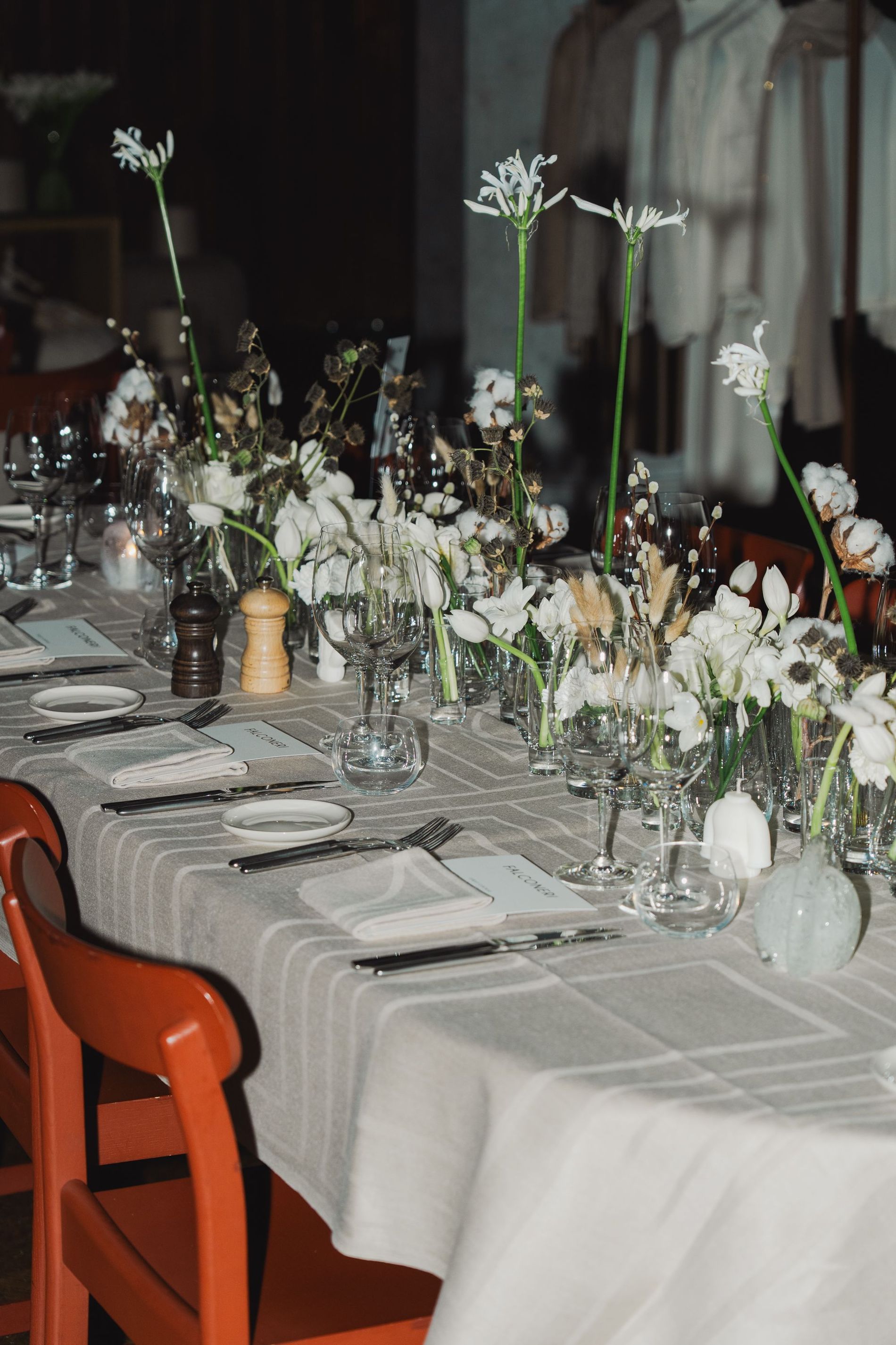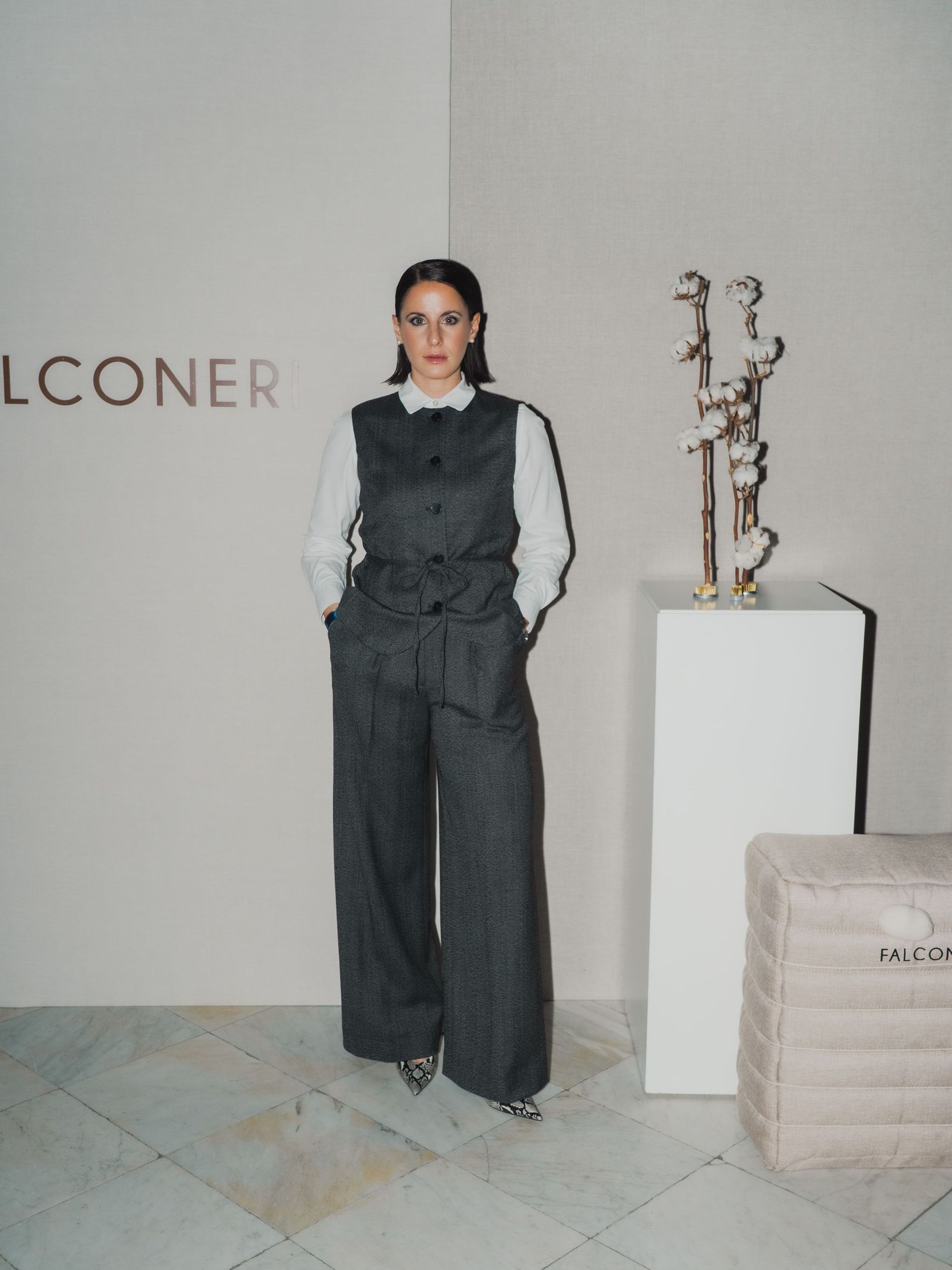 Throughout the night every detail was a reflection of Falconeri’s refined aesthetic and authenticity. Guests gathered in the stunning atrium, where they sipped champagne as the notes of a live cellist echoed across the marble walls. When it came time to move towards the dining room, they passed through the story of the brand – experiencing the elevated raw materials that ultimately become the very clothes worn at the event.