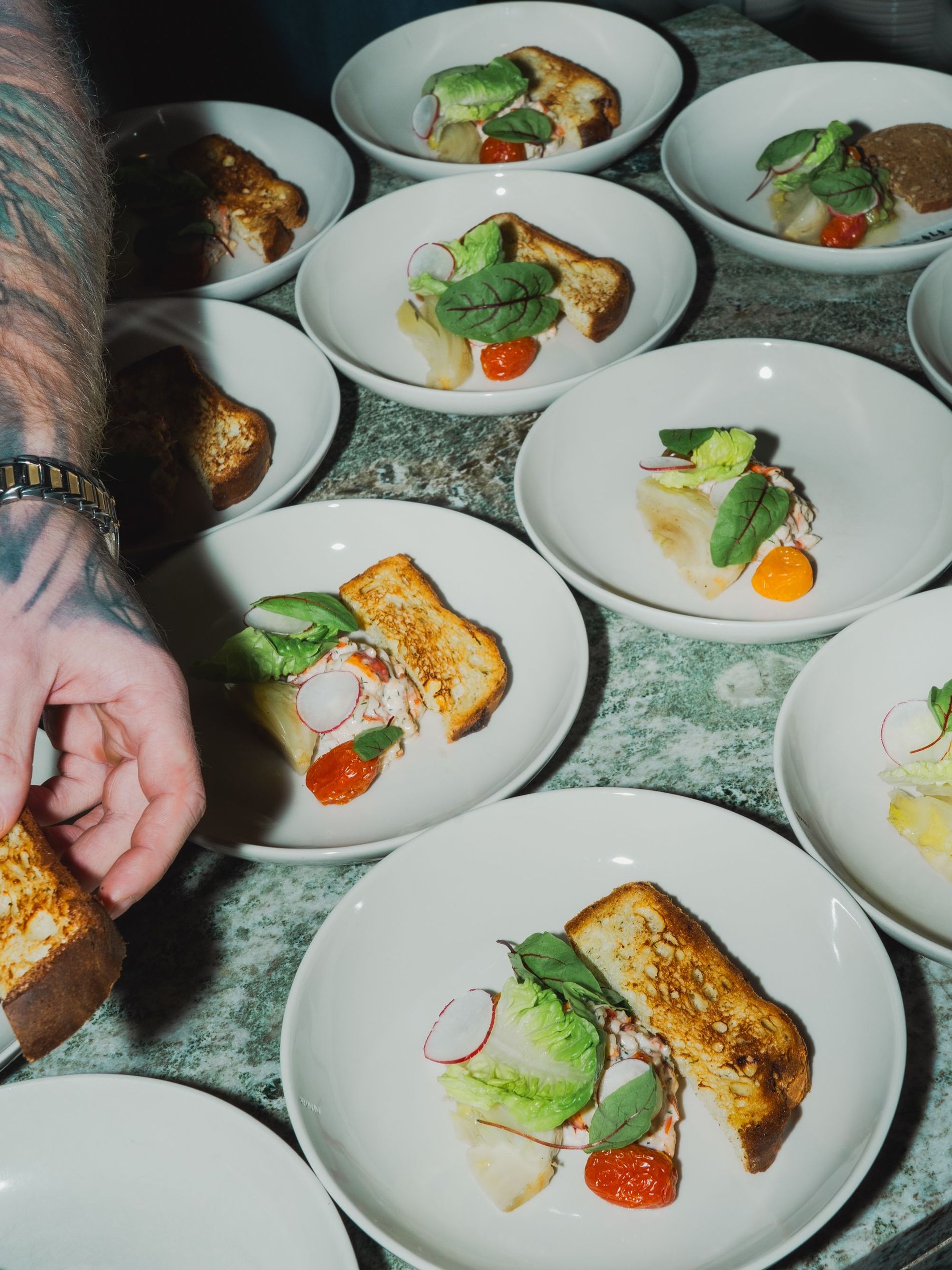 In the dining room, tables were tastefully set with deconstructed flower arrangements, including, most notably, cotton. The meal itself was, like the garments that dotted the room, an exercise in exquisite ingredients: a take on classic Skagen with lobster and a rich confit duck leg main. Afterwards, guests decamped to the adjacent room to indulge in a decadent dessert buffet. It was the sort of night one didn’t want to end, and in fact, all guests remained, rapt in conversation when the lights flickered on.