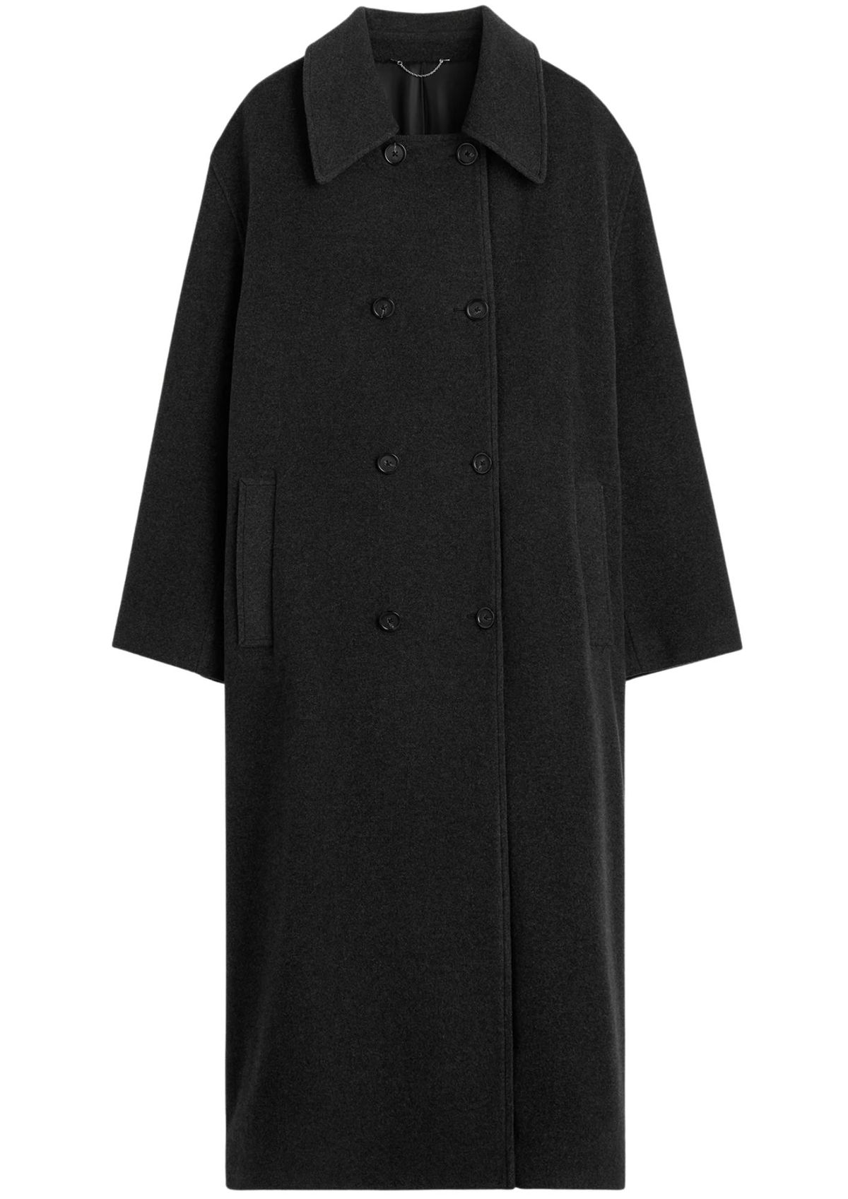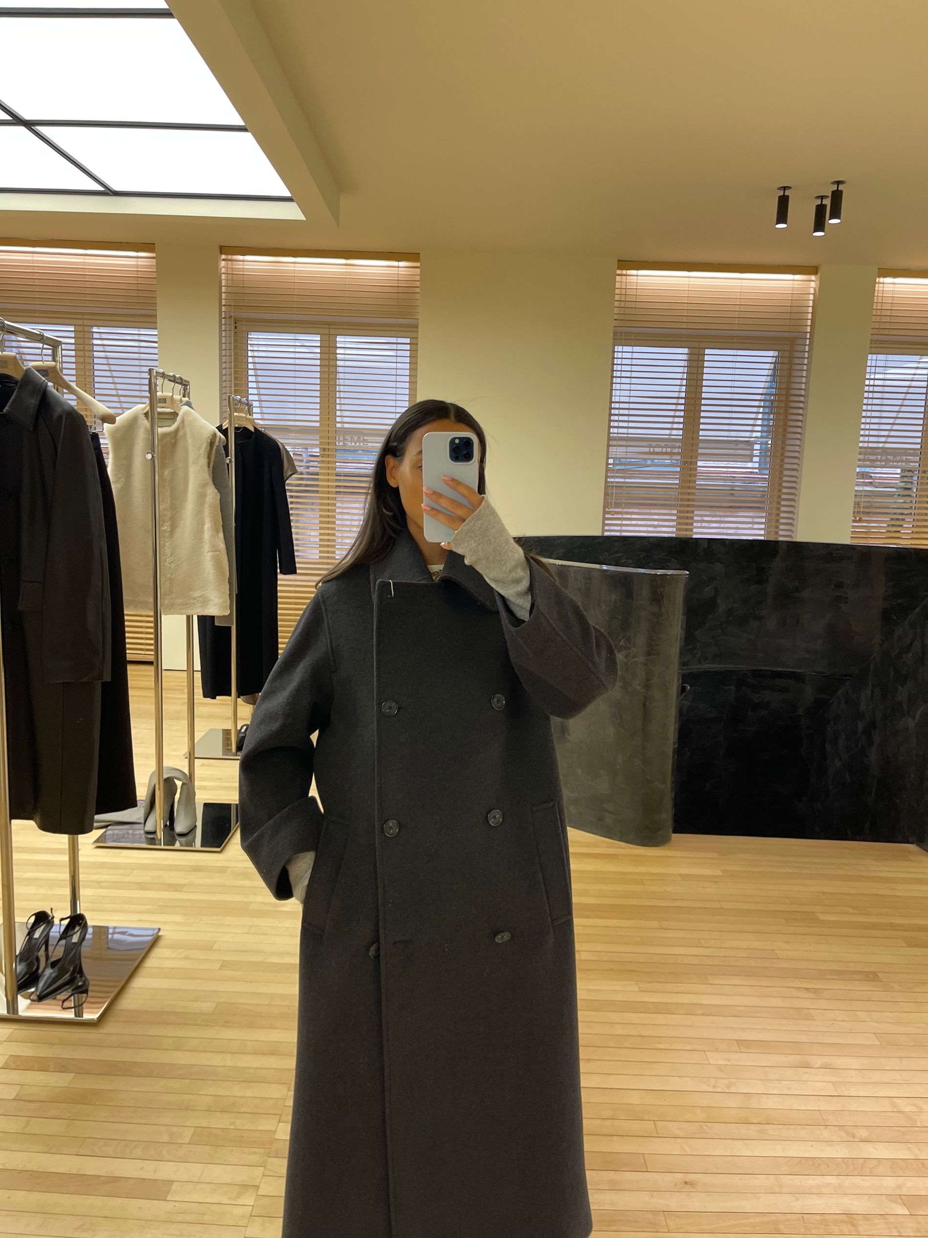 At first glance: I was instantly taken with this oversized grey wool coat. Cut floor-length and double-breasted, it has a beautifully structured silhouette and a wool-blend fabrication that feels unexpectedly plush. It carries a weight and presence that set it apart from your standard winter coat.