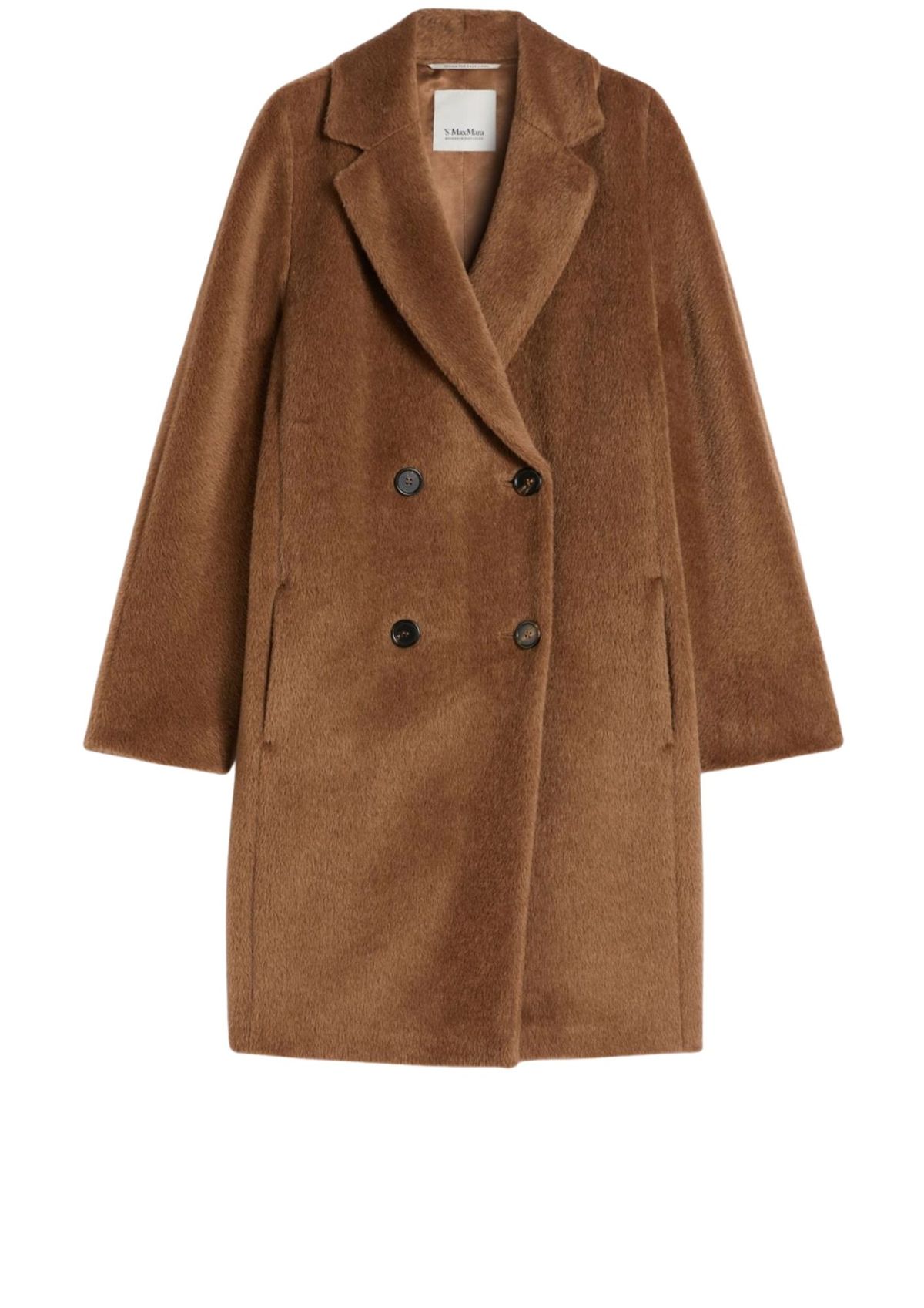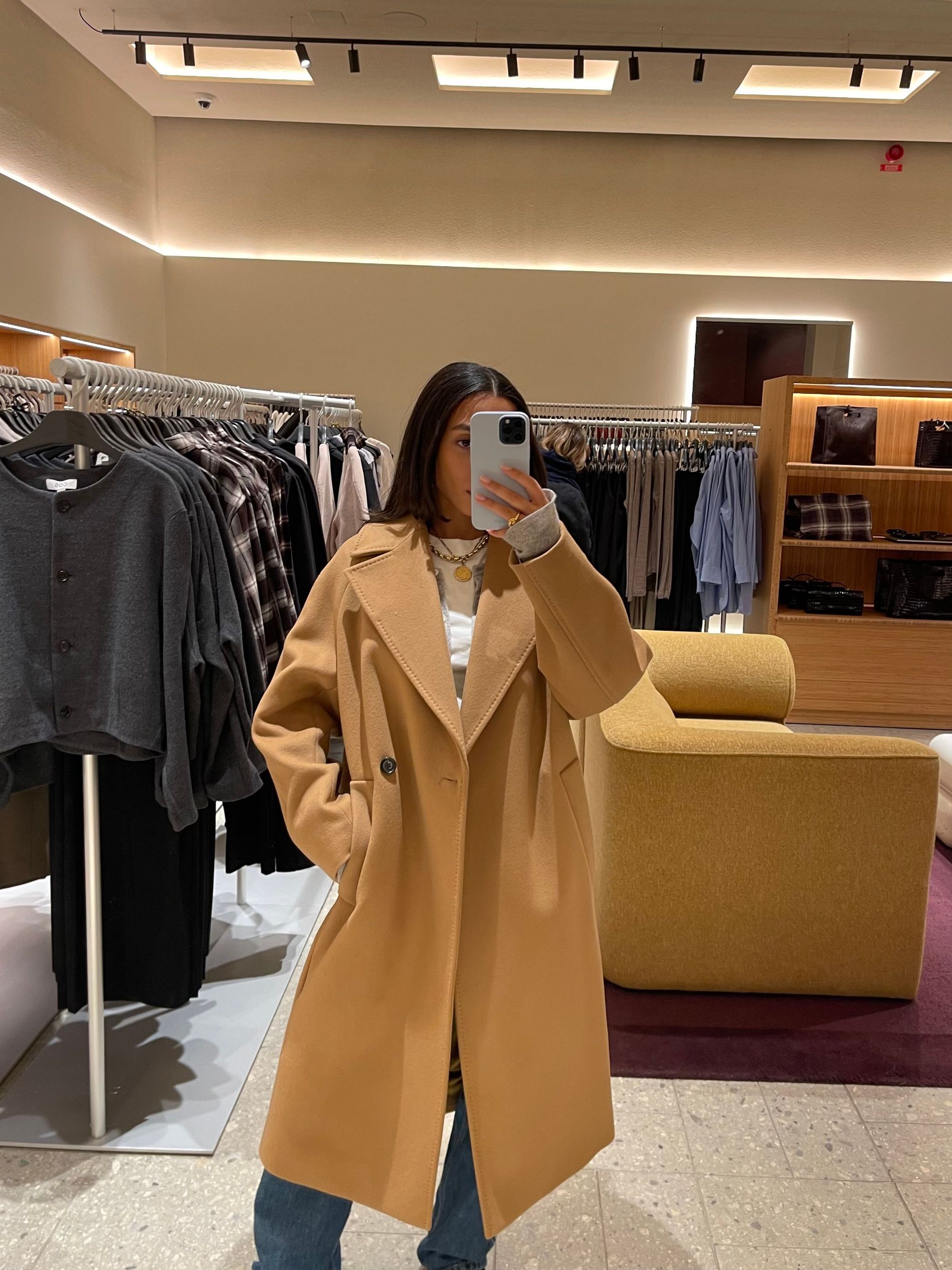At first glance: This midi coat has a lovely colour and texture with a classic double-row closure. The coat is made of wool and alpaca which creates a very fluffy feel. This coat is more fitted than the other options that I tried from Max Mara, but it still has a rather straight silhoutte that allows for some extra space for movement and a thick jumper underneath.
