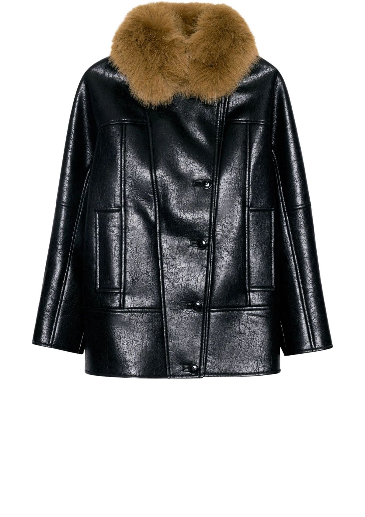 At first glance: A glossy, straight coat with and oversized fit. It's a well-structured, creating a flattering silhouette, while the faux-fur collar adds a playful contrast.