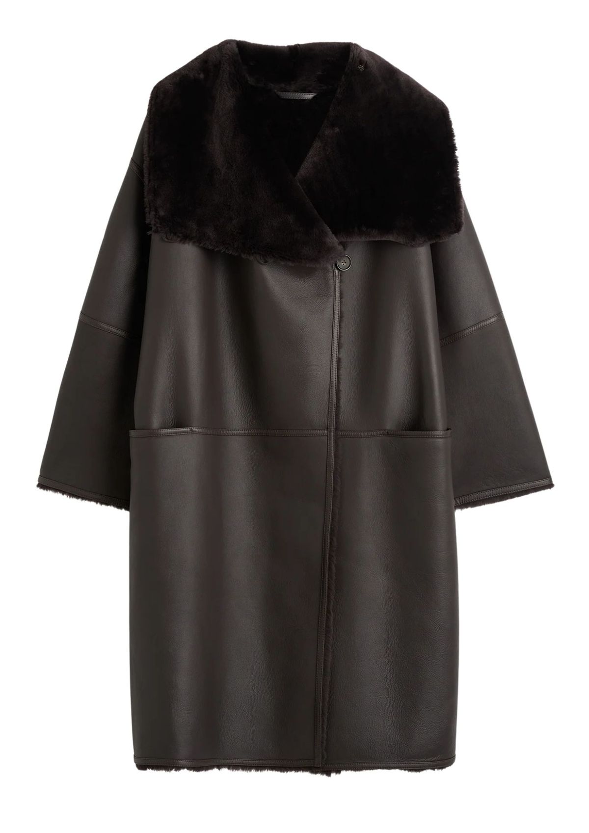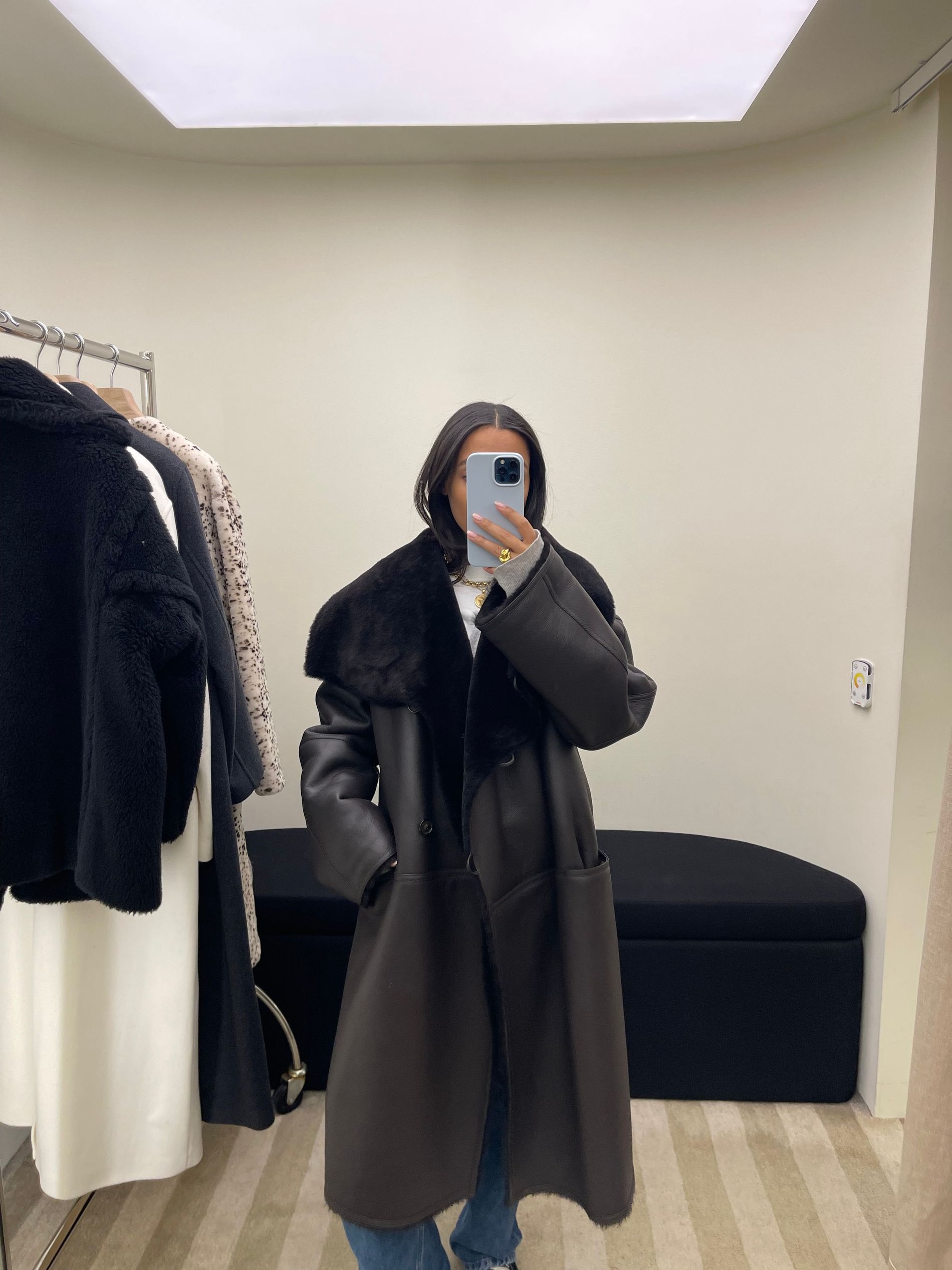 At first glance: What first drew me to this jacket is its rich chocolate brown colour. This wrap coat has a warm shearling interior and a smooth leather exterior, creating perfectly balanced coat. Similarly to the other coats it has a oversized fit, but this jacket is particularly slouchy (which I absolutly love).