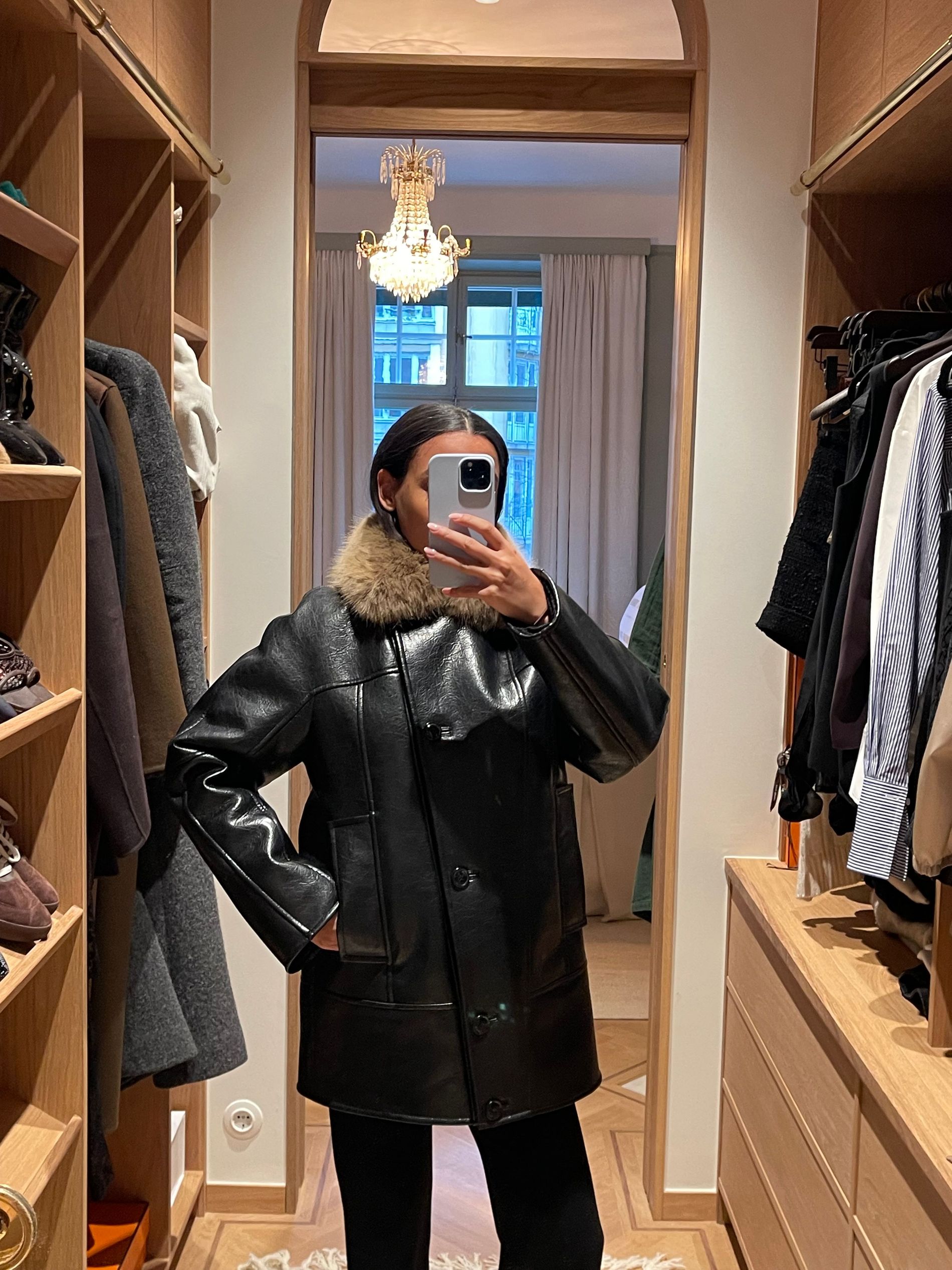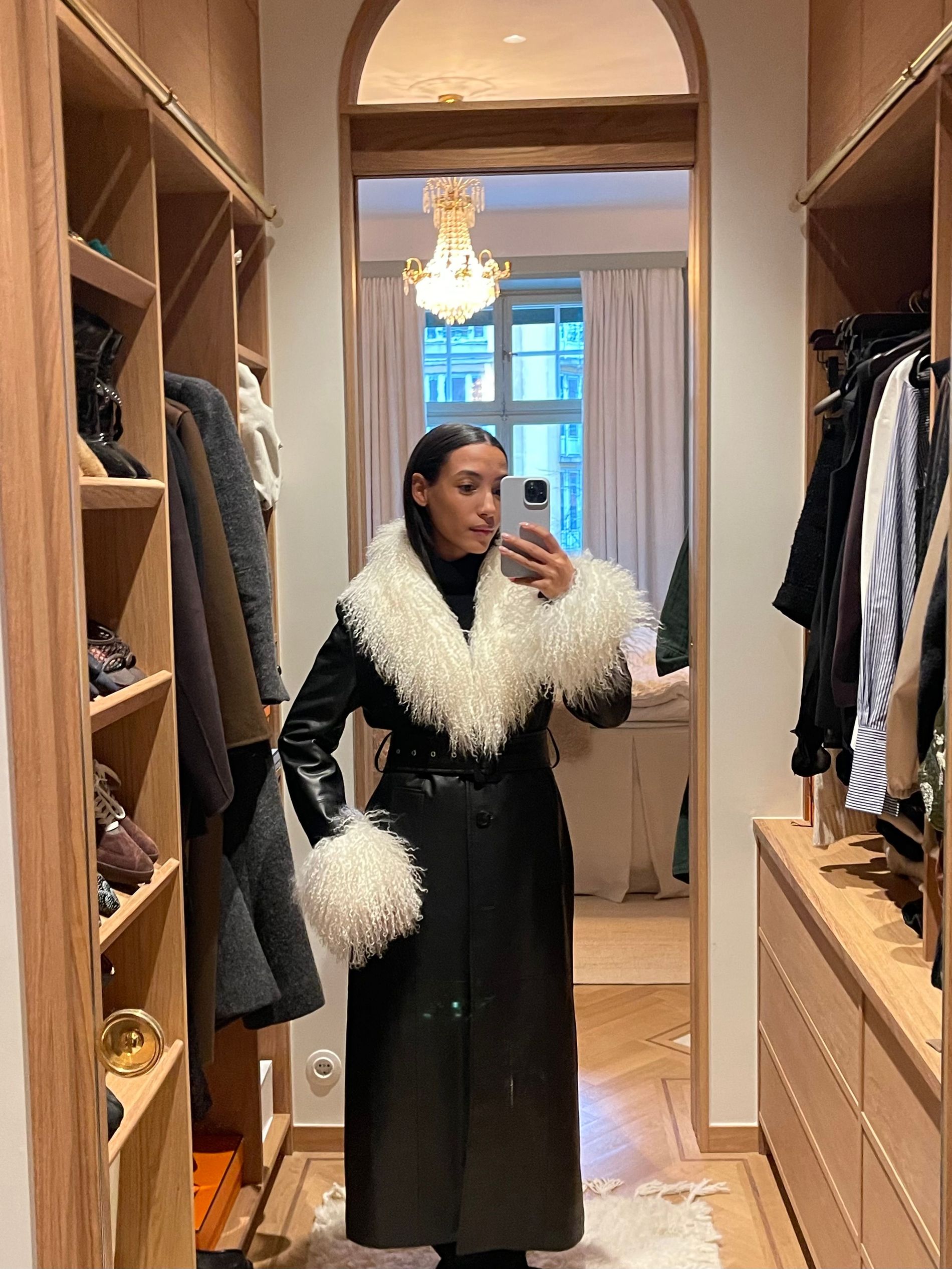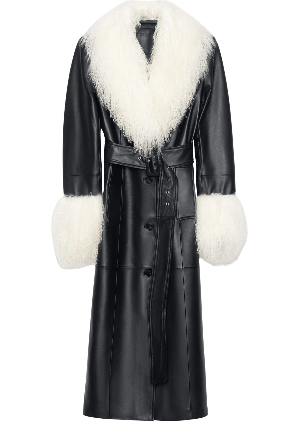 At first glance: Stand Studio's Monica coat really surprised me, and easily ranks among my top five pieces from this edit. The soft, glossy black leather contrasts beautifully with the fluffy white fur on the collar and cuffs, and the belted waist creates a very flattering, tailored silhouette