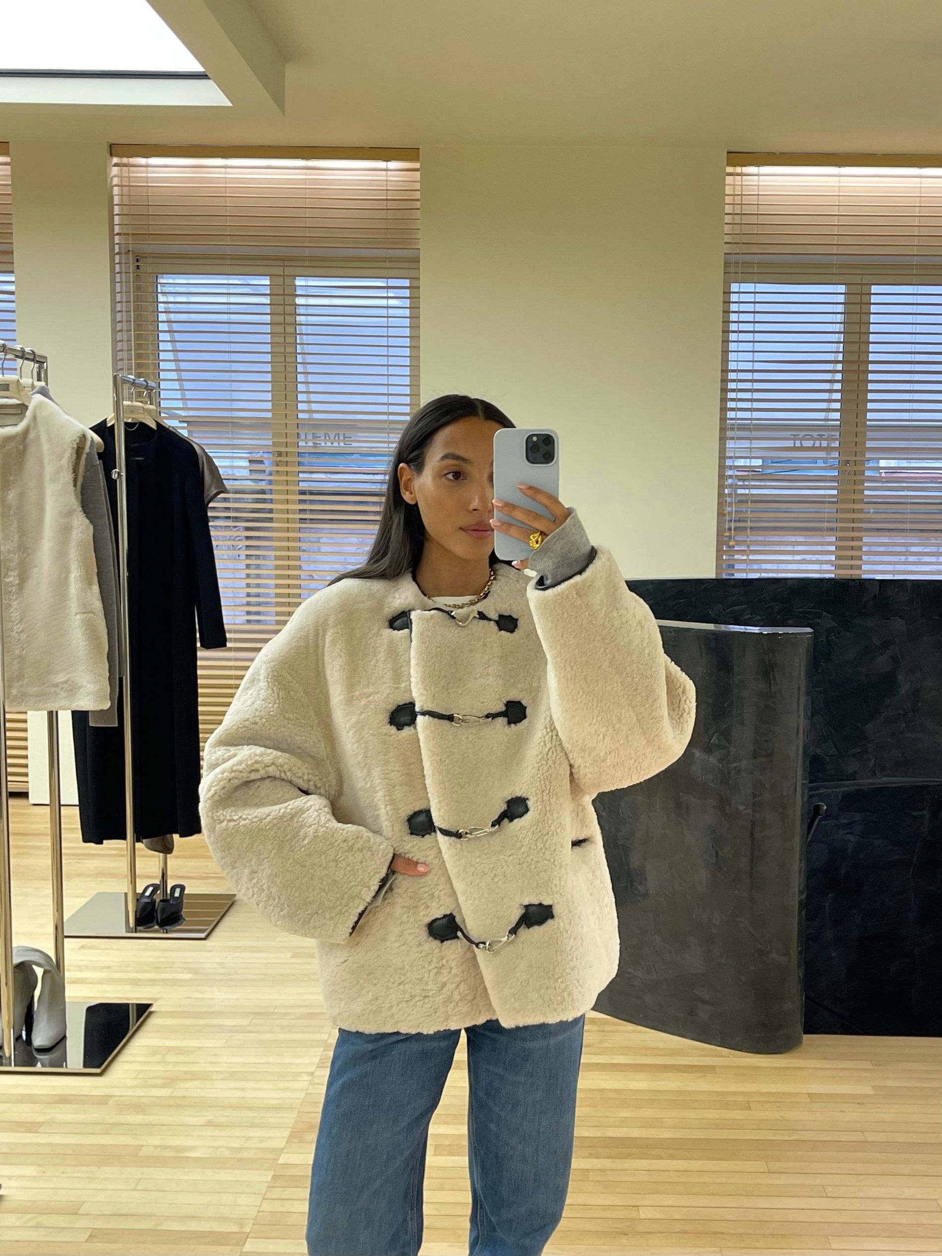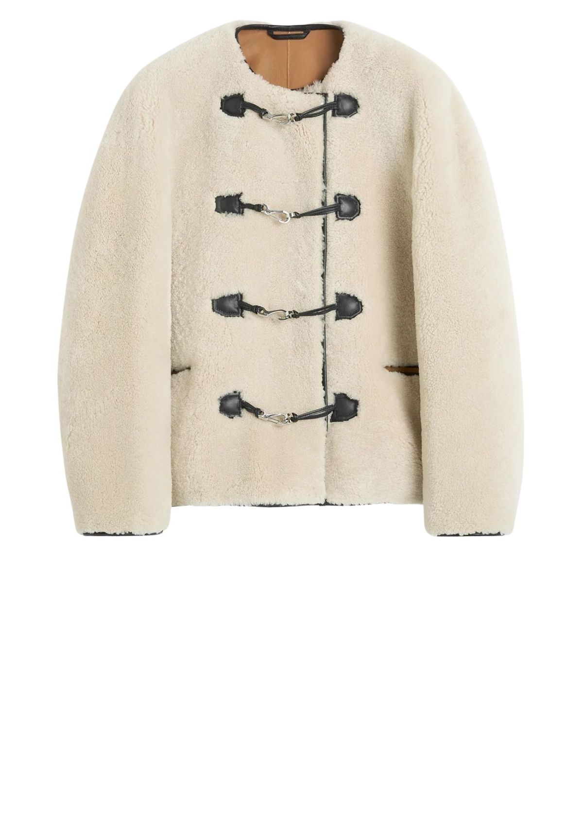 At first glance: The Teddy Shearling jacket may sit just outside the traditional coat category, but it more than earns its place here. Toteme’s laid-back, ultra-cosy design fastens with sculptural metal clasps – a considered detail that punctuates the jacket’s soft, cloud-like shearling and quietly elevates the entire silhouette.