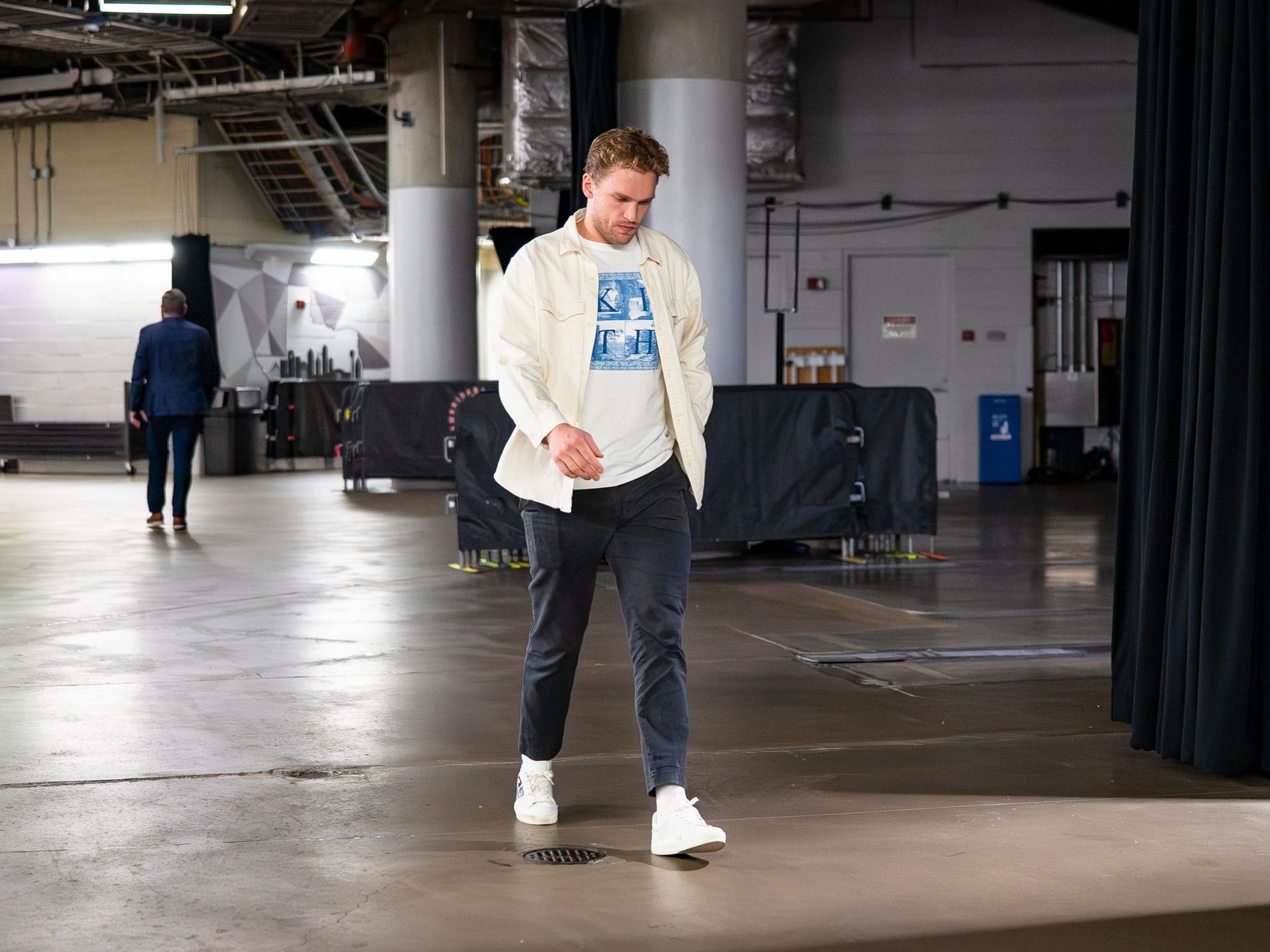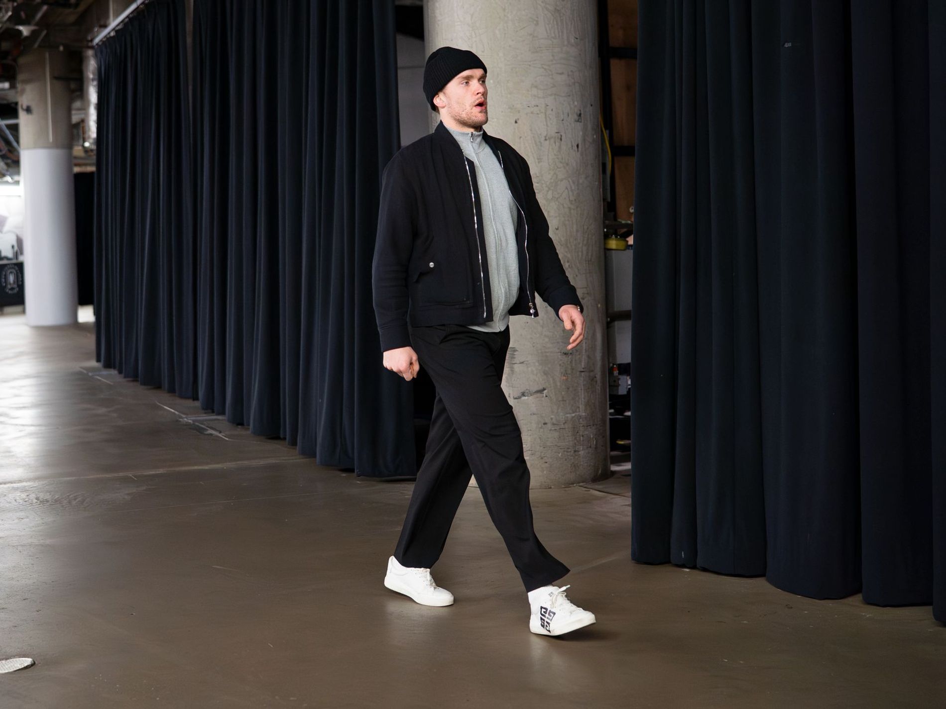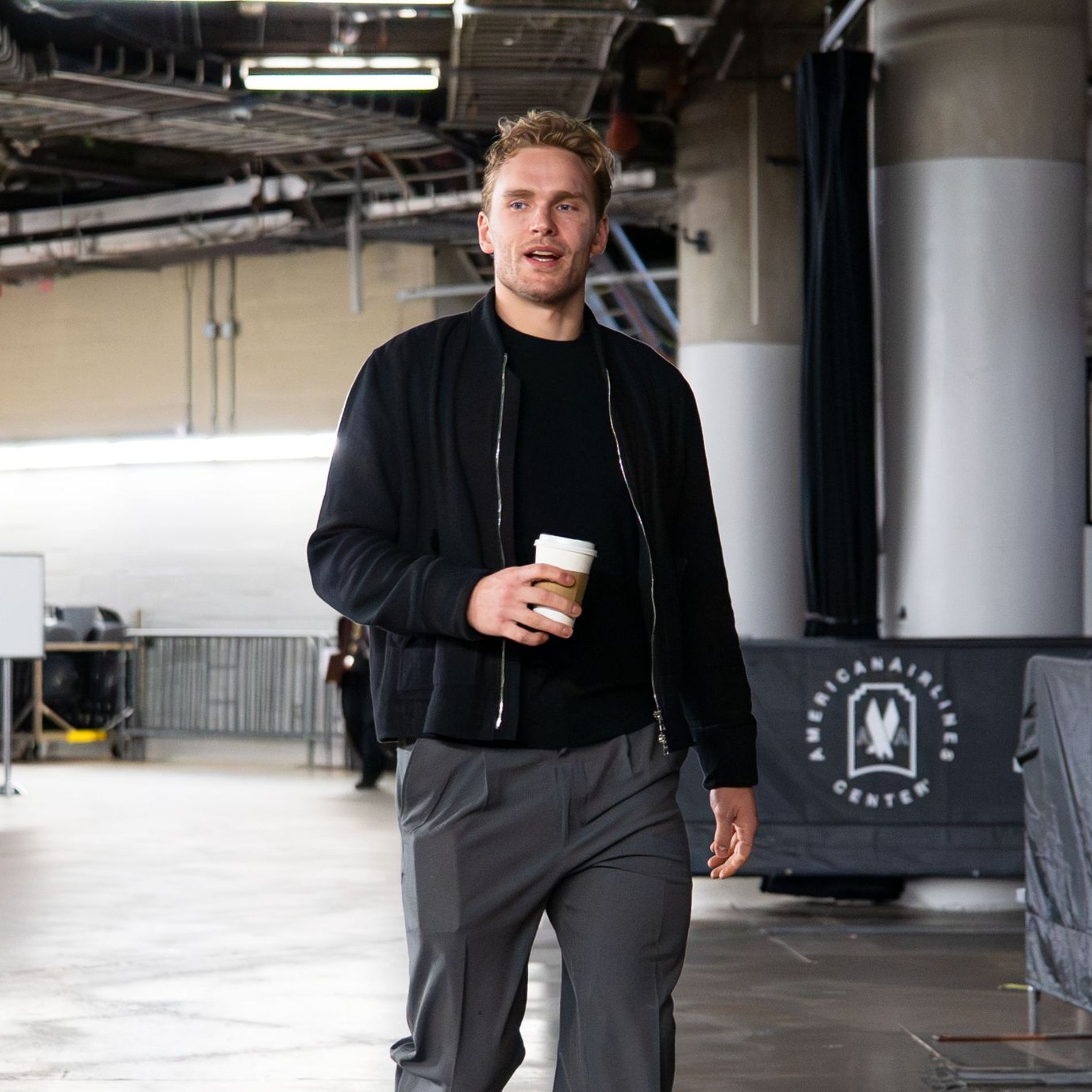 Mikko Rantanen walking into the arena – this year the NHL loosened its regulations, allowing players to wear street clothes rather than suits . Photo: Dallas Stars