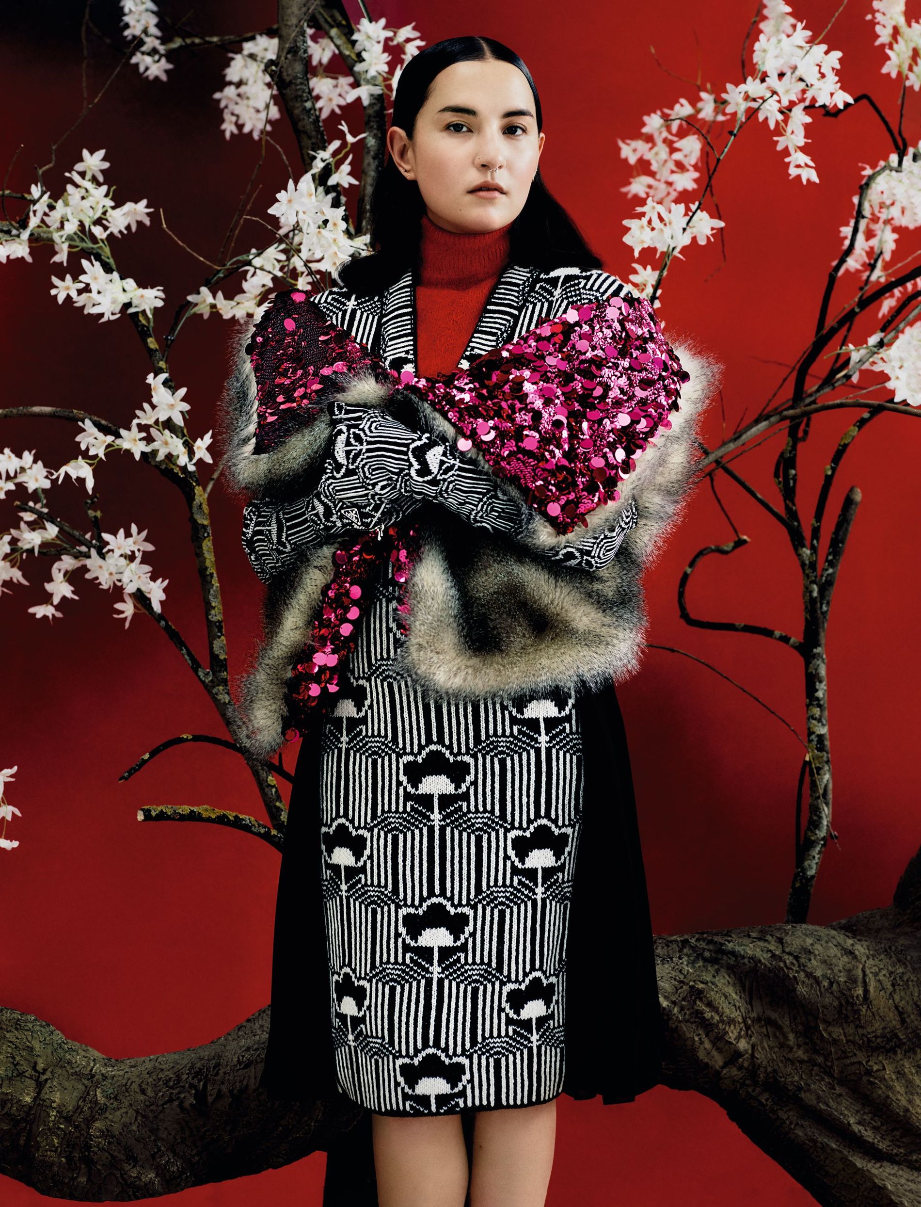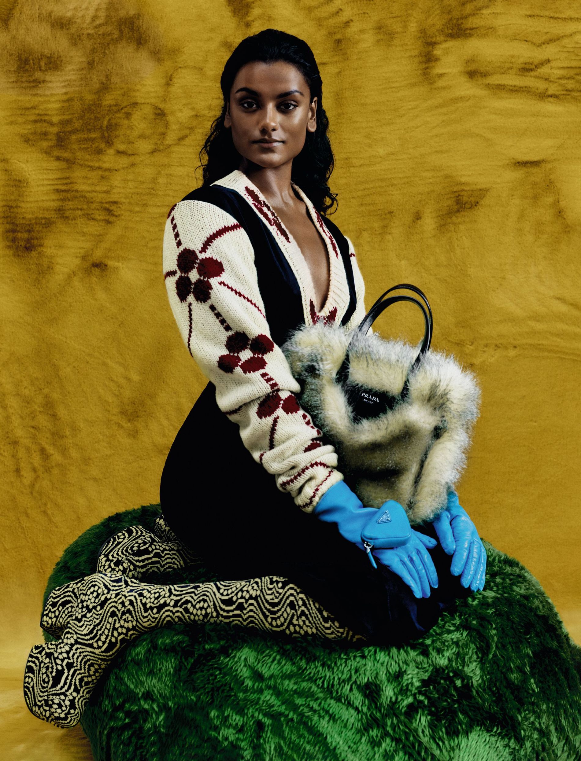 Sequined faux-fur stole, £3,300. Sleeveless jacquard and georgette dress, £2,100. Wool poloneck, £790. Wool opera gloves, £650 . Photo: Rafael Pavarotti