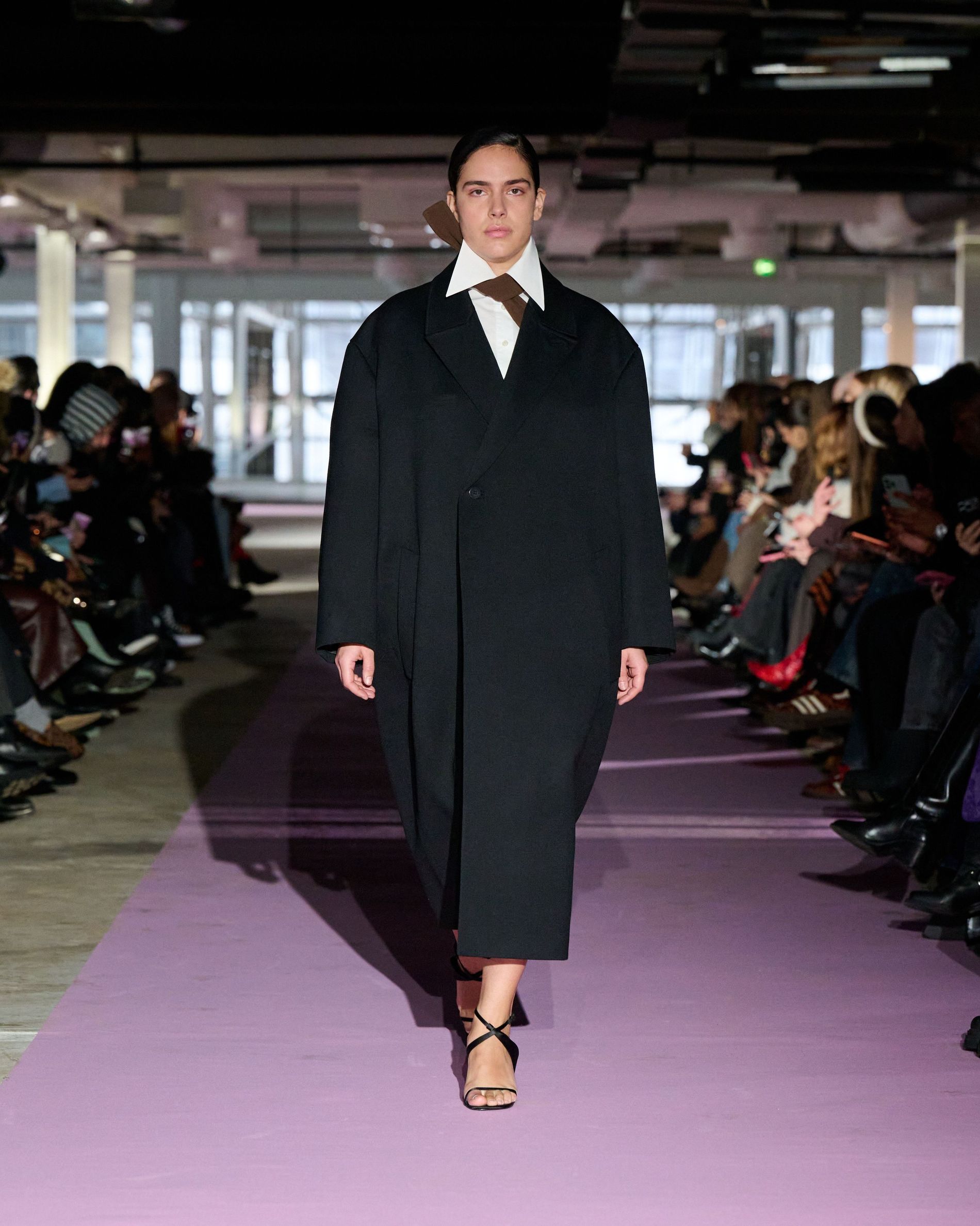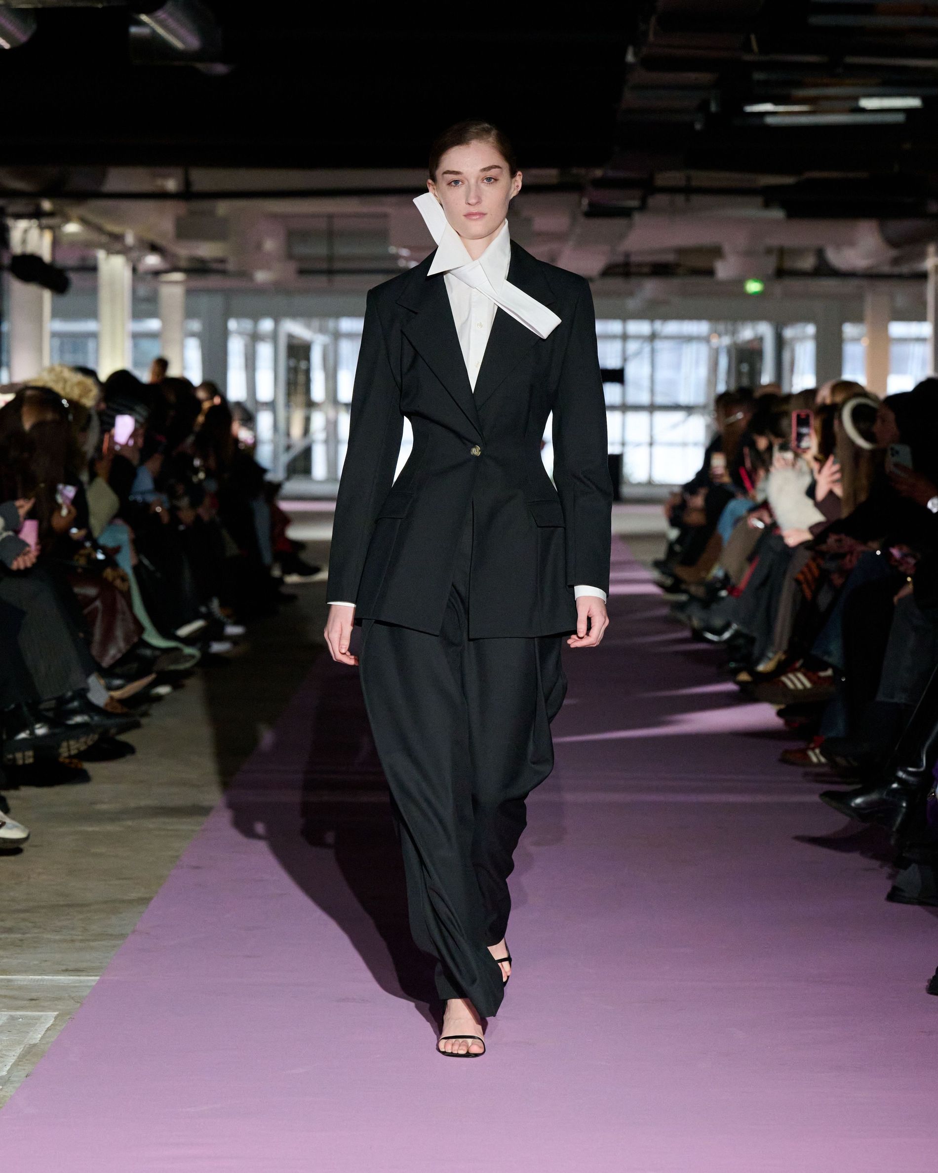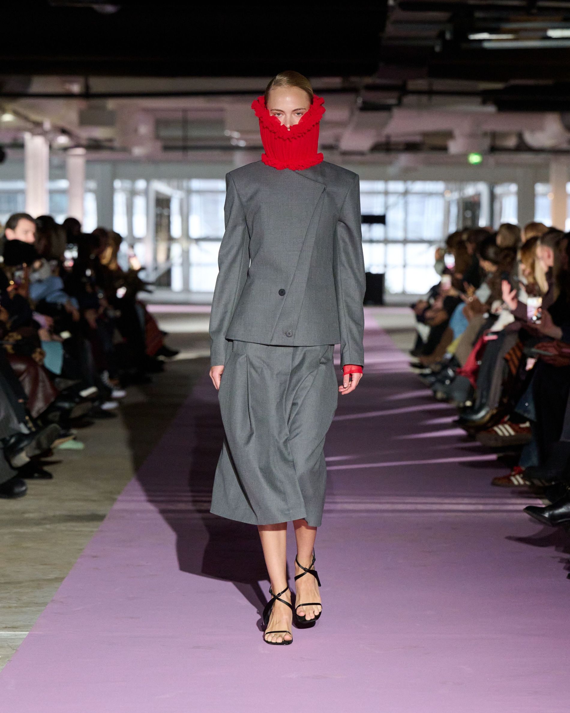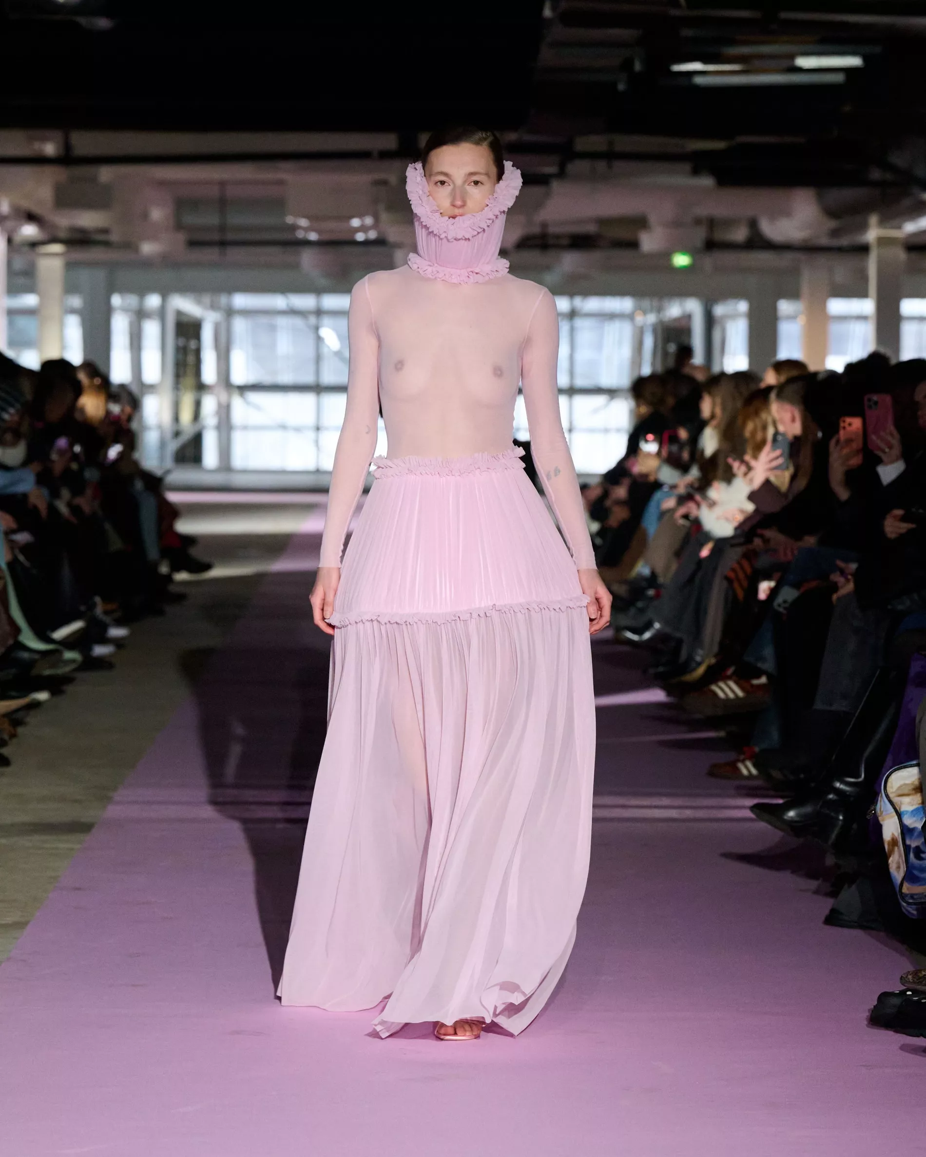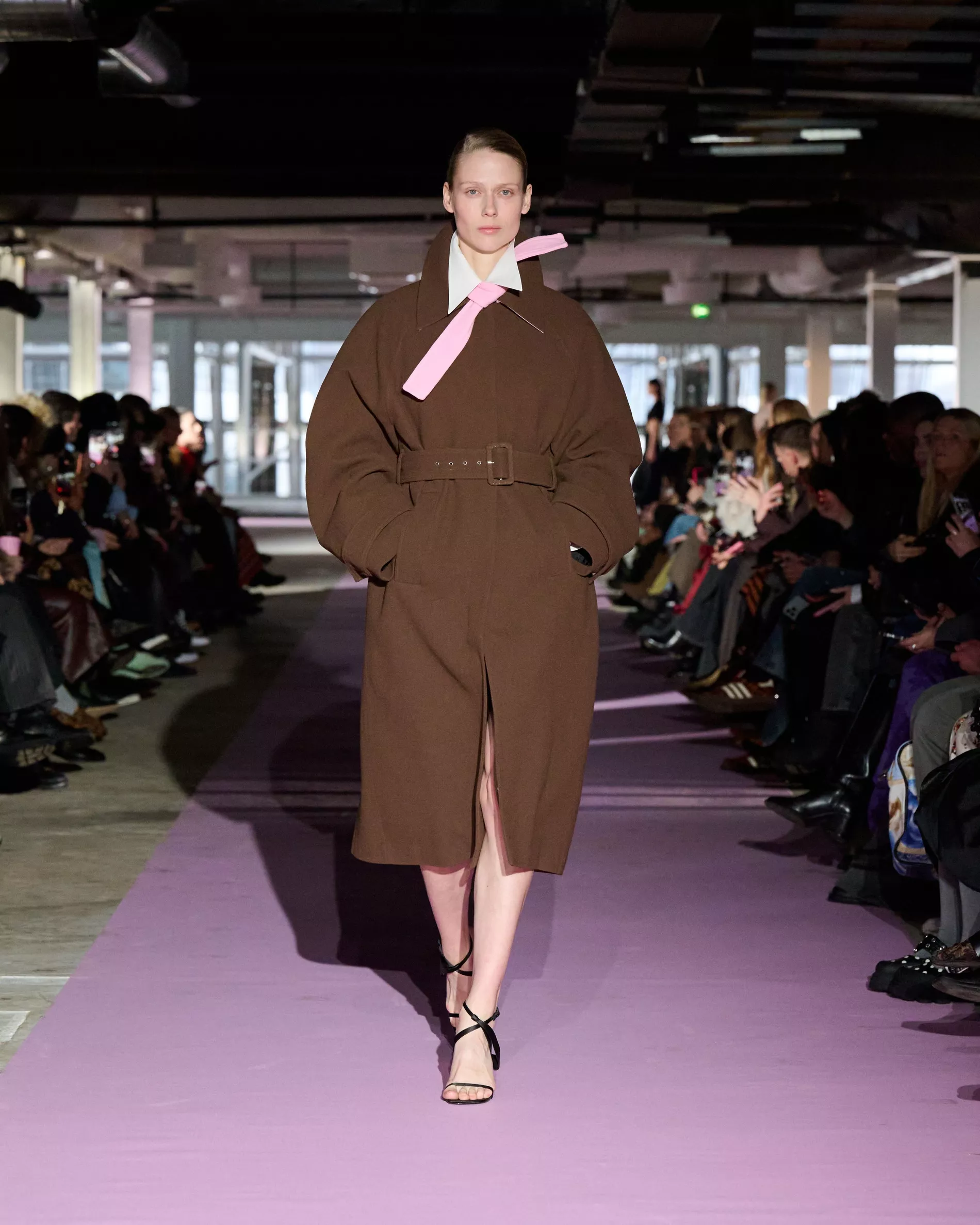 The reference to Kongshaug’s aunt isn’t literal. Rather, the collection offers an ode to her spirit – at once glamorous and effortless, perhaps a little mysterious. The show, which took place in a stark industrial space, found models strutting down a pale pink carpet in the sort of striking garments that pique immediate interest in the woman wearing them. A peplum gown for instance, rendered in the brand’s signature sheer mesh in a hue that mirrors the runway features a daring raised ruffled collar – a “who is she?” moment if there ever was one (the collar reappears several times throughout the collection, including on the razor sharp grey tailored skirt suit that opened the show). Subtler pieces, too, like the chocolate brown trench in luxurious double face crepe with a contrasting pink collar and a single-button twill suit, the waist nipped just so, similarly tell a story beyond their immediate visual impact.