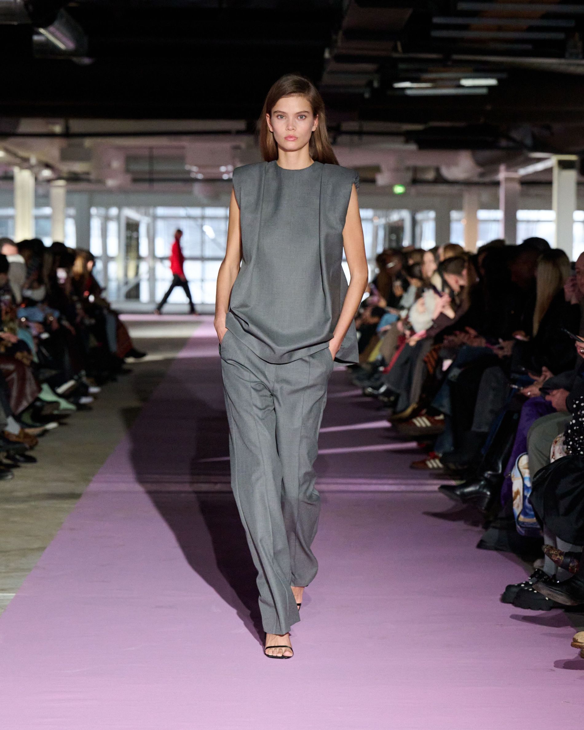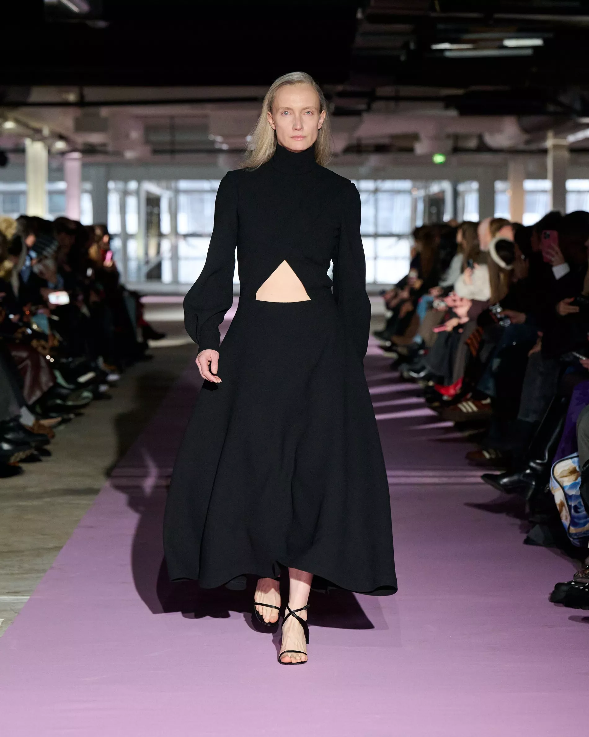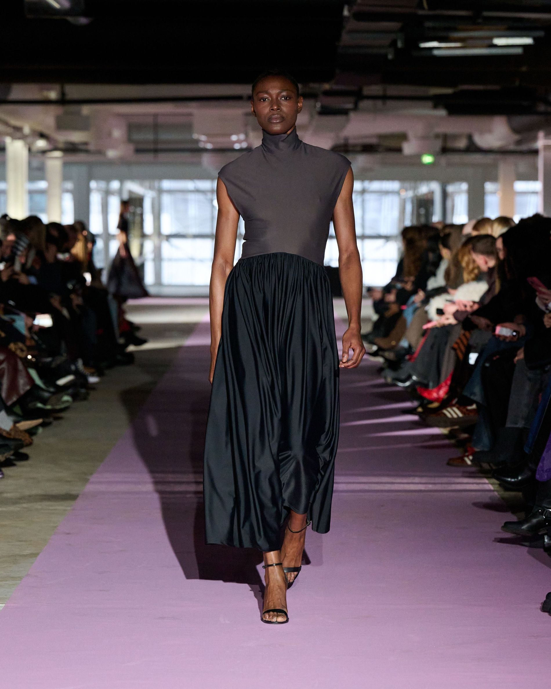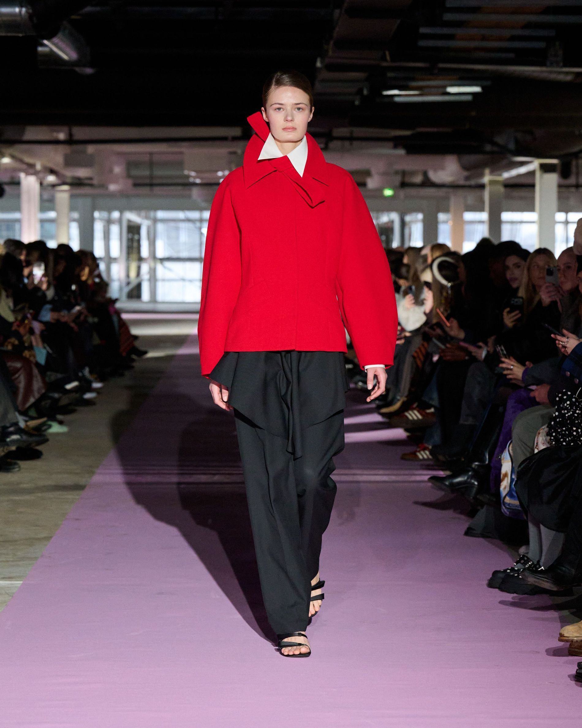 The reference to Kongshaug’s aunt isn’t literal. Rather, the collection offers an ode to her spirit – at once glamorous and effortless, perhaps a little mysterious. The show, which took place in a stark industrial space, found models strutting down a pale pink carpet in the sort of striking garments that pique immediate interest in the woman wearing them. A peplum gown for instance, rendered in the brand’s signature sheer mesh in a hue that mirrors the runway features a daring raised ruffled collar – a “who is she?” moment if there ever was one (the collar reappears several times throughout the collection, including on the razor sharp grey tailored skirt suit that opened the show). Subtler pieces, too, like the chocolate brown trench in luxurious double face crepe with a contrasting pink collar and a single-button twill suit, the waist nipped just so, similarly tell a story beyond their immediate visual impact.