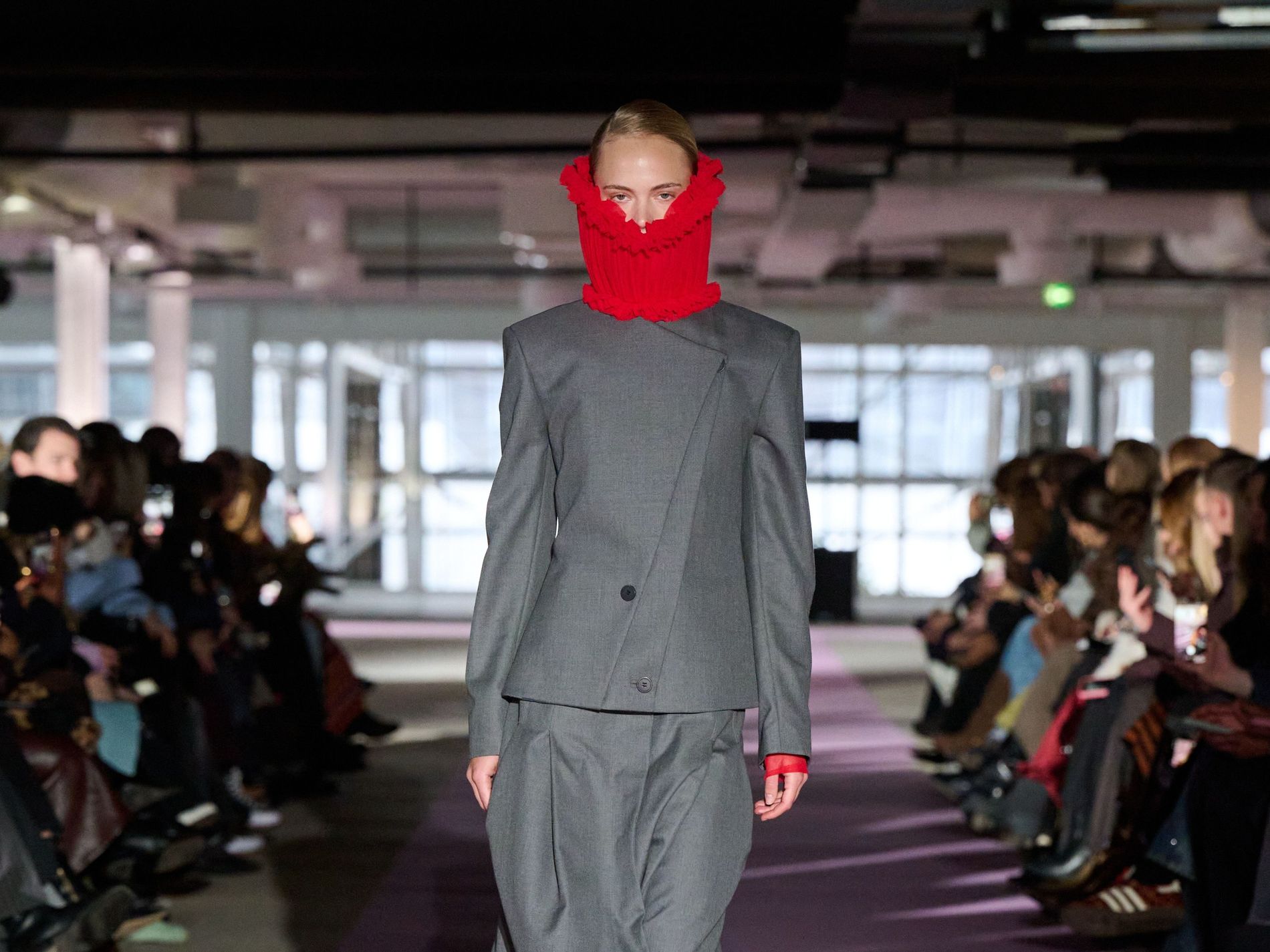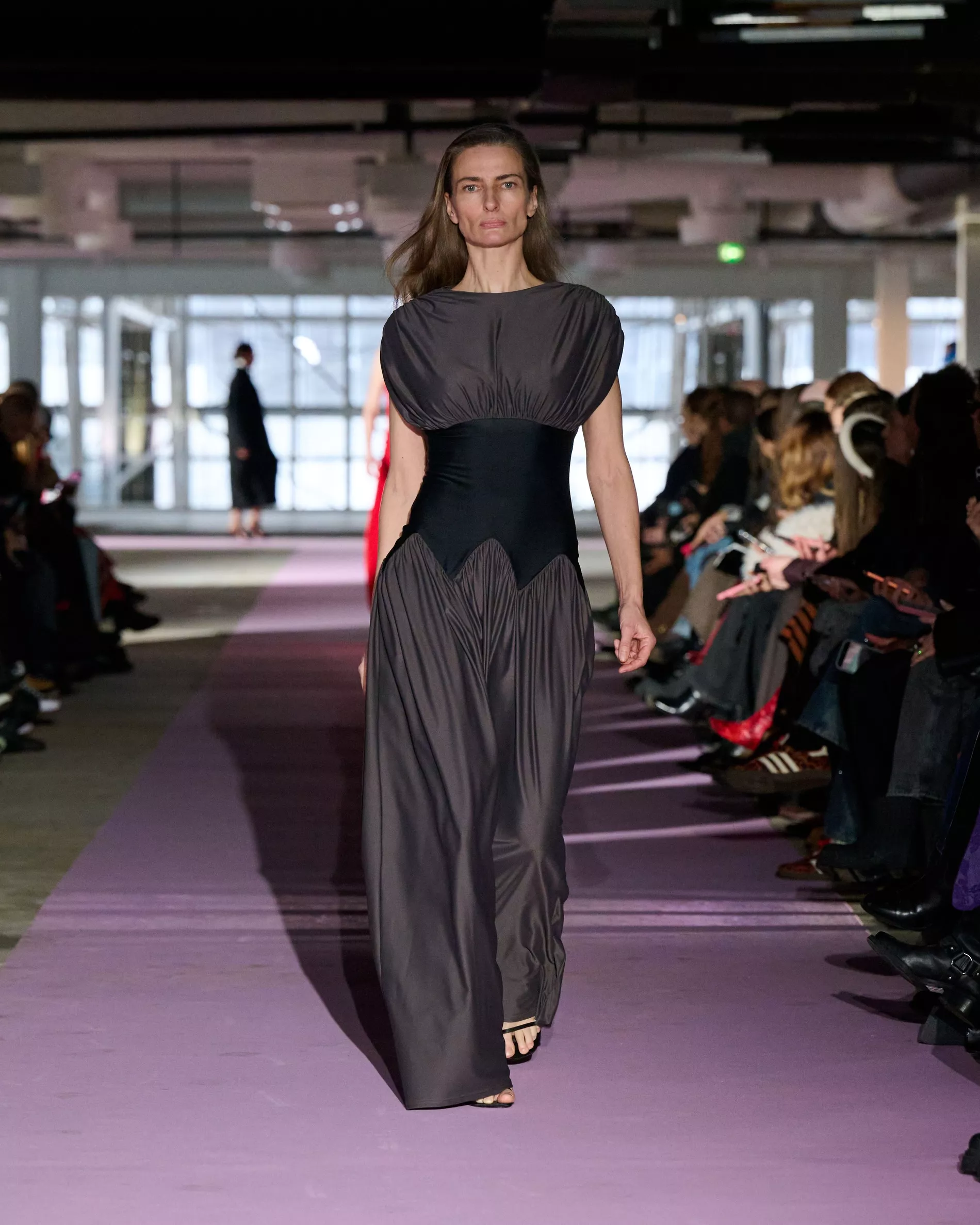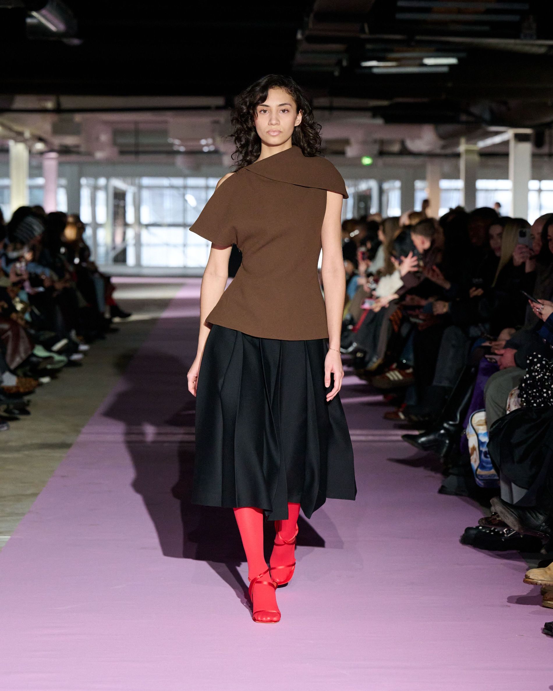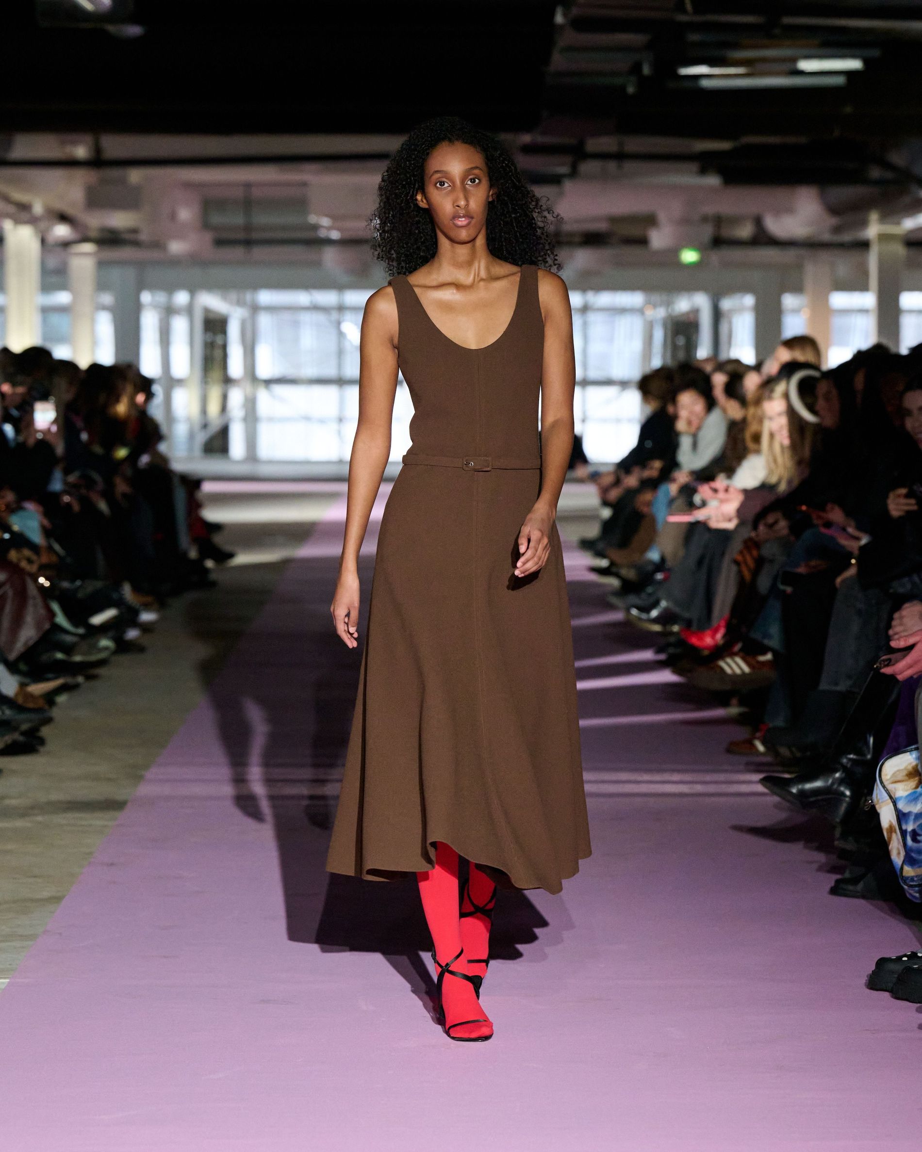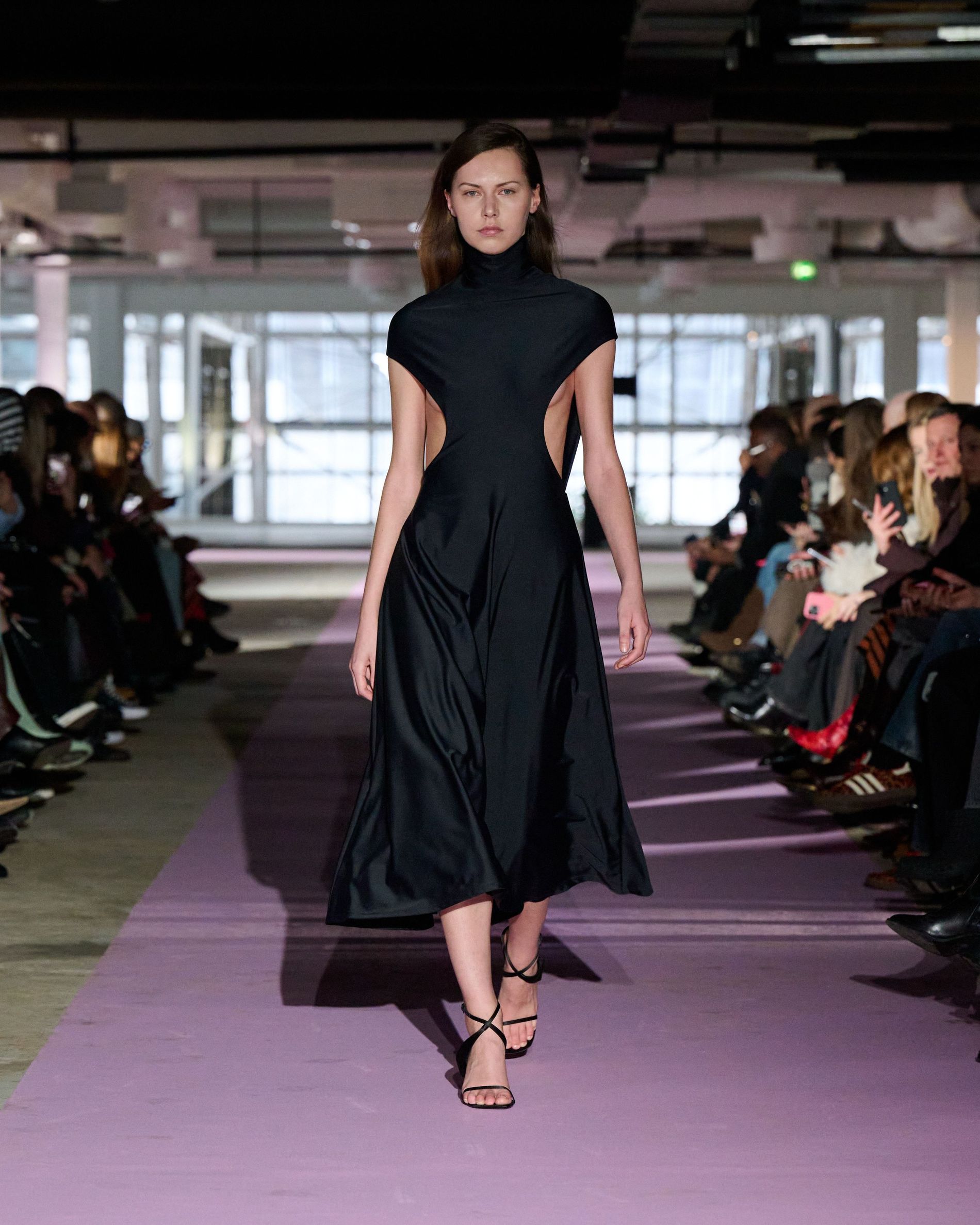 The reference to Kongshaug’s aunt isn’t literal. Rather, the collection offers an ode to her spirit – at once glamorous and effortless, perhaps a little mysterious. The show, which took place in a stark industrial space, found models strutting down a pale pink carpet in the sort of striking garments that pique immediate interest in the woman wearing them. A peplum gown for instance, rendered in the brand’s signature sheer mesh in a hue that mirrors the runway features a daring raised ruffled collar – a “who is she?” moment if there ever was one (the collar reappears several times throughout the collection, including on the razor sharp grey tailored skirt suit that opened the show). Subtler pieces, too, like the chocolate brown trench in luxurious double face crepe with a contrasting pink collar and a single-button twill suit, the waist nipped just so, similarly tell a story beyond their immediate visual impact.