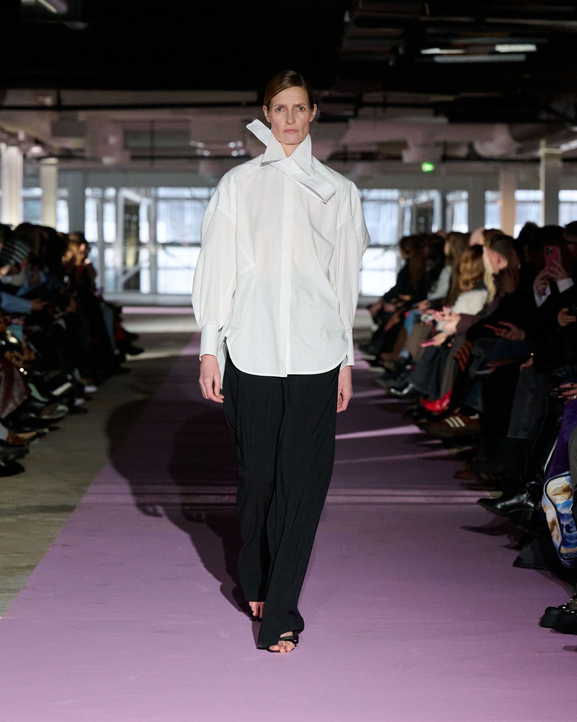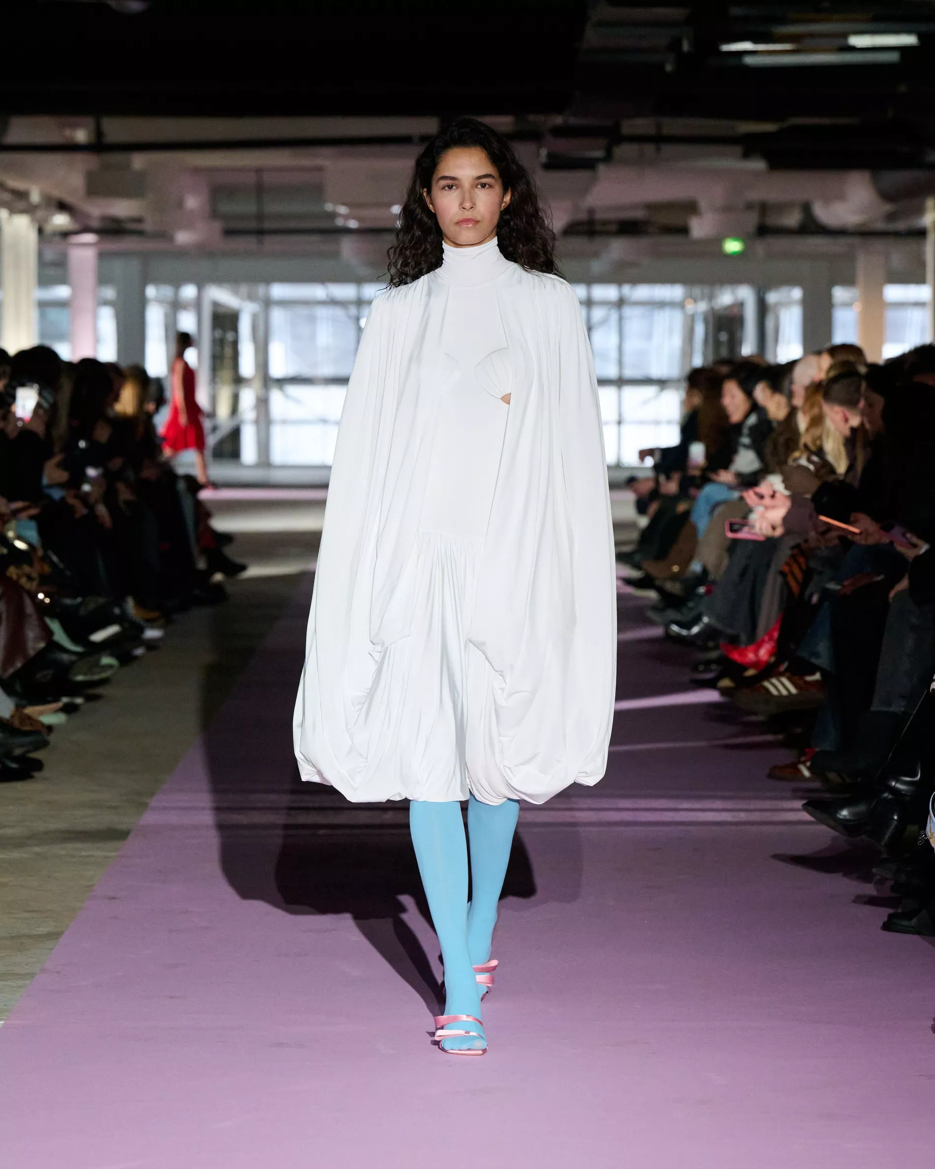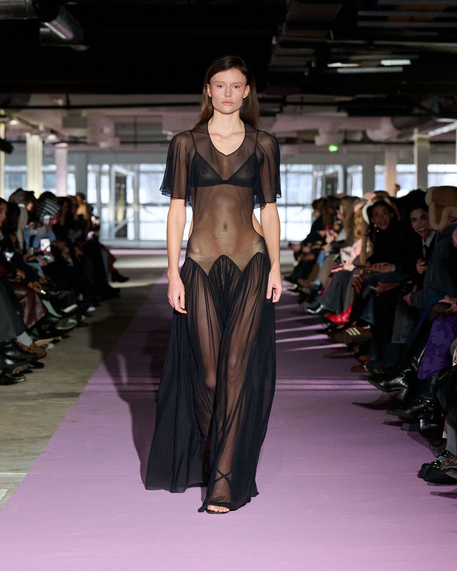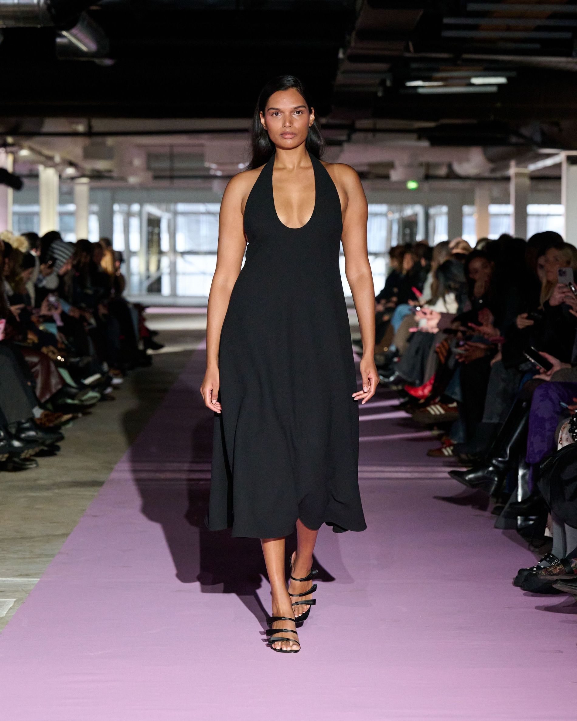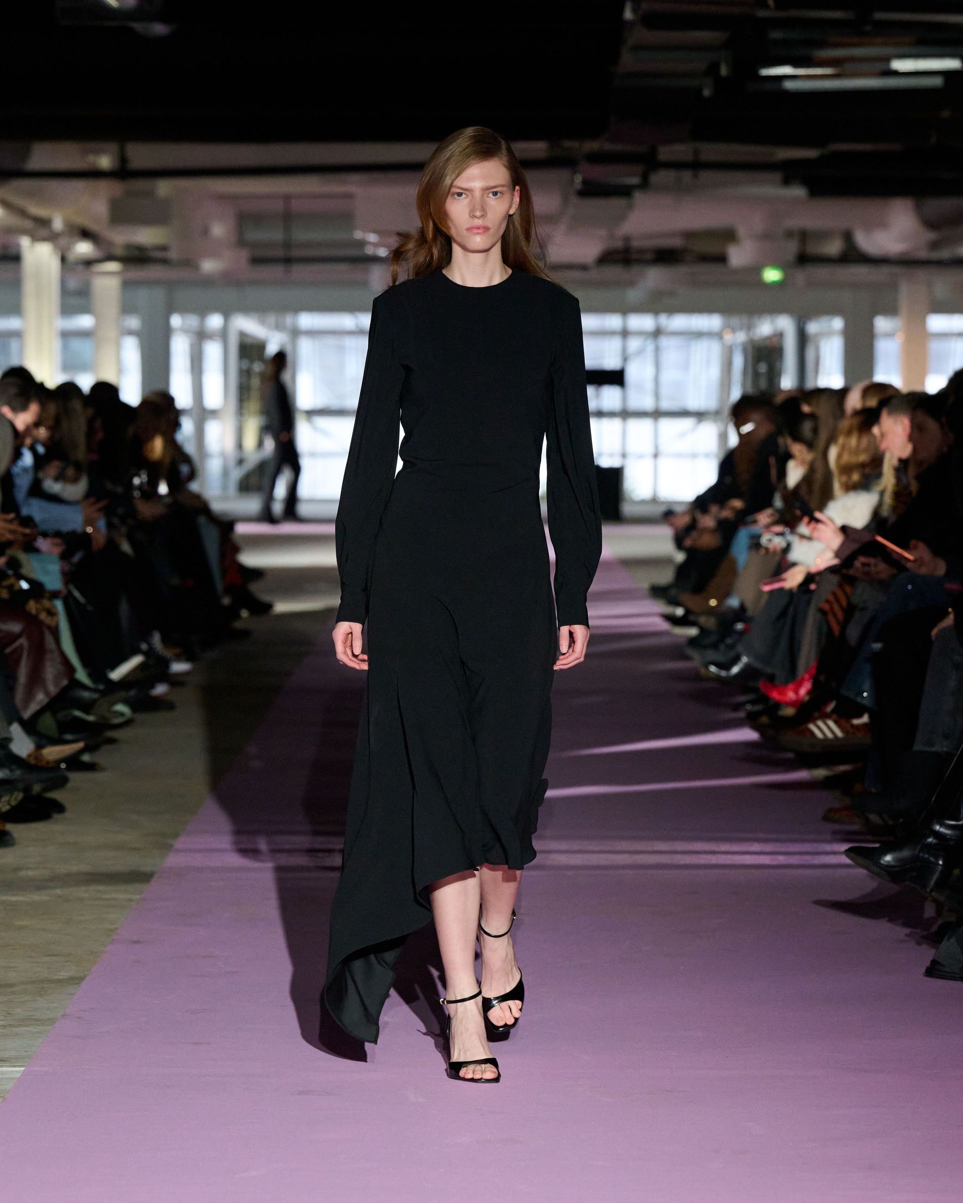 The reference to Kongshaug’s aunt isn’t literal. Rather, the collection offers an ode to her spirit – at once glamorous and effortless, perhaps a little mysterious. The show, which took place in a stark industrial space, found models strutting down a pale pink carpet in the sort of striking garments that pique immediate interest in the woman wearing them. A peplum gown for instance, rendered in the brand’s signature sheer mesh in a hue that mirrors the runway features a daring raised ruffled collar – a “who is she?” moment if there ever was one (the collar reappears several times throughout the collection, including on the razor sharp grey tailored skirt suit that opened the show). Subtler pieces, too, like the chocolate brown trench in luxurious double face crepe with a contrasting pink collar and a single-button twill suit, the waist nipped just so, similarly tell a story beyond their immediate visual impact.