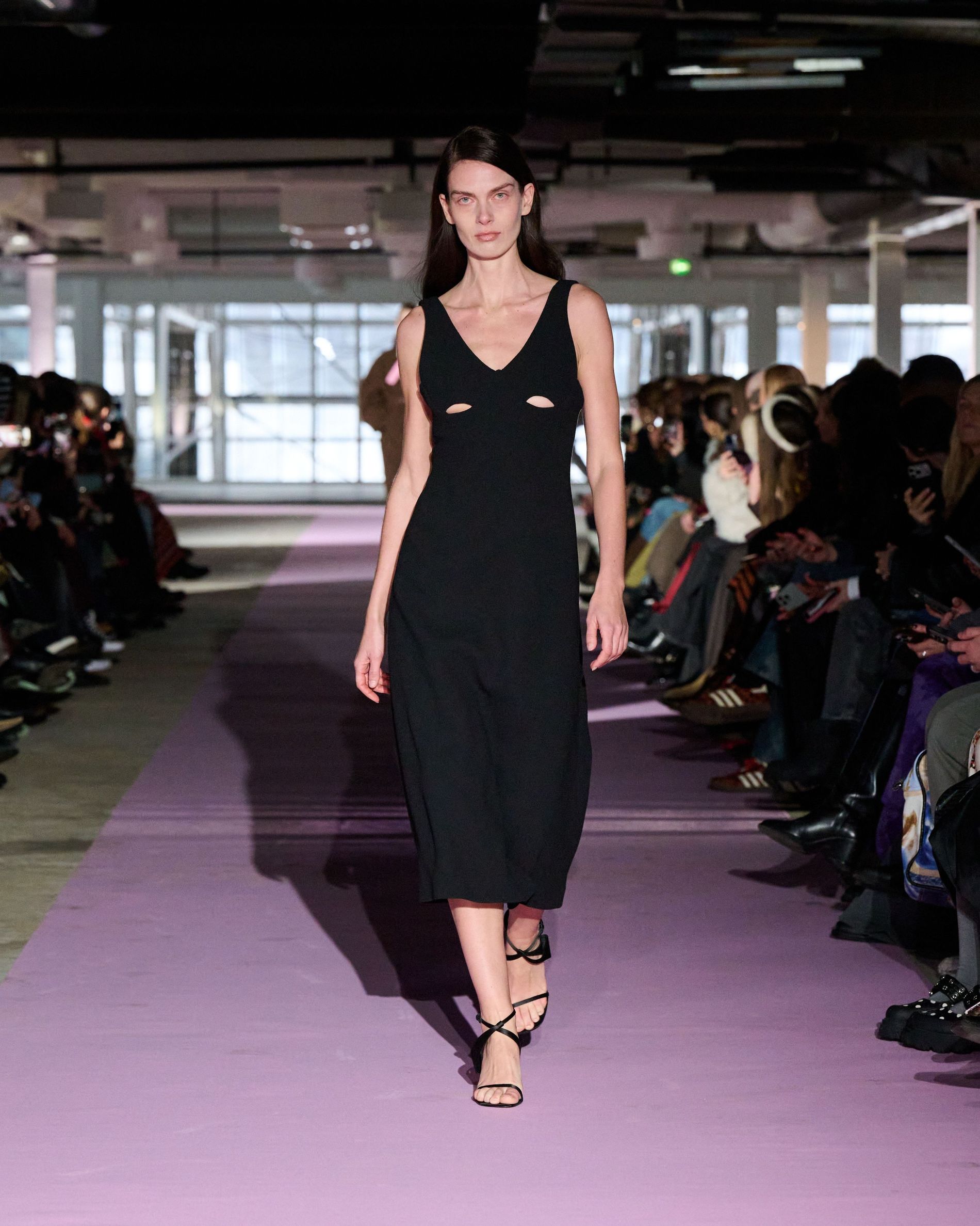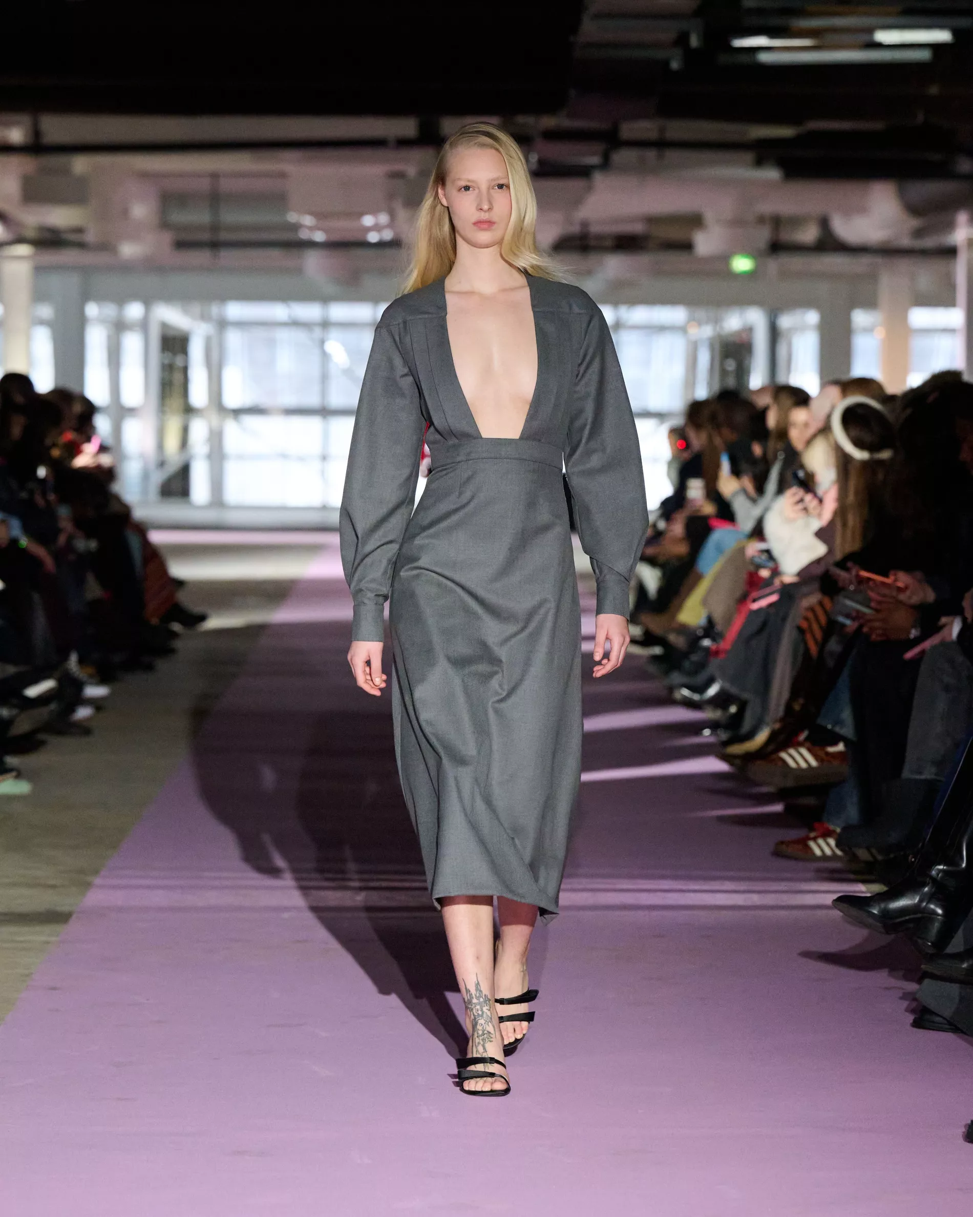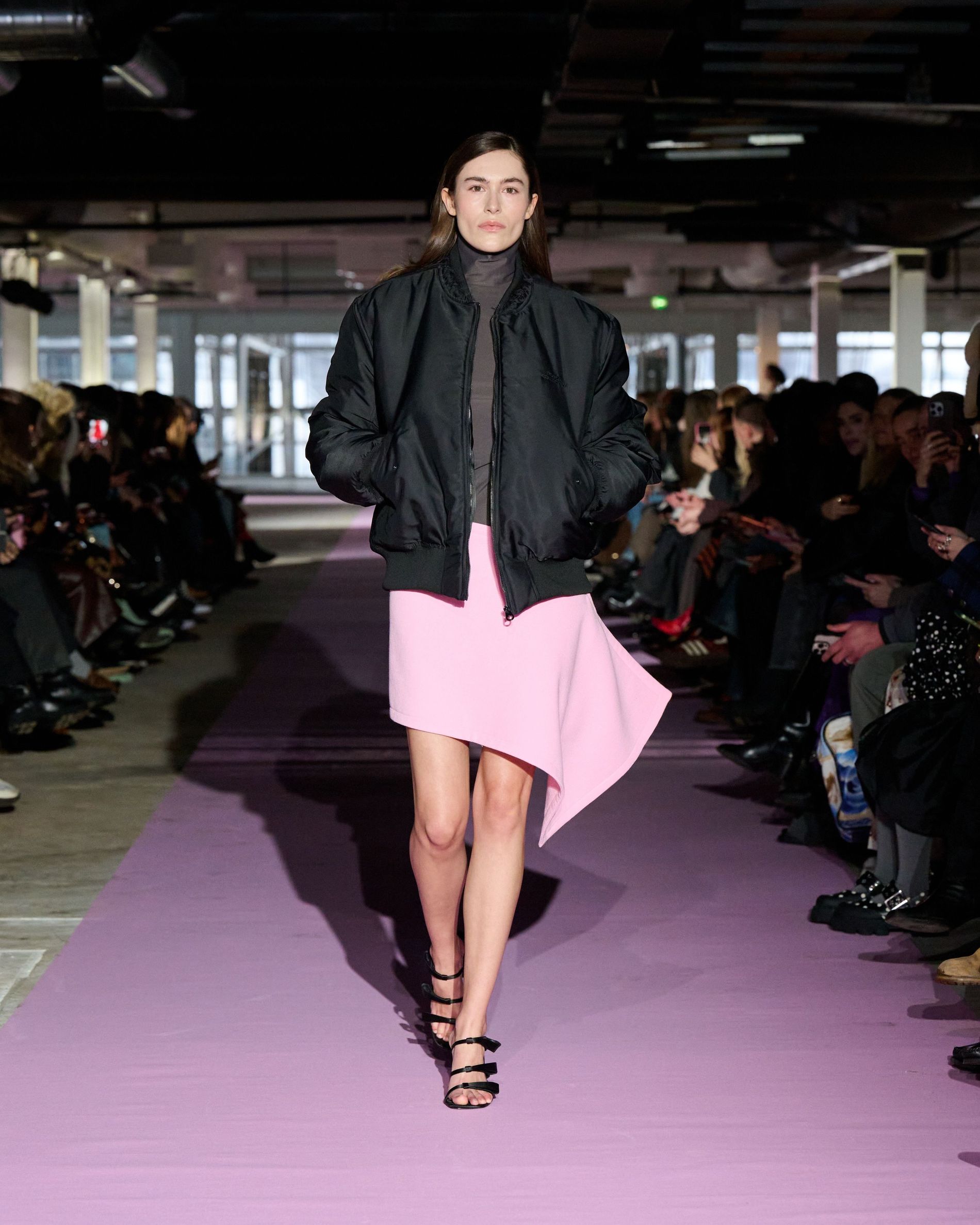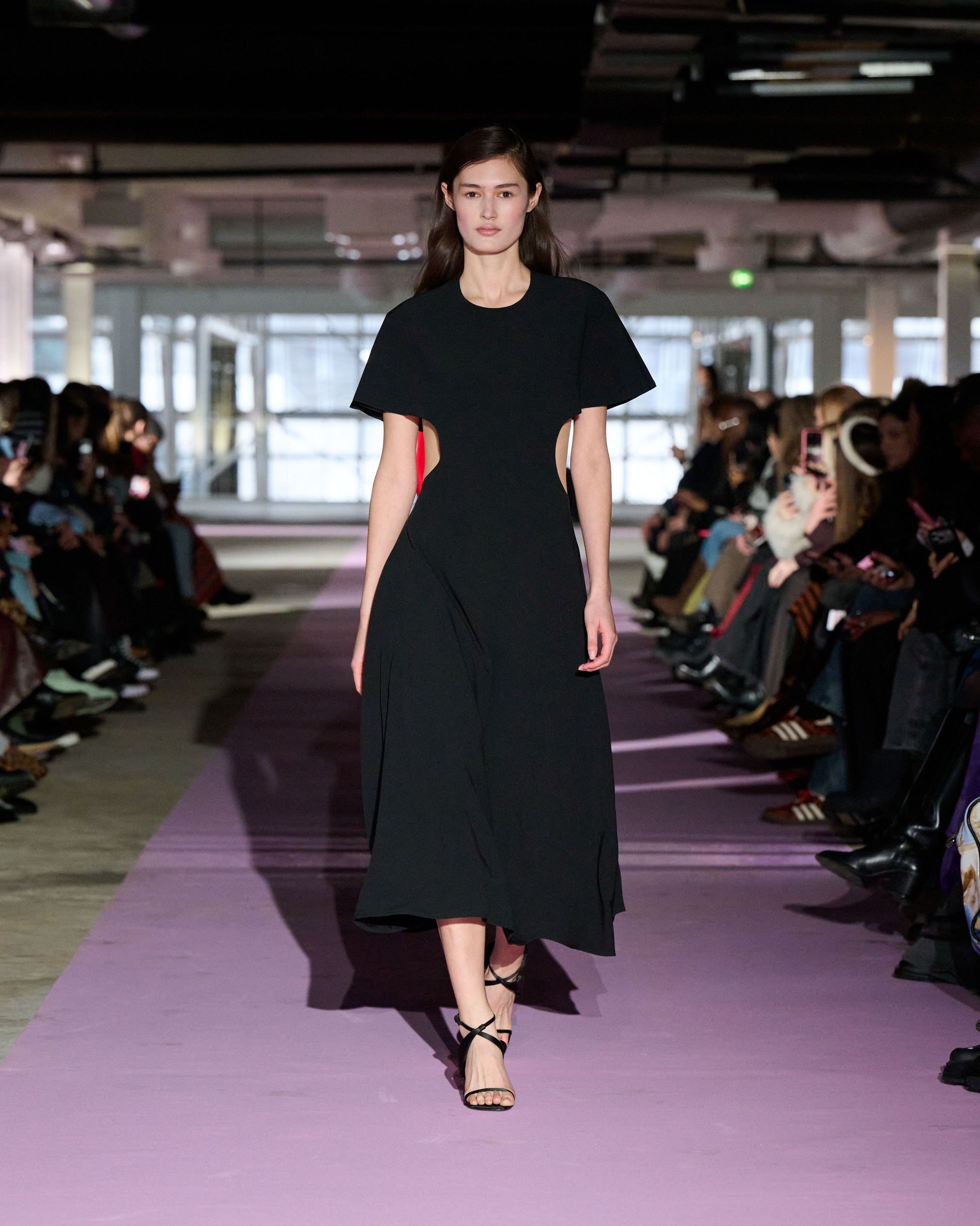 The reference to Kongshaug’s aunt isn’t literal. Rather, the collection offers an ode to her spirit – at once glamorous and effortless, perhaps a little mysterious. The show, which took place in a stark industrial space, found models strutting down a pale pink carpet in the sort of striking garments that pique immediate interest in the woman wearing them. A peplum gown for instance, rendered in the brand’s signature sheer mesh in a hue that mirrors the runway features a daring raised ruffled collar – a “who is she?” moment if there ever was one (the collar reappears several times throughout the collection, including on the razor sharp grey tailored skirt suit that opened the show). Subtler pieces, too, like the chocolate brown trench in luxurious double face crepe with a contrasting pink collar and a single-button twill suit, the waist nipped just so, similarly tell a story beyond their immediate visual impact.