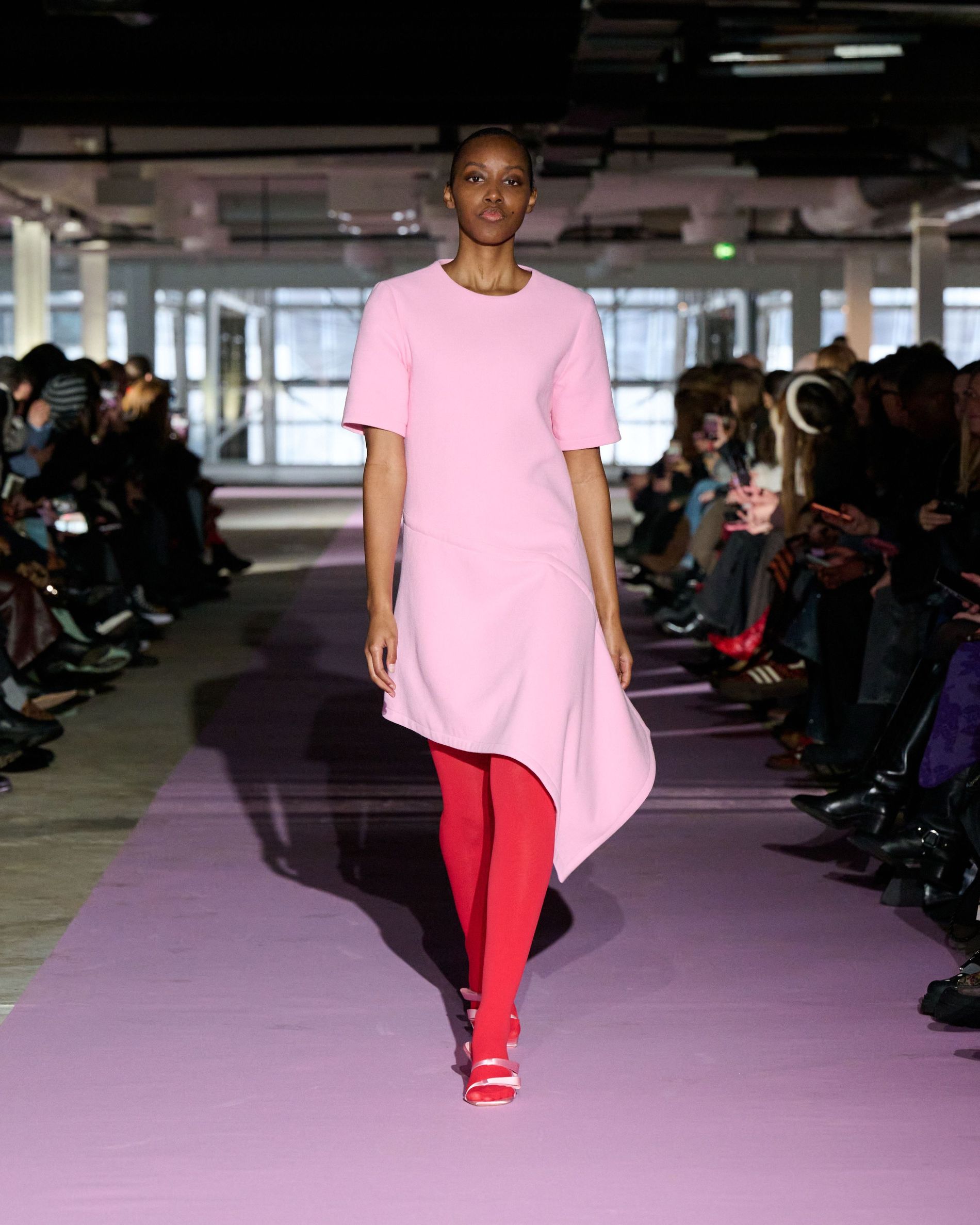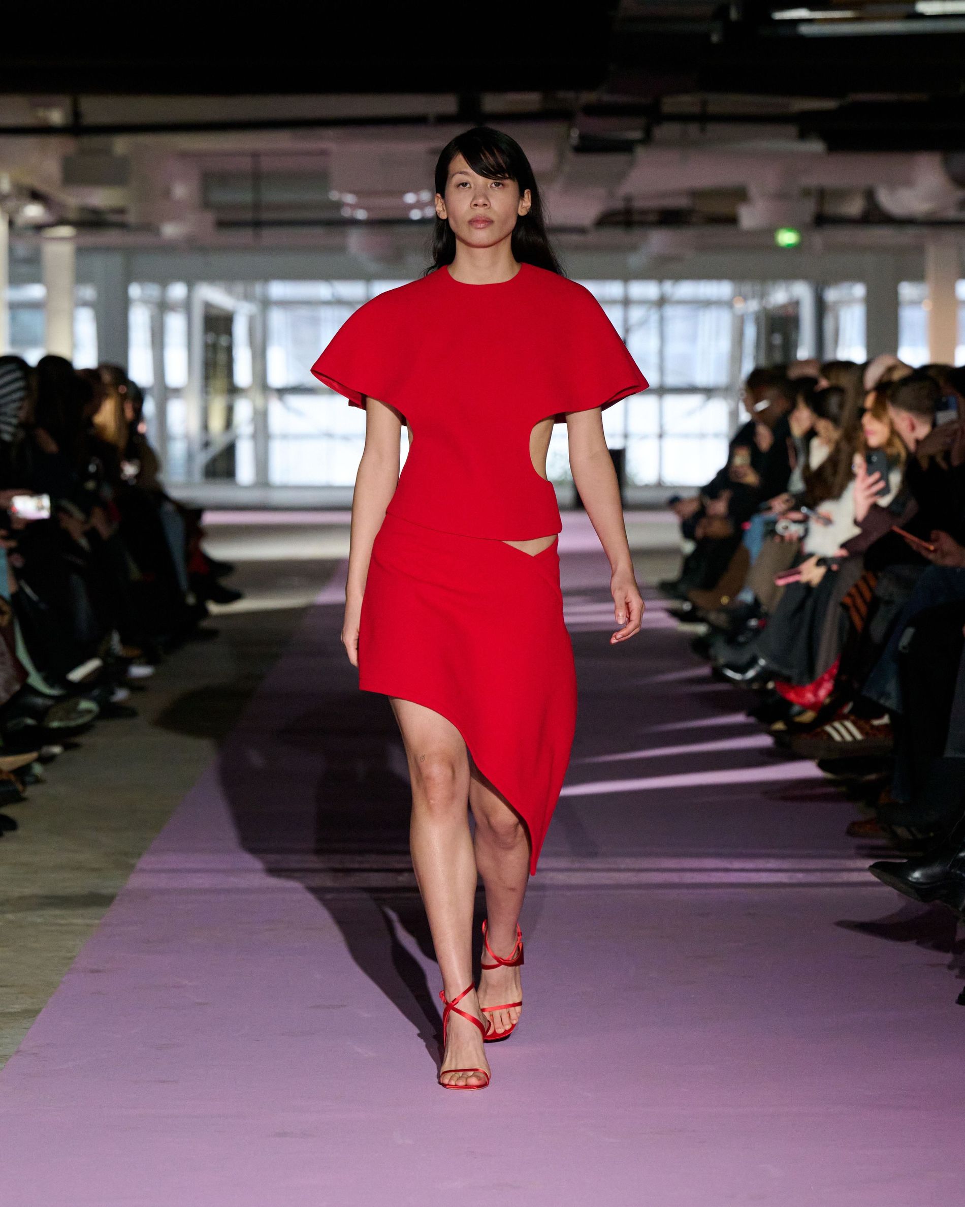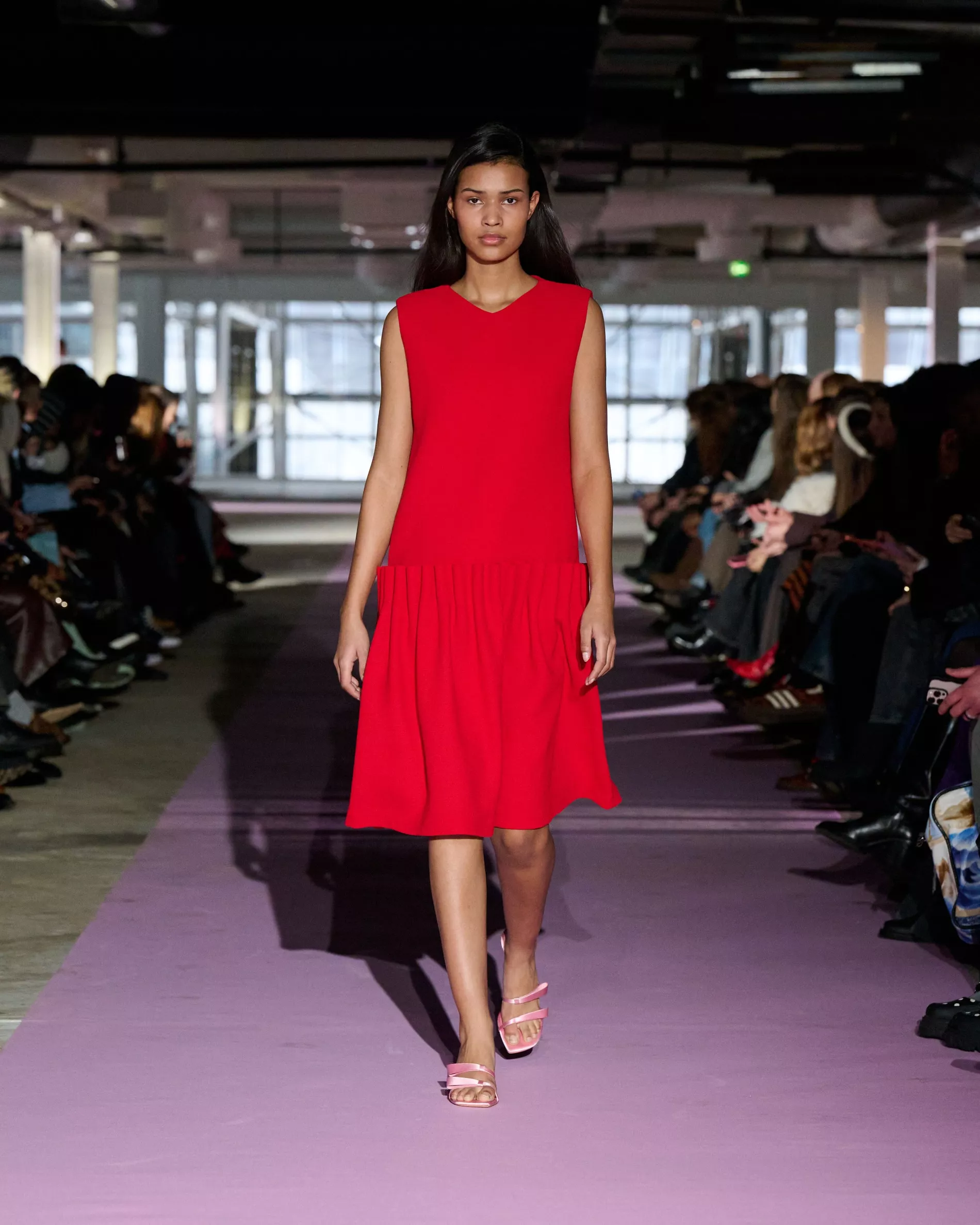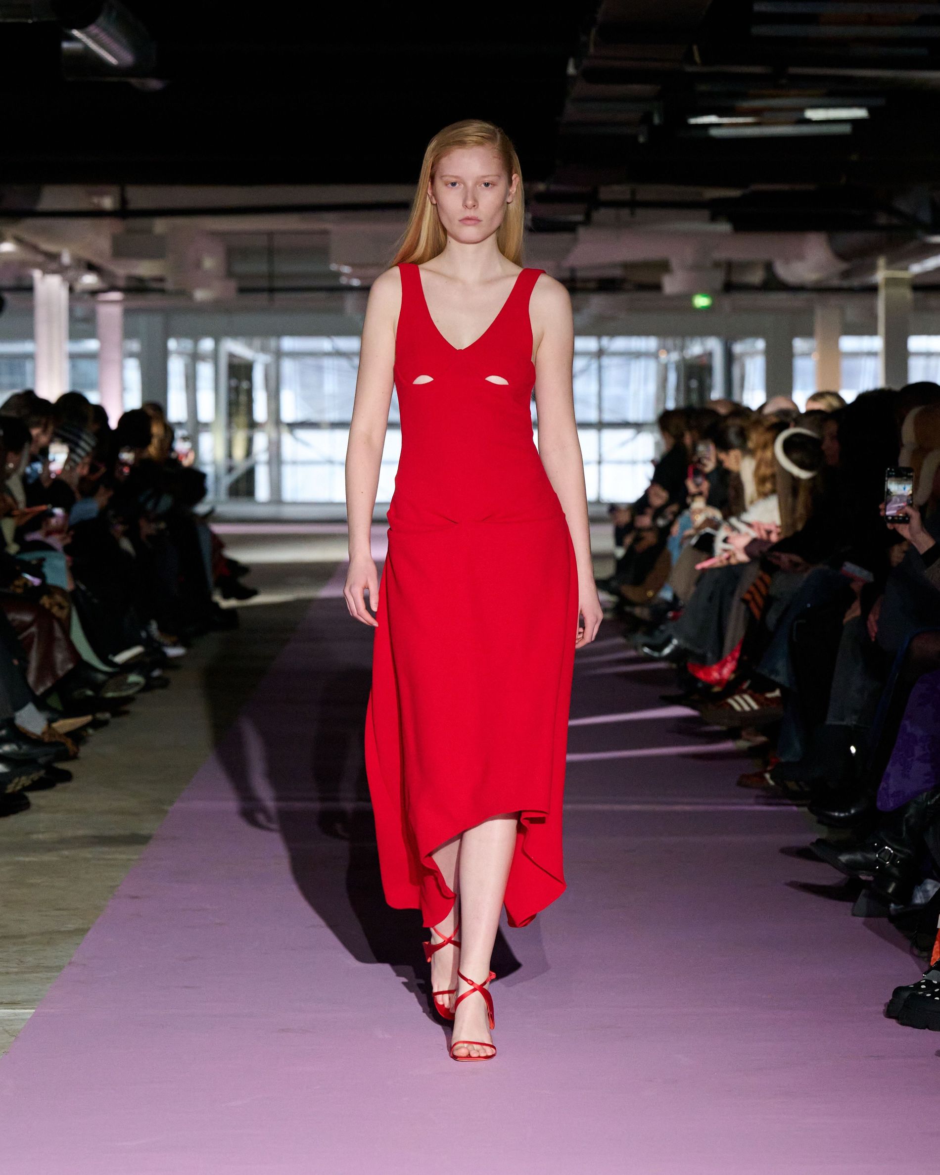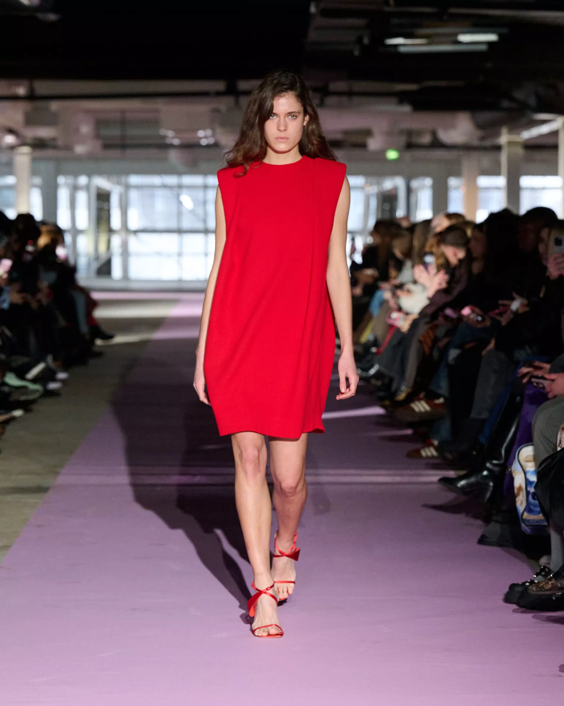 The reference to Kongshaug’s aunt isn’t literal. Rather, the collection offers an ode to her spirit – at once glamorous and effortless, perhaps a little mysterious. The show, which took place in a stark industrial space, found models strutting down a pale pink carpet in the sort of striking garments that pique immediate interest in the woman wearing them. A peplum gown for instance, rendered in the brand’s signature sheer mesh in a hue that mirrors the runway features a daring raised ruffled collar – a “who is she?” moment if there ever was one (the collar reappears several times throughout the collection, including on the razor sharp grey tailored skirt suit that opened the show). Subtler pieces, too, like the chocolate brown trench in luxurious double face crepe with a contrasting pink collar and a single-button twill suit, the waist nipped just so, similarly tell a story beyond their immediate visual impact.