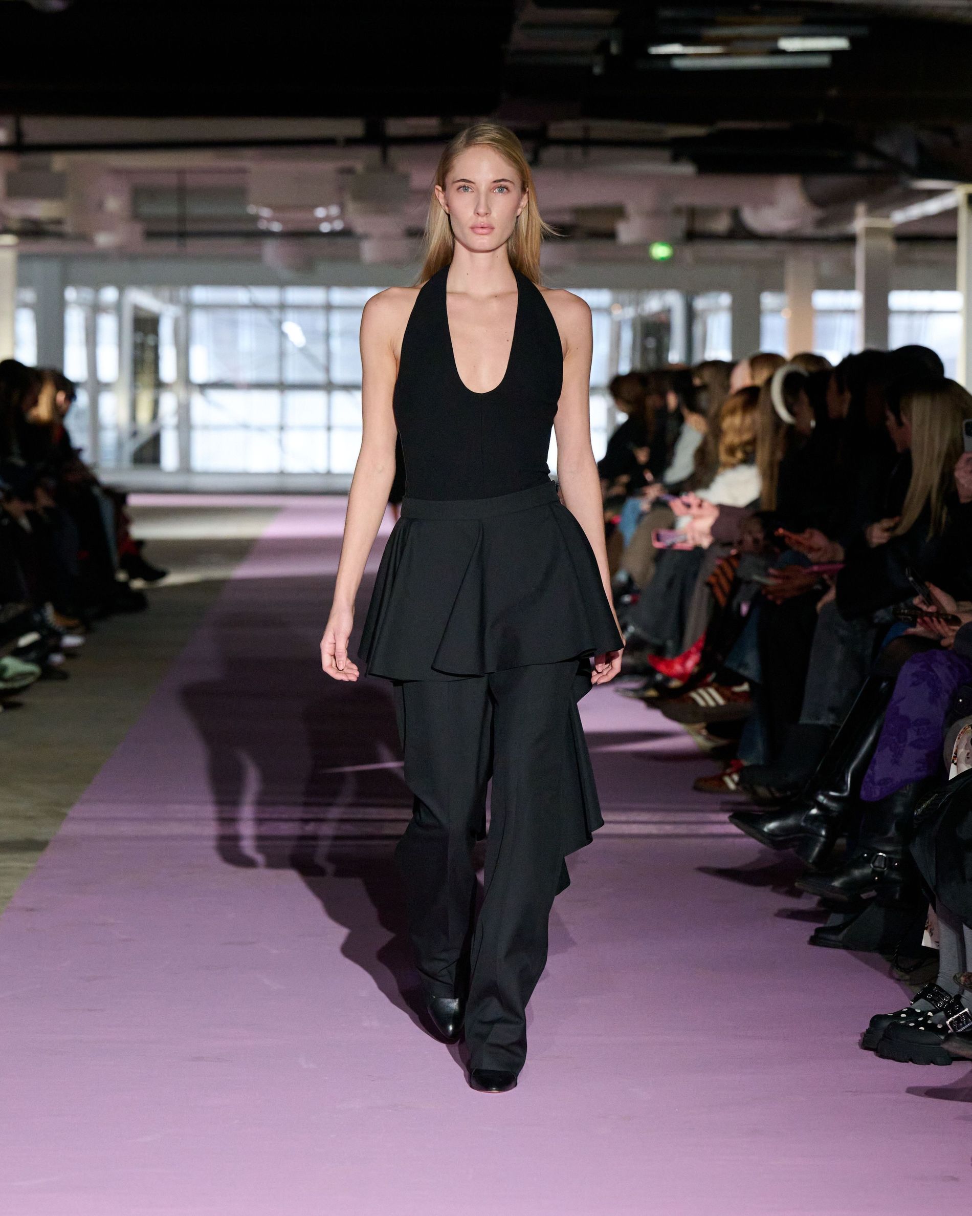 There’s something less fussy, more to the point, about the collection at large. A black halter neck dress – in that same sturdy double faced crepe - with its gently flared skirt is a confidently simple statement. Elsewhere, Forza’s emerging signatures – the bra cut-outs and drop-waist piped pleating – punctuate otherwise clean silhouettes. “It’s very much about architectural lines,” says Kongshuag. “It really cuts straight through to the point.” One of the few decorative flourishes is a structured neck tie, its concealed boning allowing it to hold its sturdy shape. The ladies silhouettes were juxtaposed by the pulsating Chicago house soundtrack, anchored by Swedish DJ Eric Prydz’s infectious anthem 'Pjanoo'.