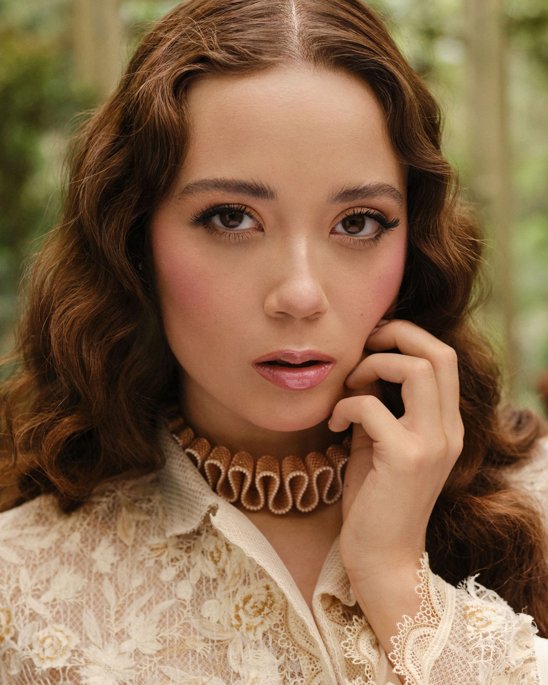 There’s a cinematic quality to Laufey’s cover shoot. Nestled in a greenhouse, the Icelandic musician lounges beneath wild palms, her lace‑clad legs draped across burlap cushions. A sort of vintage reverie, amplified by the brushwork of Dior Makeup’s creative and image director Peter Philips.