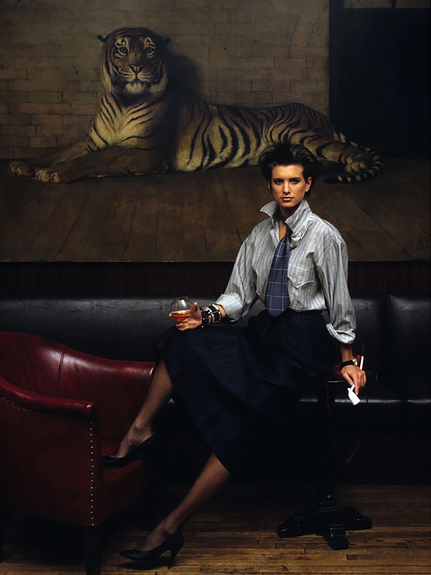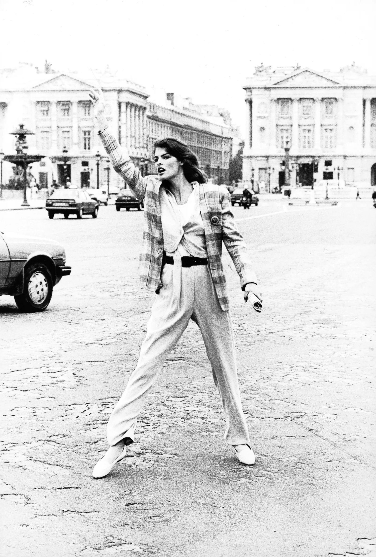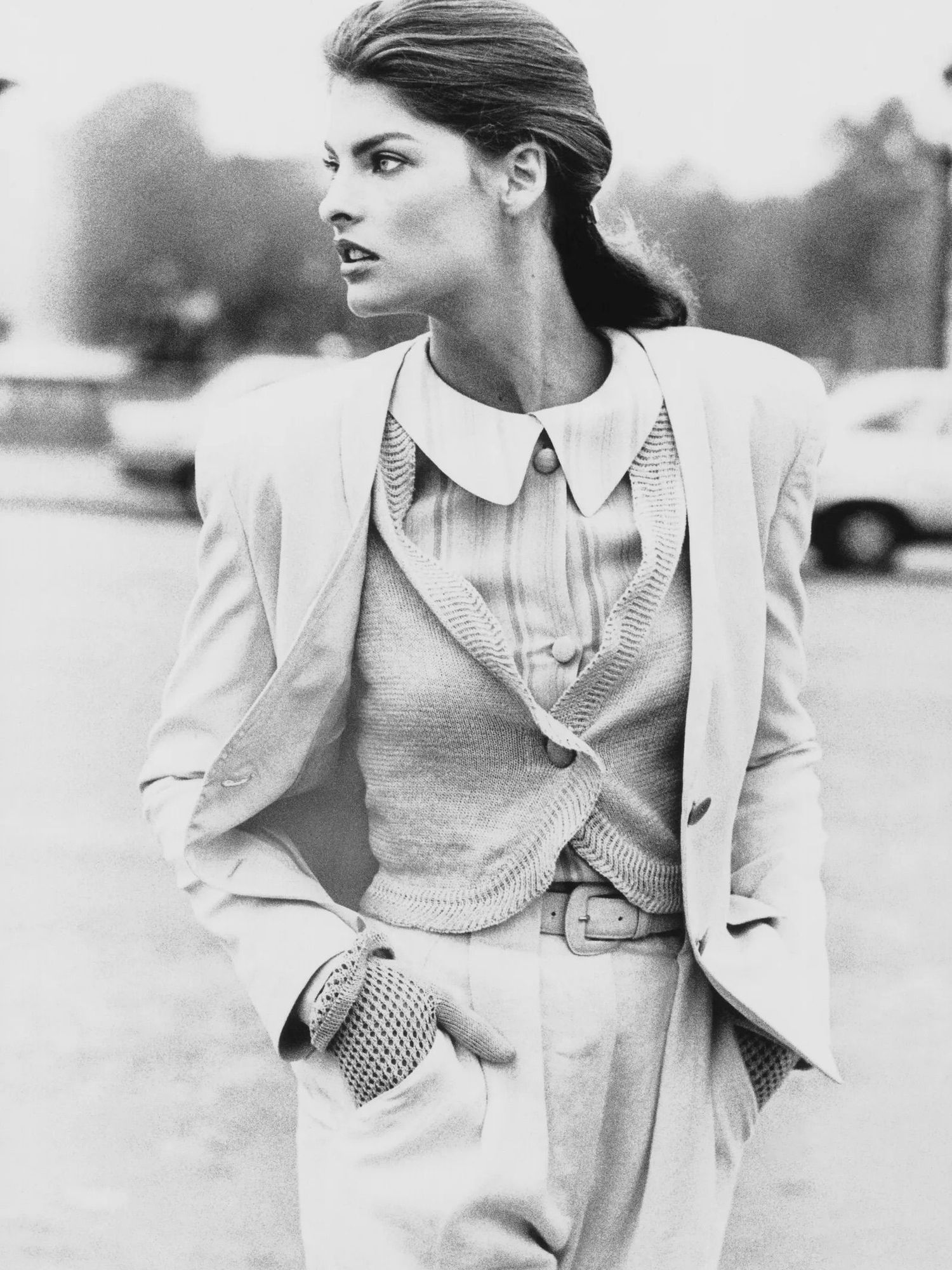 Lise Brand wears a skirt and blouse by Giorgio Armani. Photo: Oliviero Toscani, Vogue, March 1984