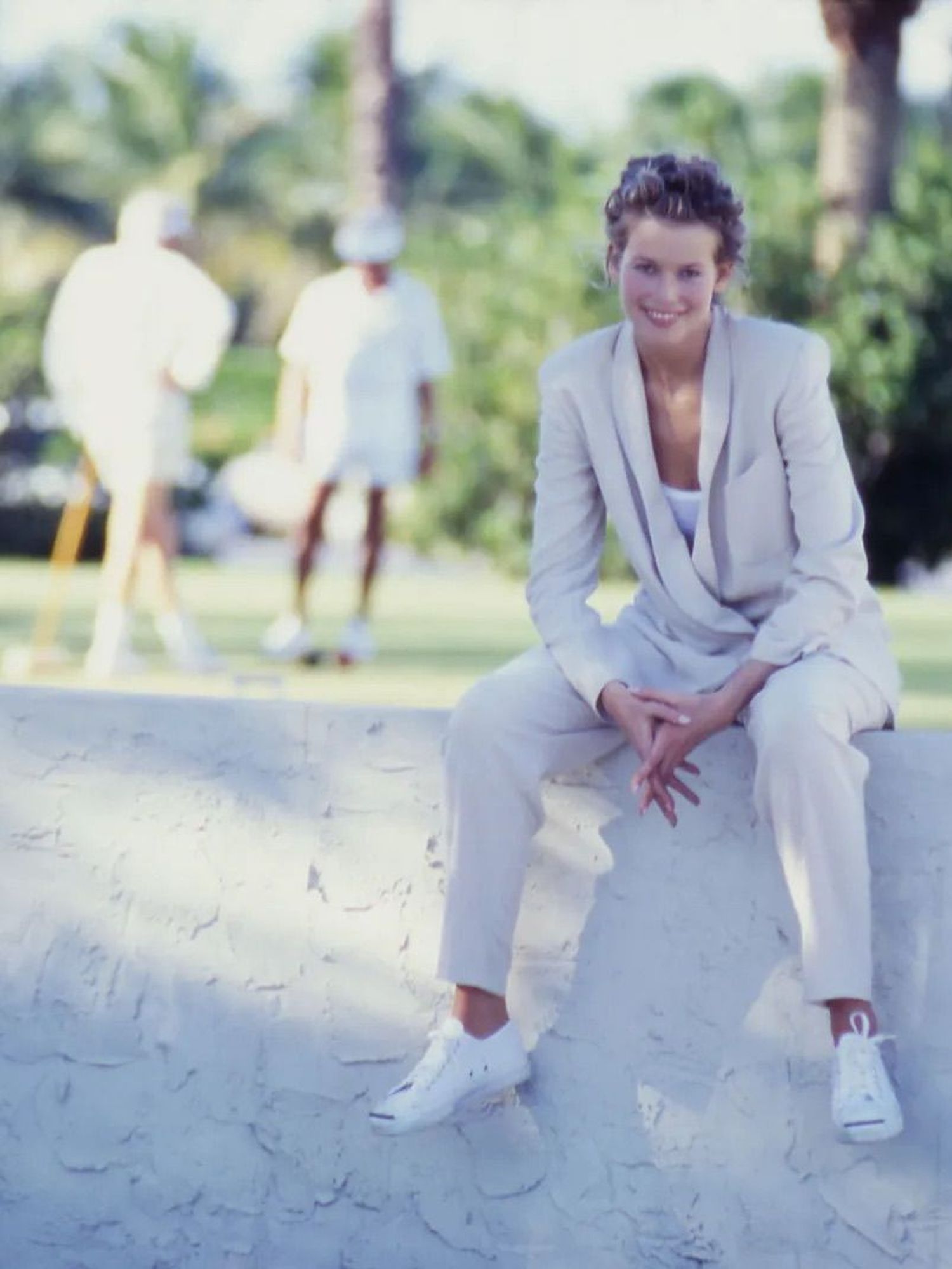 “Giorgio Armani’s pared-down approach to the suit includes loosely cut trousers and a jacket that’s as relaxed as as shirt.”. Photo: Arthur Elgort, Vogue, January 1994