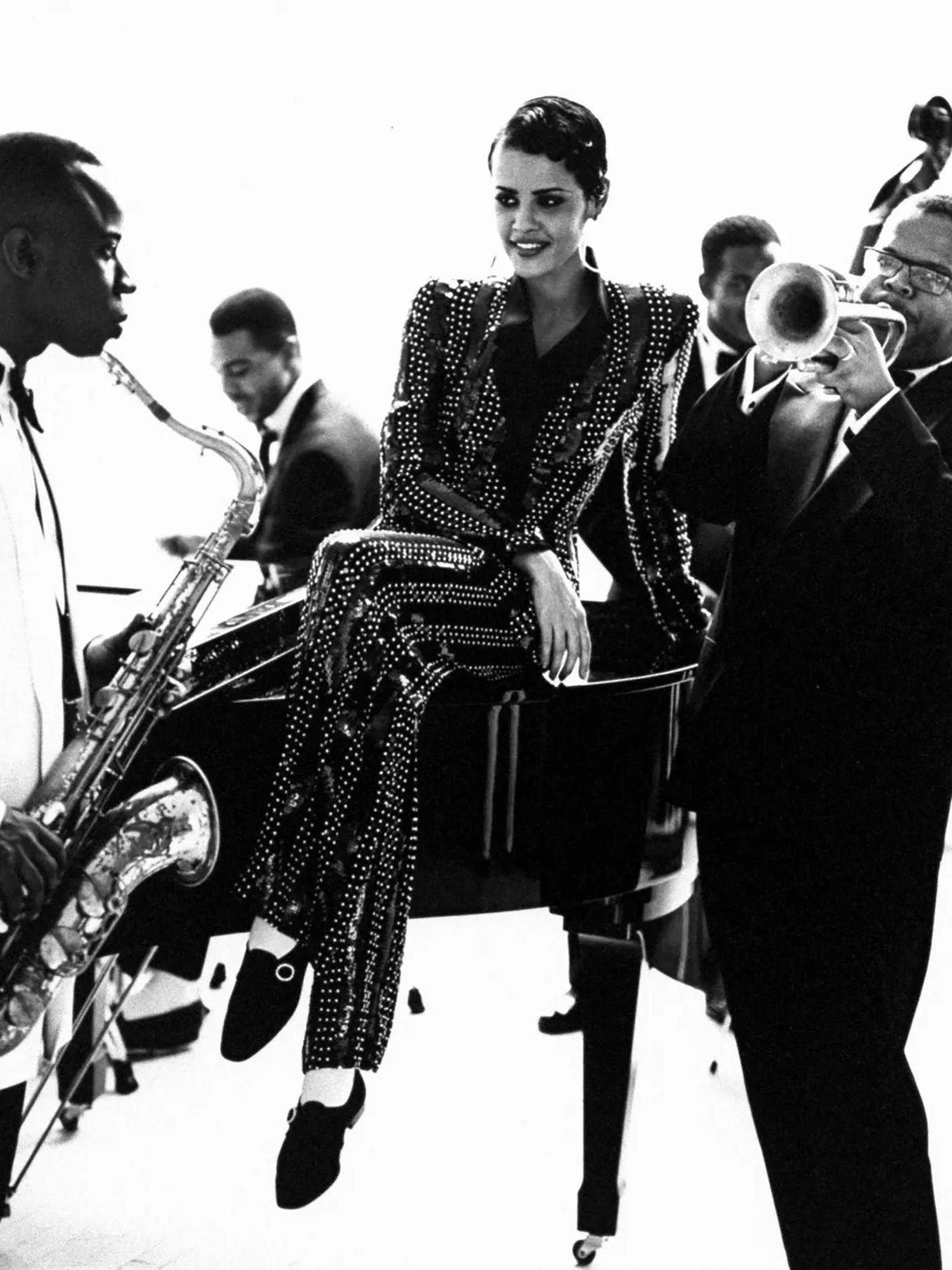 Nadège du Bospertus keeps tune in Giorgio Armani’s “playful dress-up of … [a] chalk-striped pantsuit, done in paillette-studded silk chiffon.”. Photo: Arthur Elgort, Vogue, August 1992
