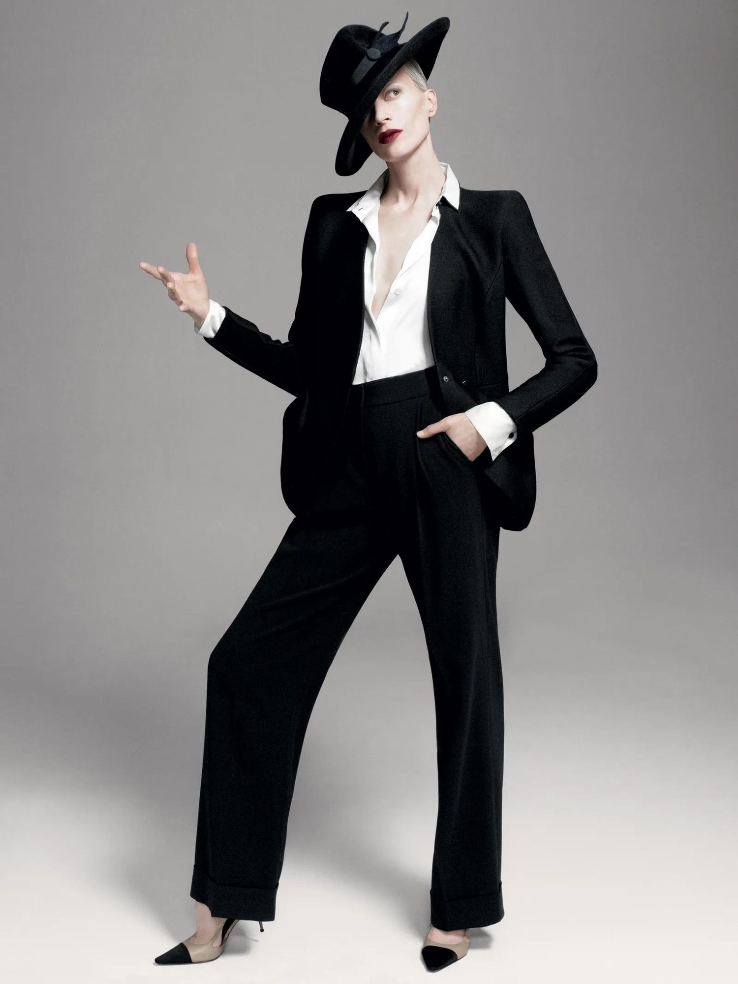 Kristen McMenamy, dressed to thrill in Giorgio Armani’s wool suit and silk shirt. Photo: David Sims, Vogue, August 2010