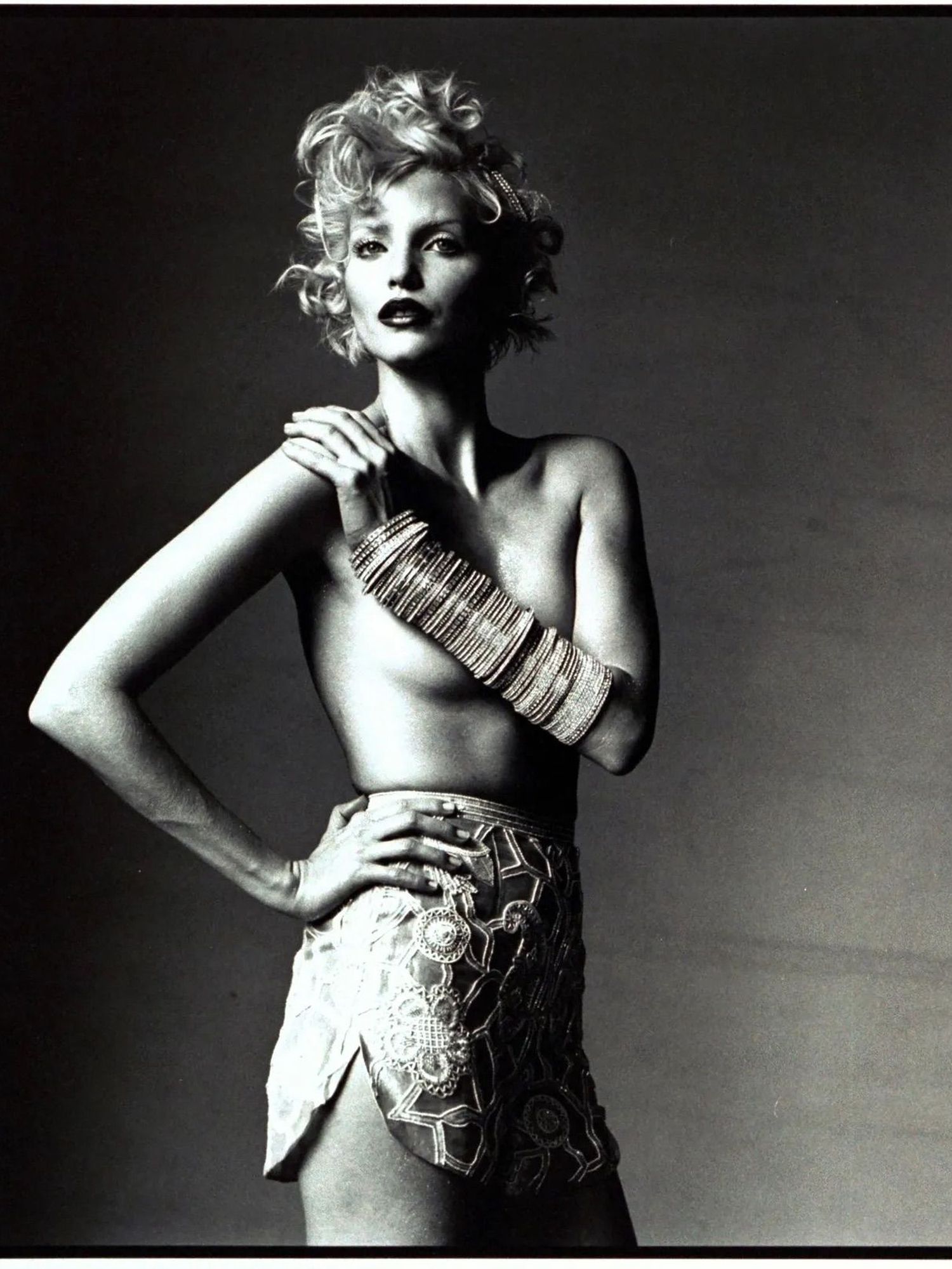 Nadja Auermann in Giorgio Armani's intricately worked shorts. Photo: Irving Penn, Vogue, March 1995
