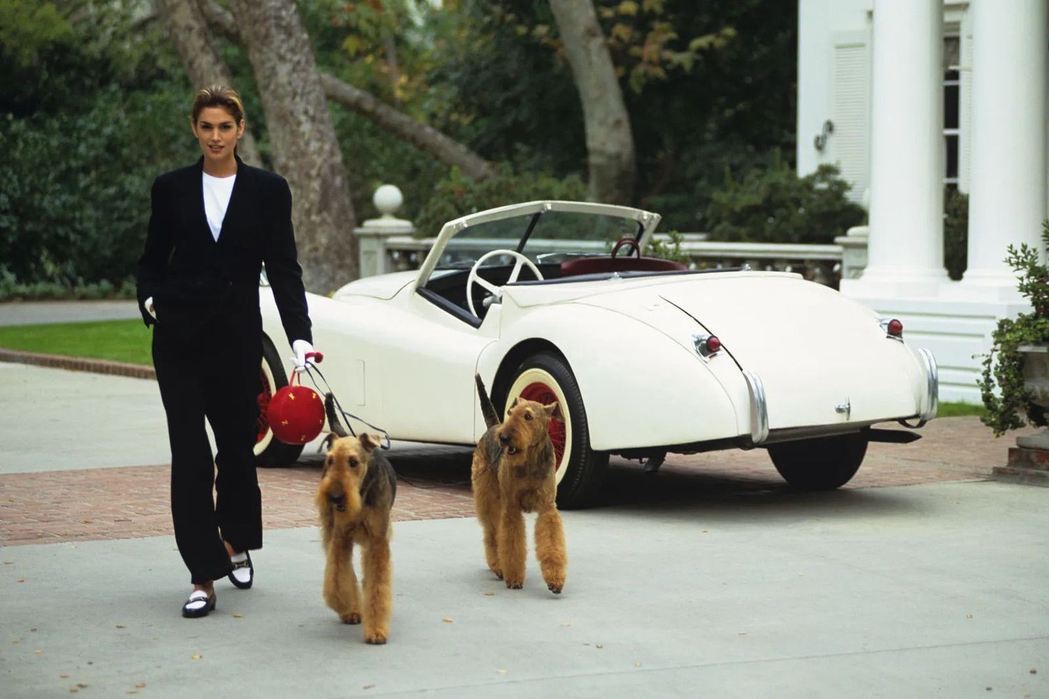 Cindy Crawford in a navy pantsuit by Giorgio Armani. Photo: Arthur Elgort, Vogue, March 1992