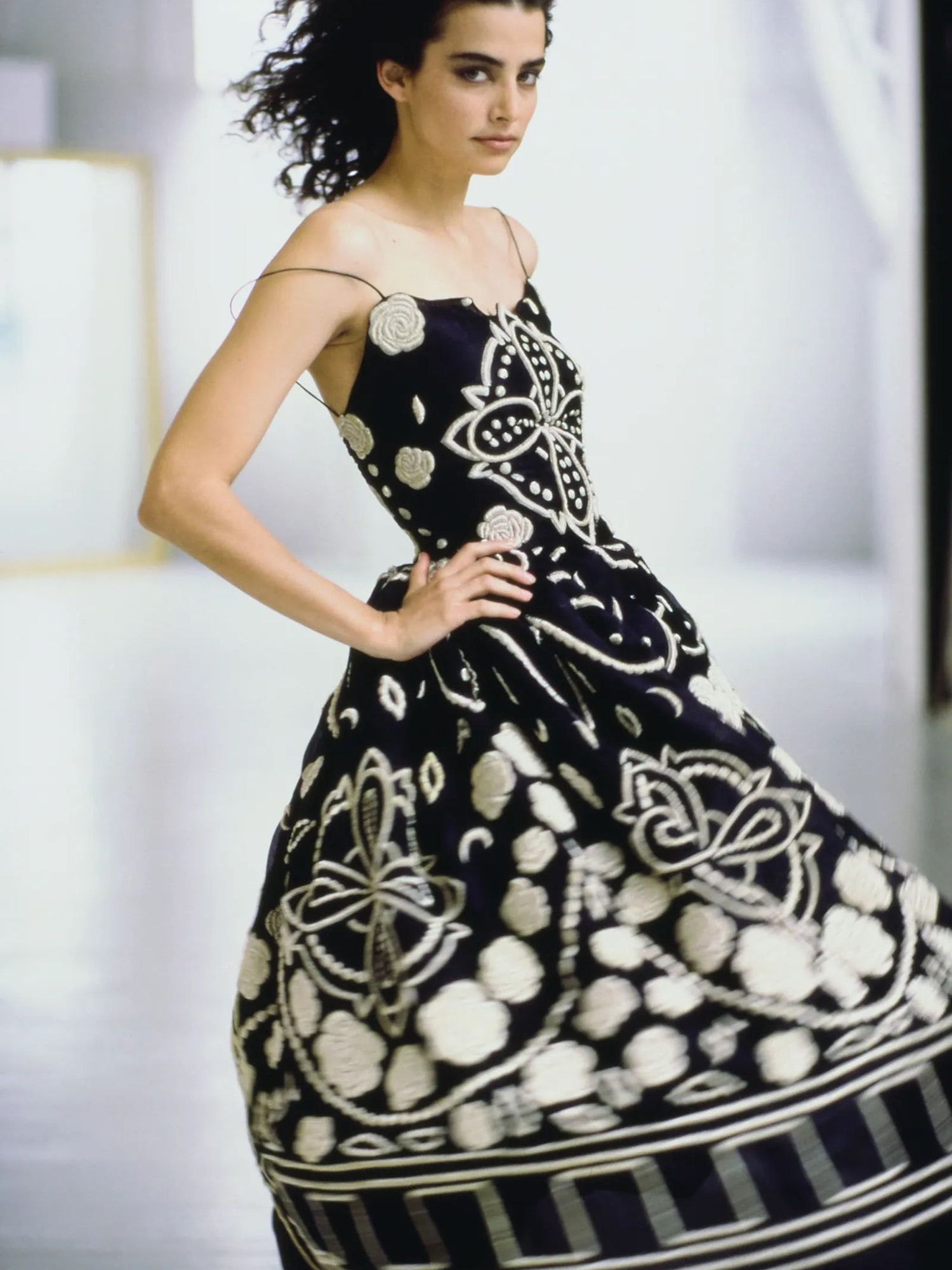 Jennifer Rubin in Giorgio Armani Couture’s silver-embroidered silk organza camisole and ball skirt. Photo: Arthur Elgort, Vogue, January 1989