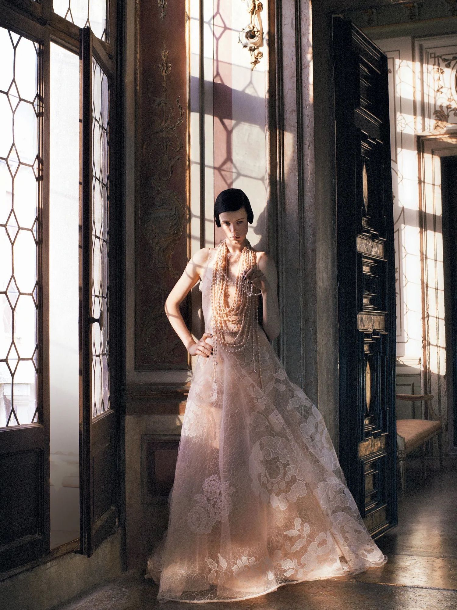 Edie Campbell in a pale-pink silk organza Armani Privé dress with a crinoline lace skirt and airy-embellishments. Photo: David Sims, Vogue, September 2013