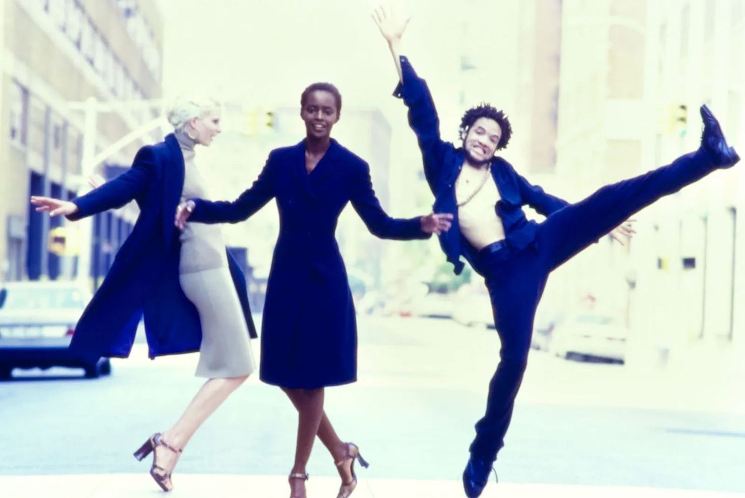 Christina Kruse and Savion Glover dance in the street with Kiara Kabukuru, center, who wears Armani’s fitted coat. Photo: Arthur Elgort, Vogue, August 1996