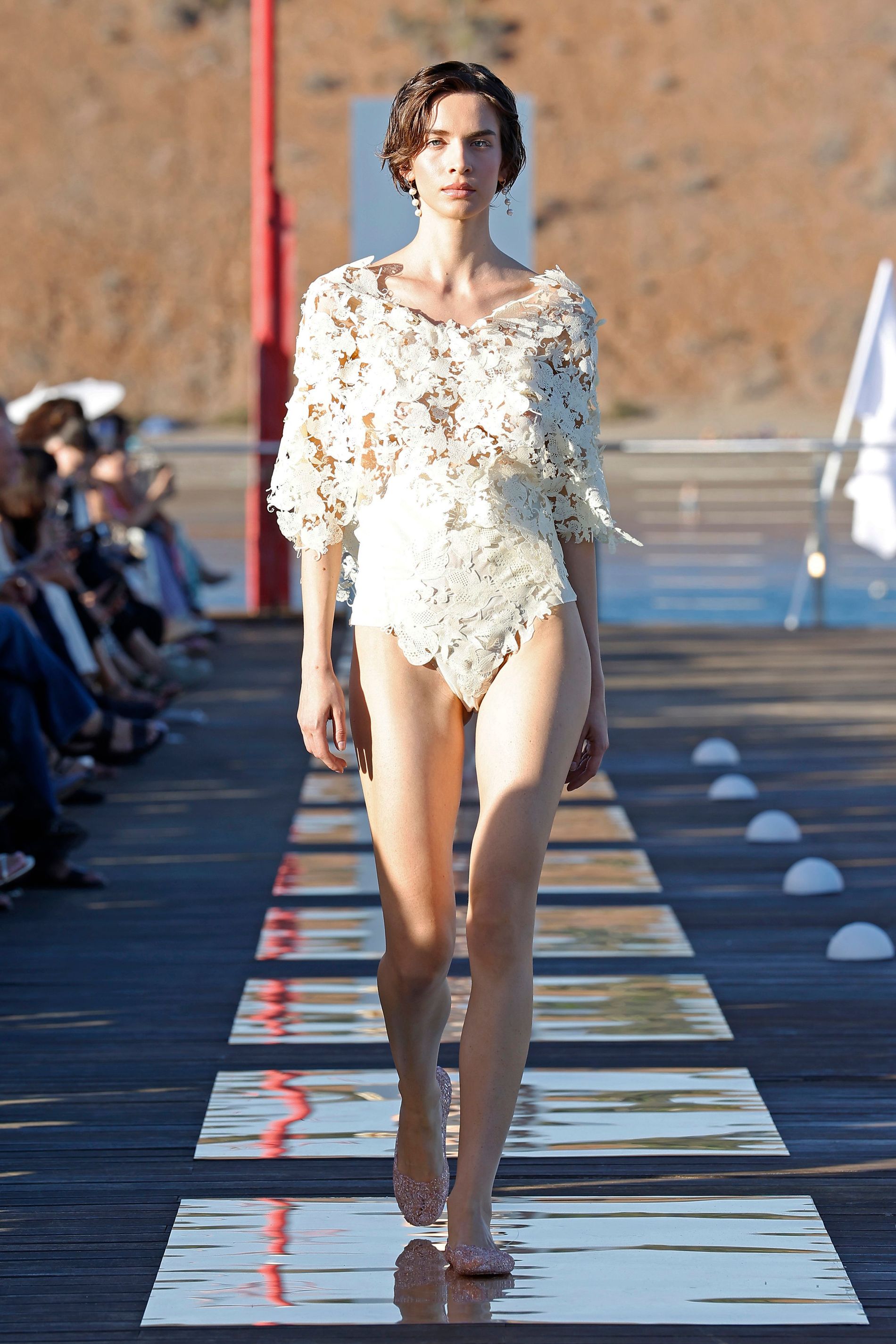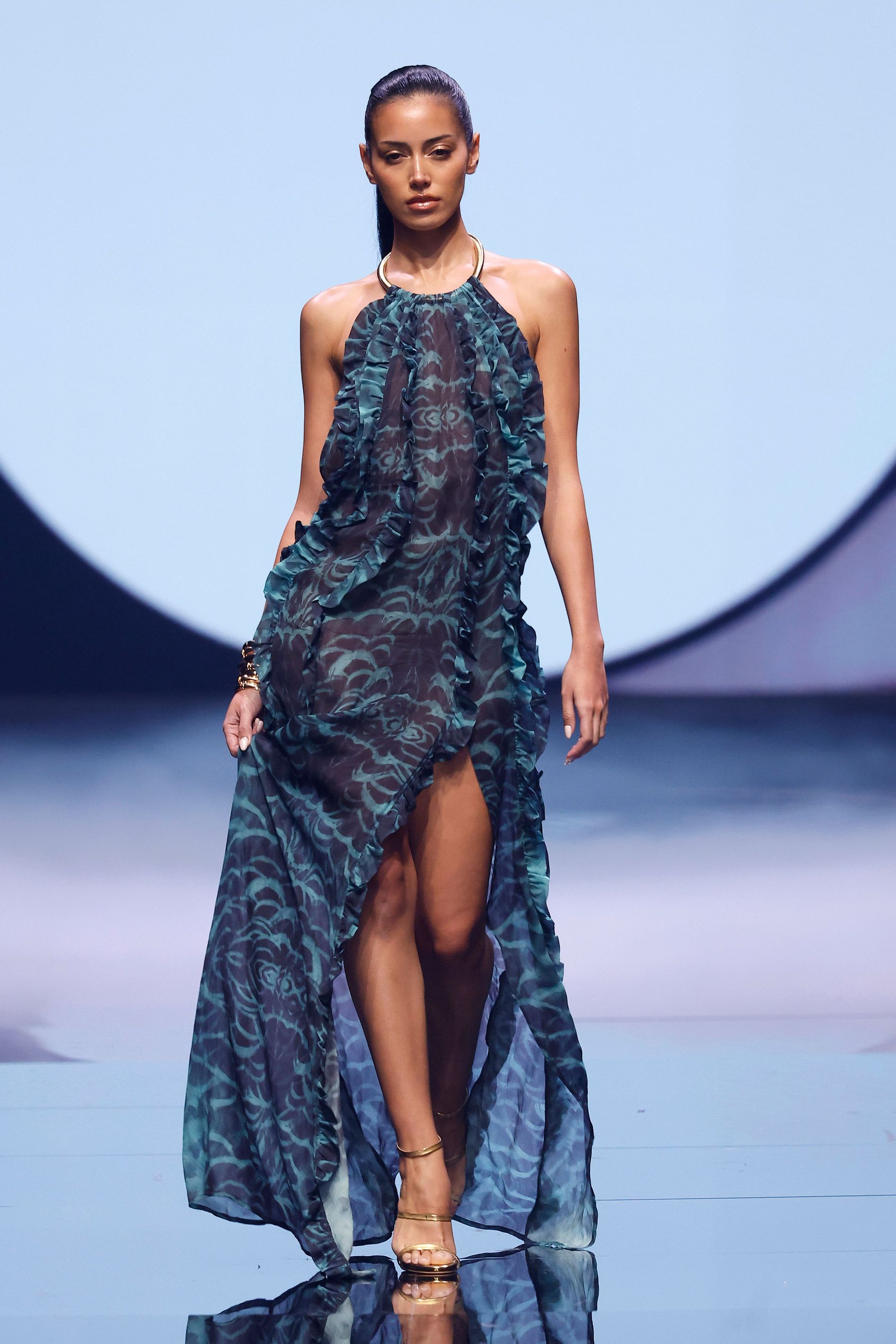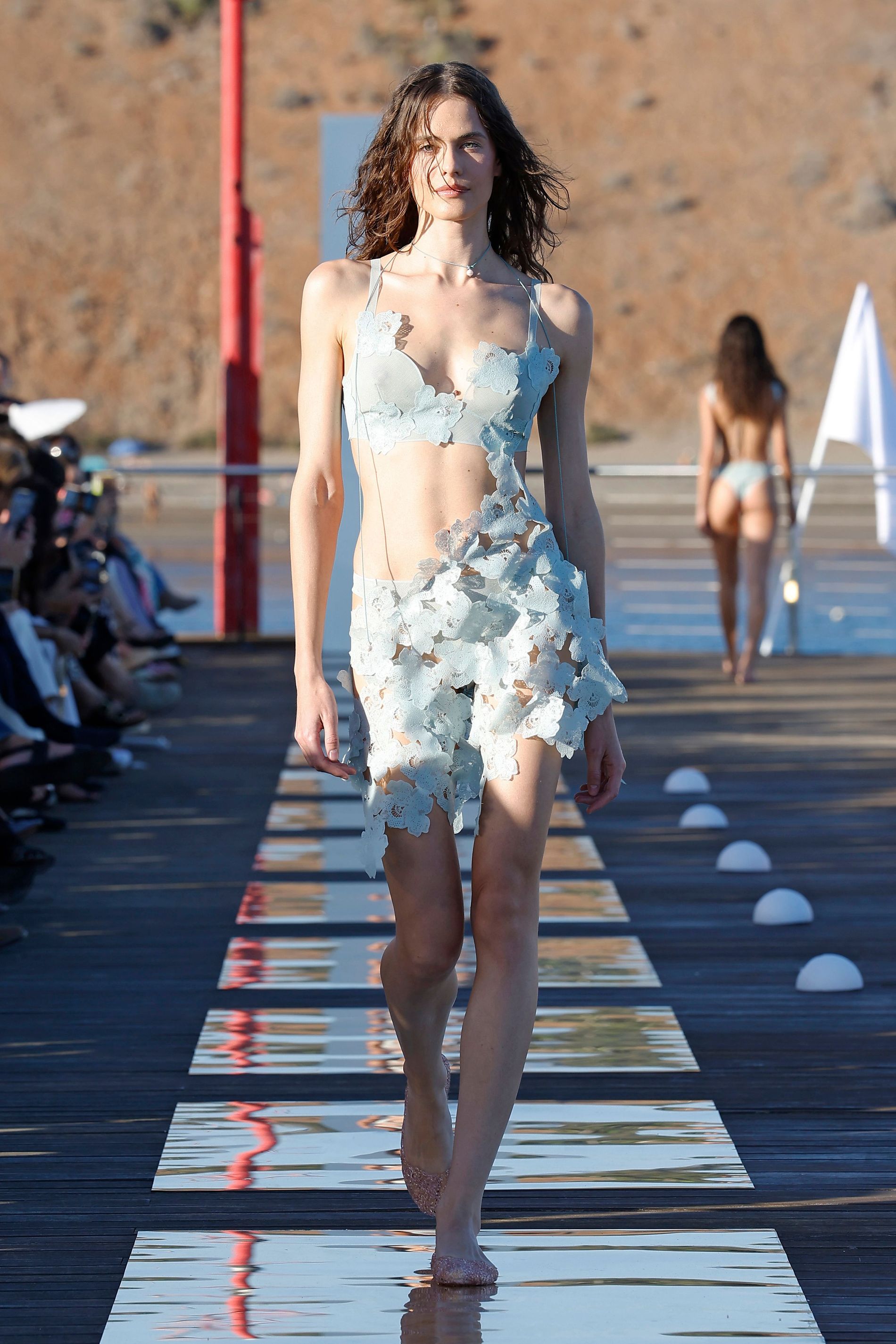 The week commenced at the picturesque Pasito Blanco, where shimmering sunset-lit waves provided a beautifully apt setting to kick off the shows. GCSW began with a debut from Joana Michaela, a recent graduate who presented her inaugural cruise collection on the island. Her offering was a groundbreaking exploration of avant-garde swimwear, where the intricate dance between artisanal craftsmanship and cutting-edge technology unfolded in a remarkably intimate dialogue.