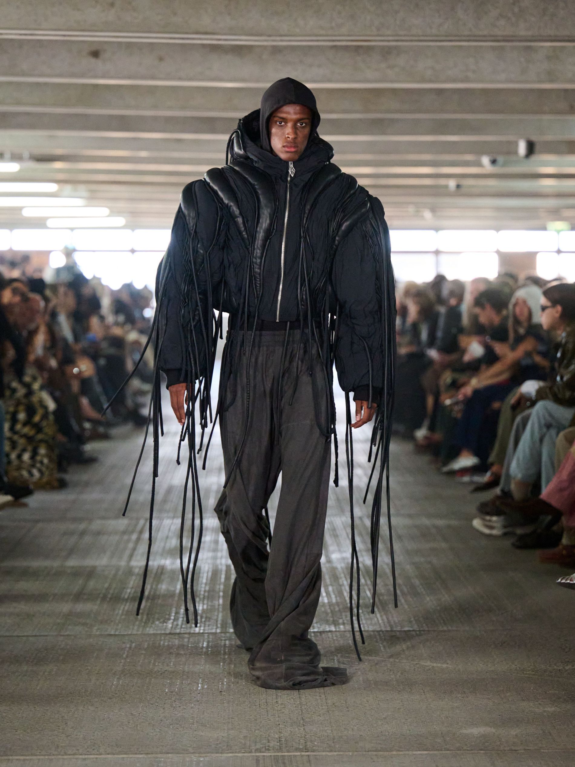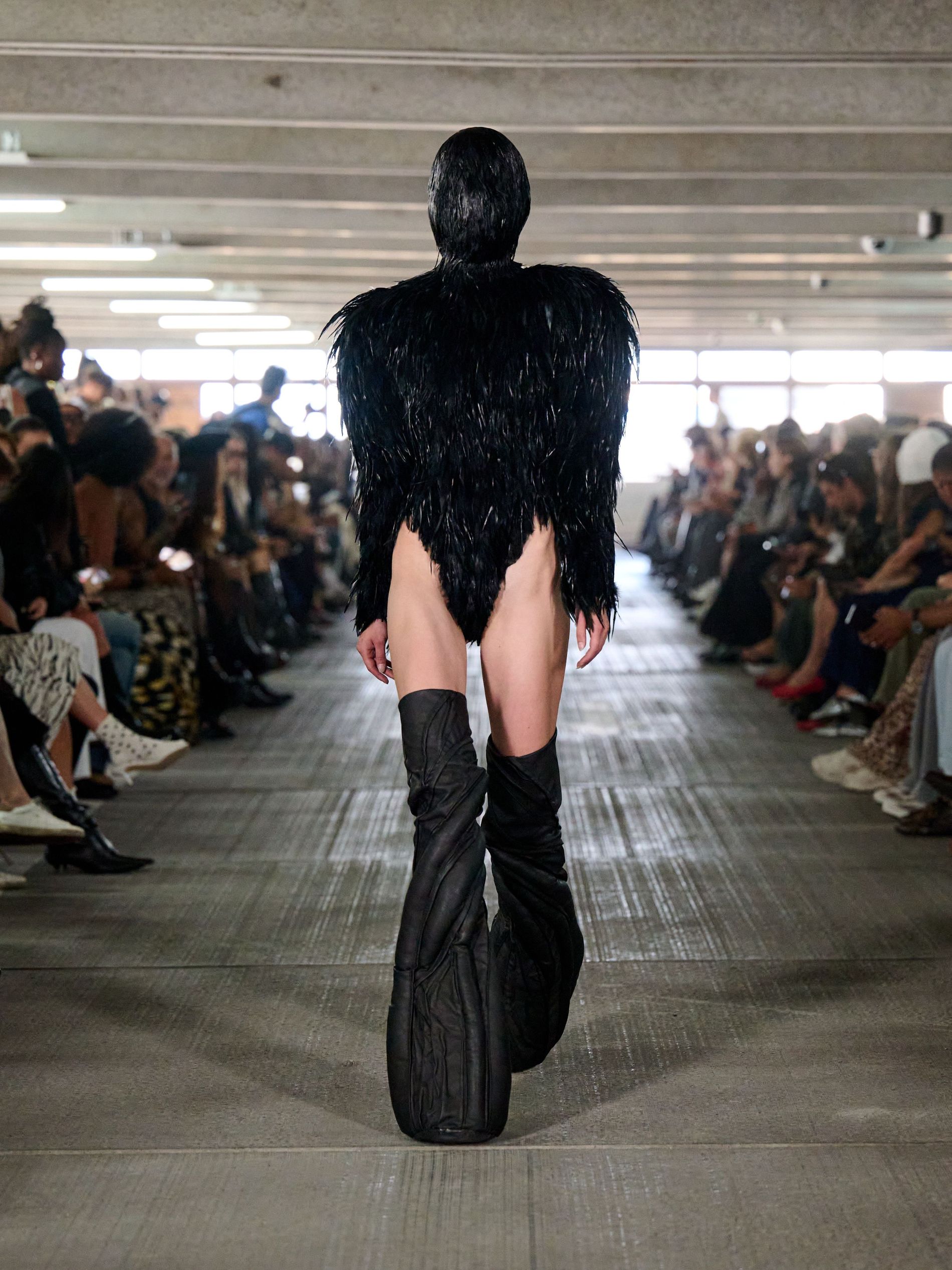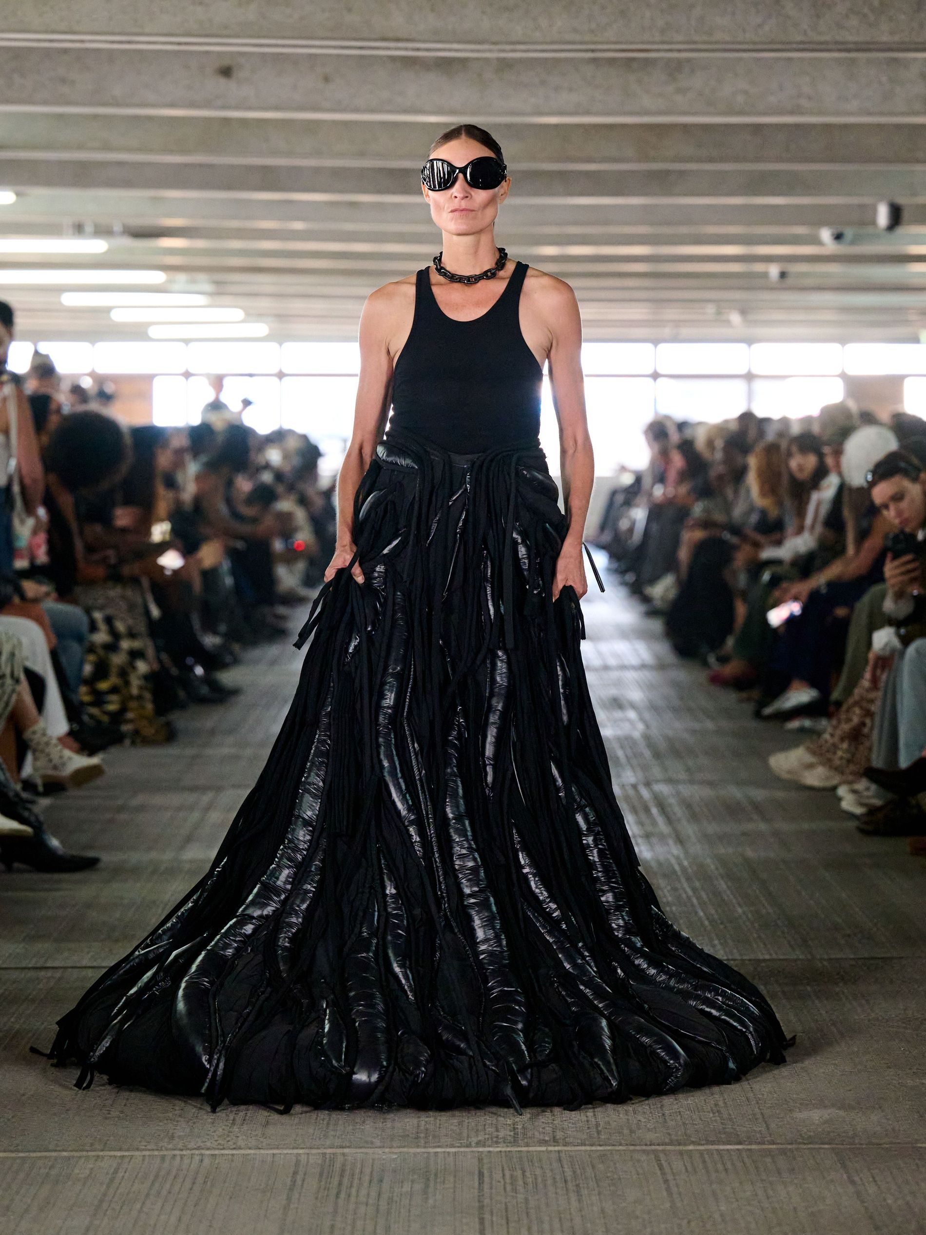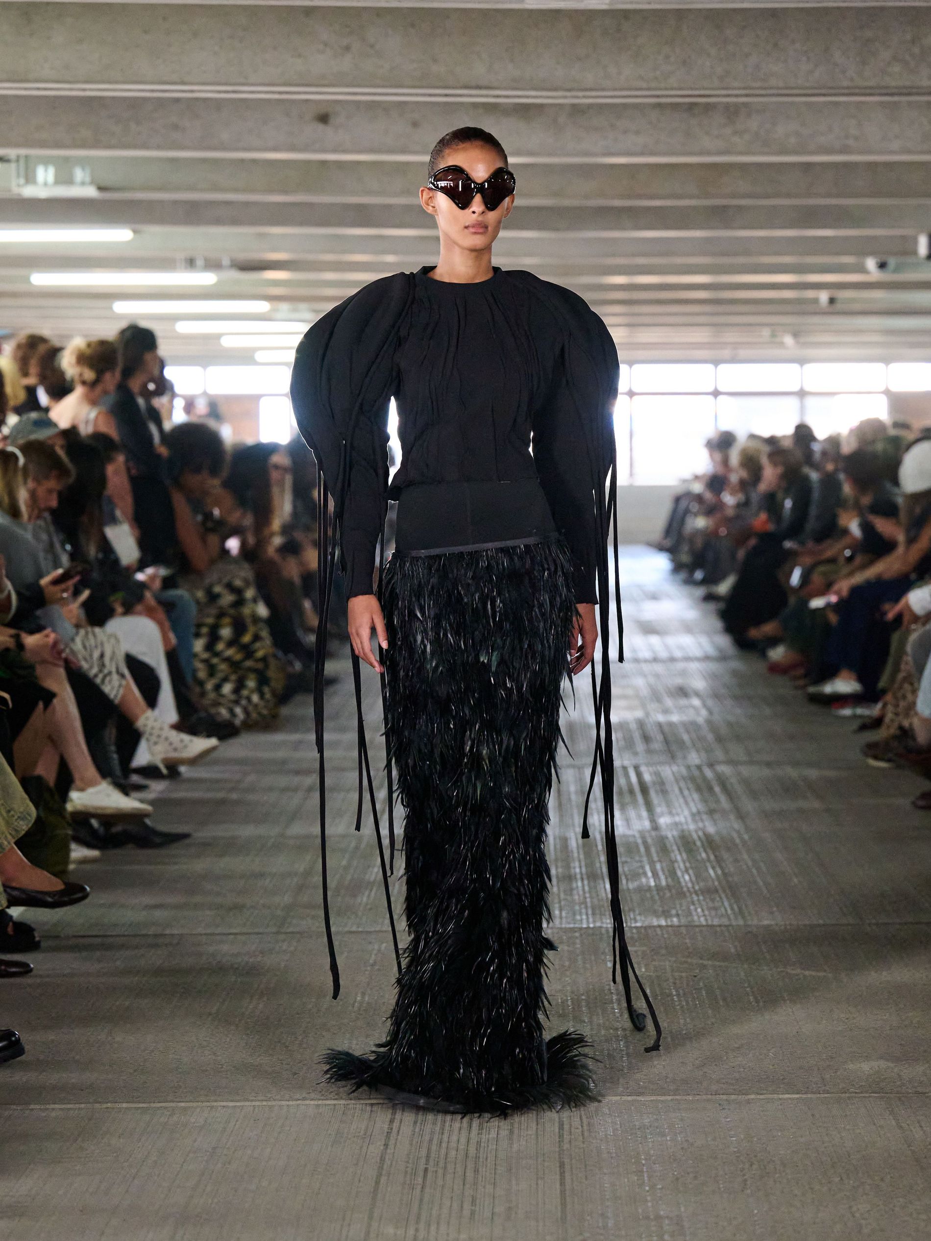 Ceremonial streetwear gets couture treatment in Han Kjøbenhavn’s spring/summer '26 collection, 'Another Day', where fabric dangles from padded shoulders and hips, while collars and hoods protrude to engulf heads. Models shimmy down the runway in three dimensional mermaid skirts detailed with bulging fabric, shiny artificial feathers and clinging faux leather. Its all obvious and intentional, reflecting an exaggerated restraint.