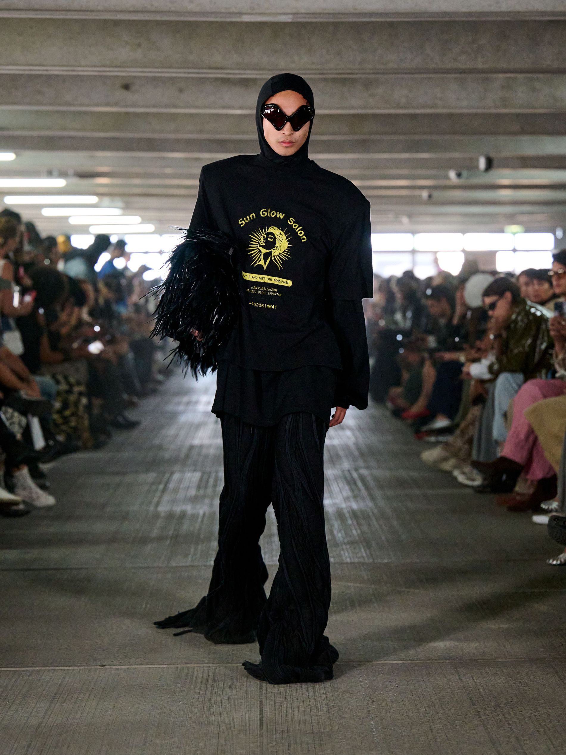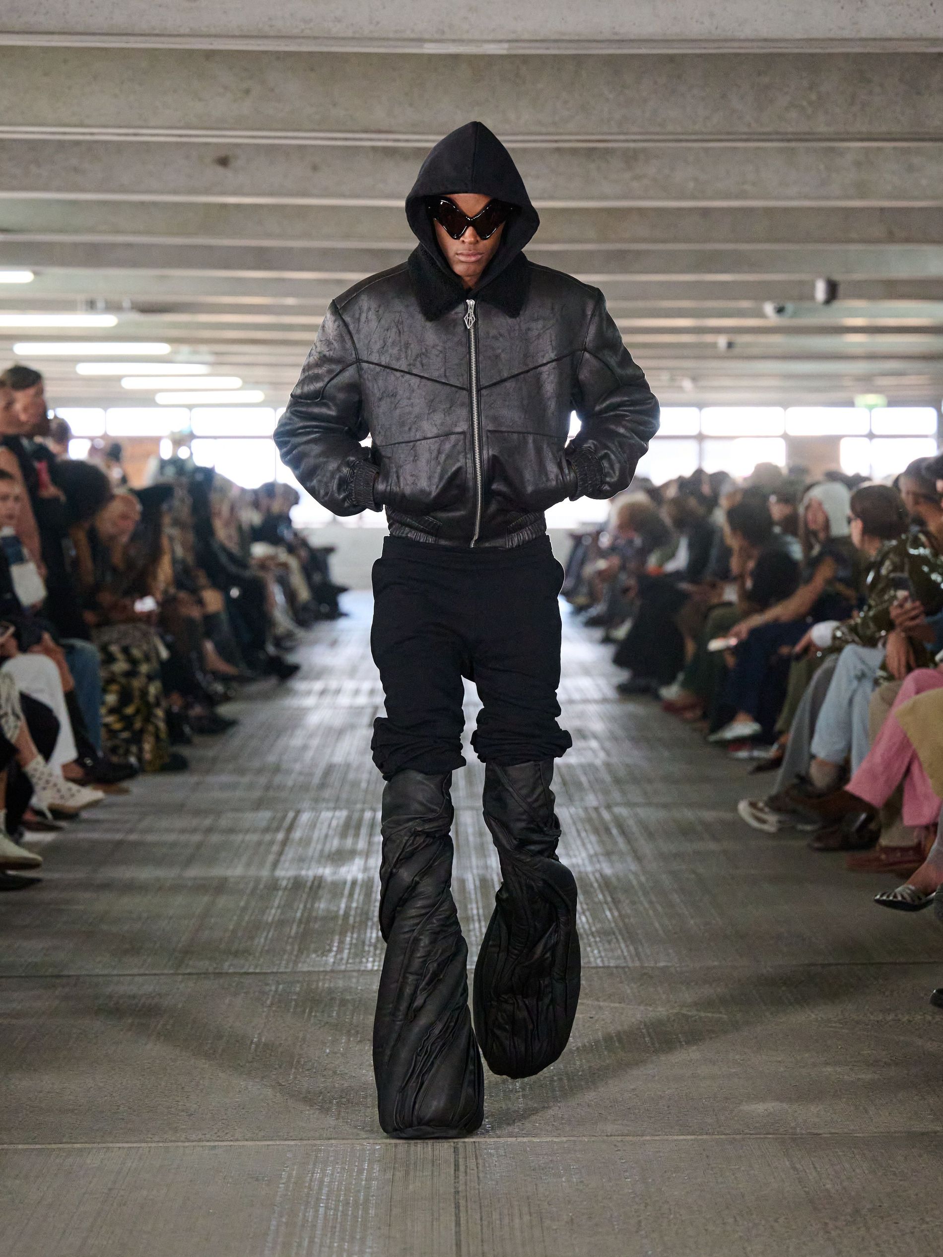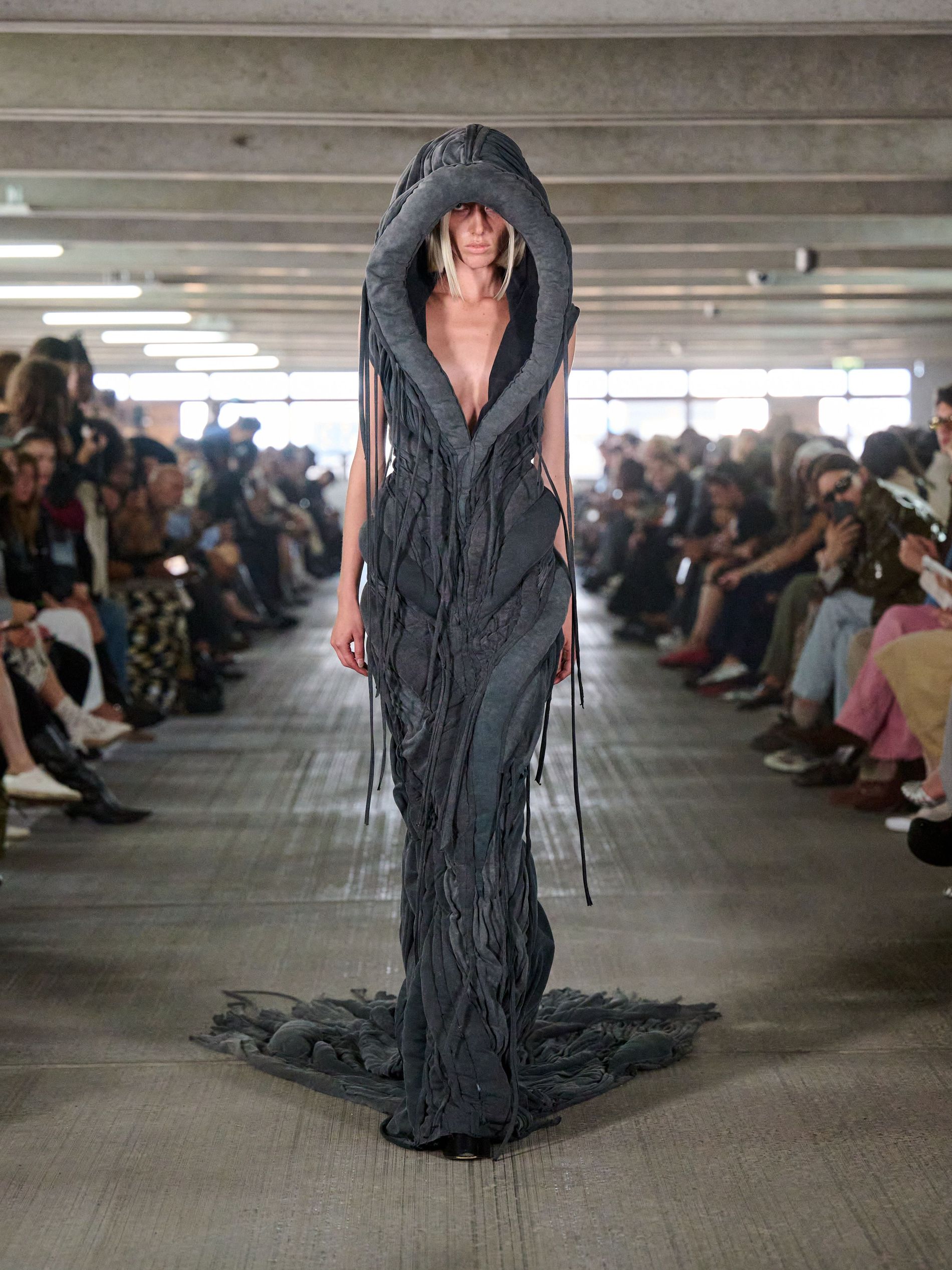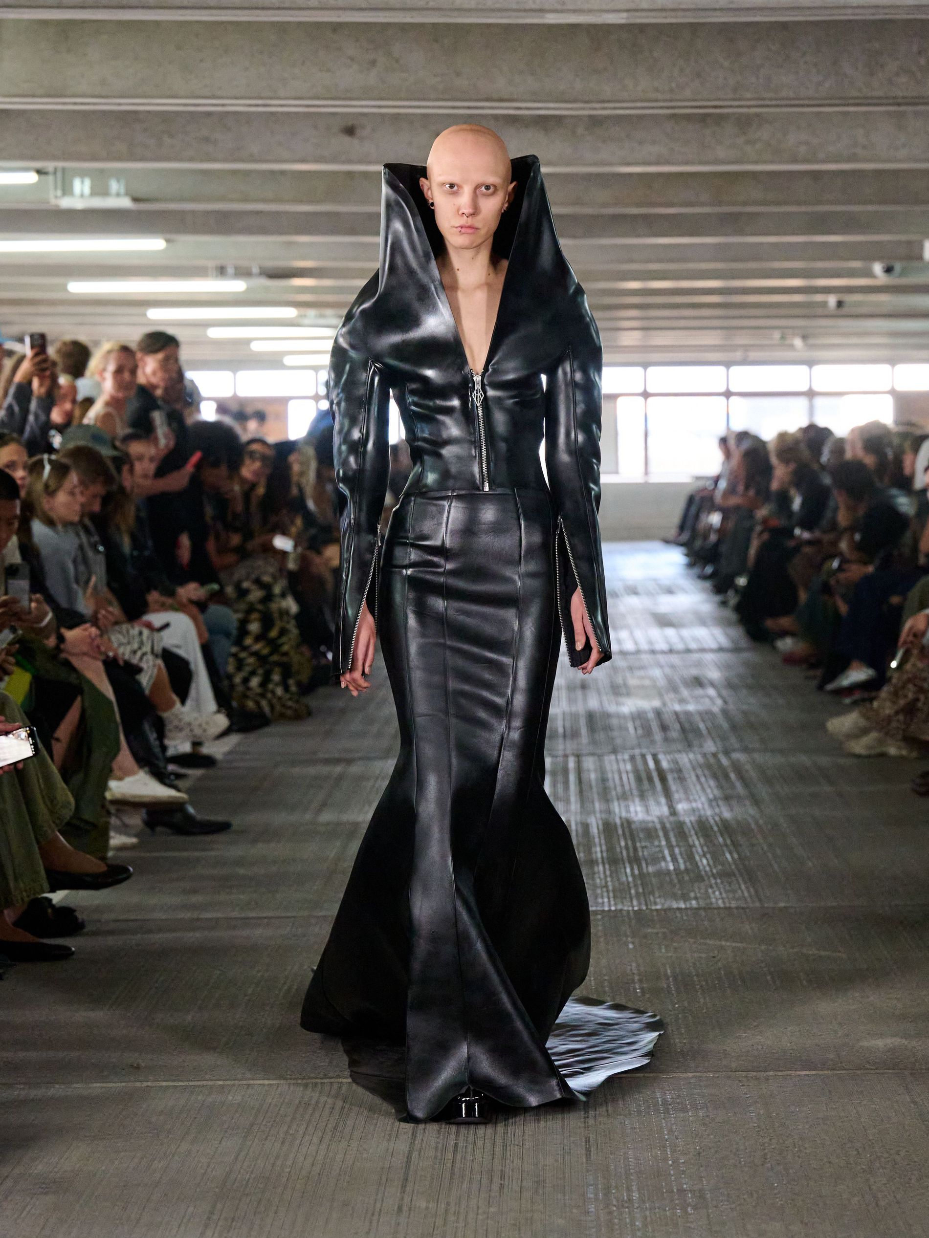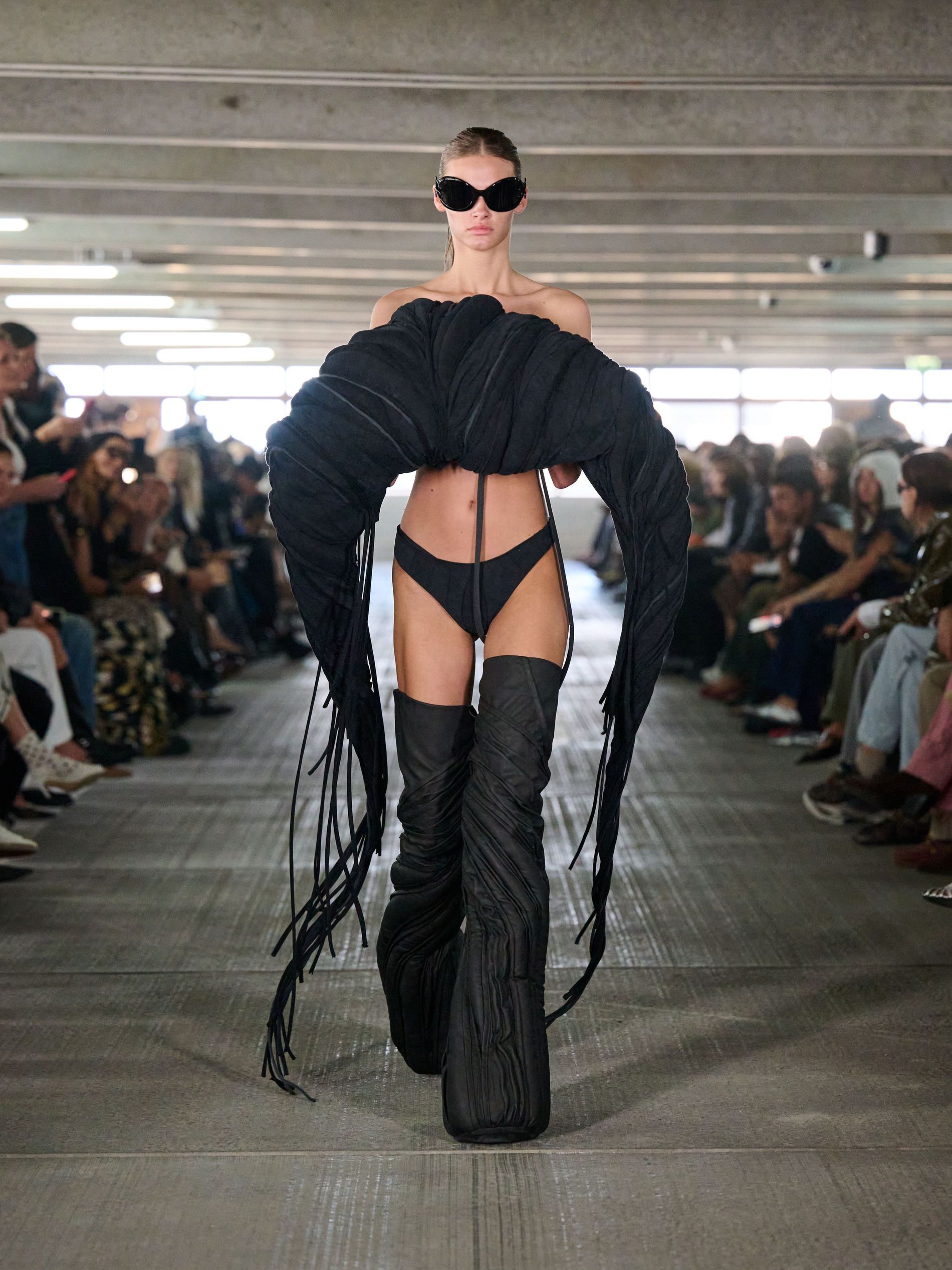 Ceremonial streetwear gets couture treatment in Han Kjøbenhavn’s spring/summer '26 collection, 'Another Day', where fabric dangles from padded shoulders and hips, while collars and hoods protrude to engulf heads. Models shimmy down the runway in three dimensional mermaid skirts detailed with bulging fabric, shiny artificial feathers and clinging faux leather. Its all obvious and intentional, reflecting an exaggerated restraint.