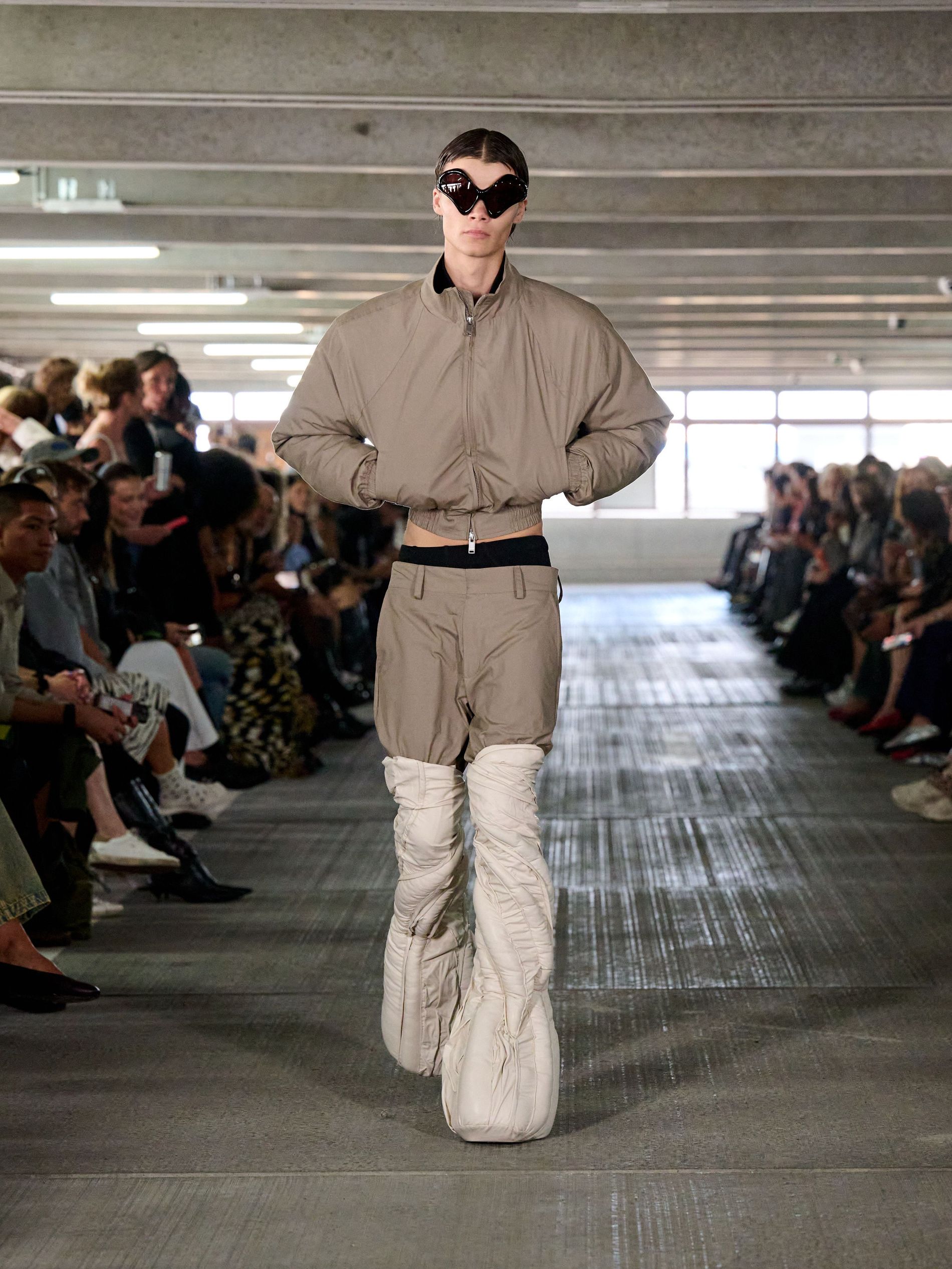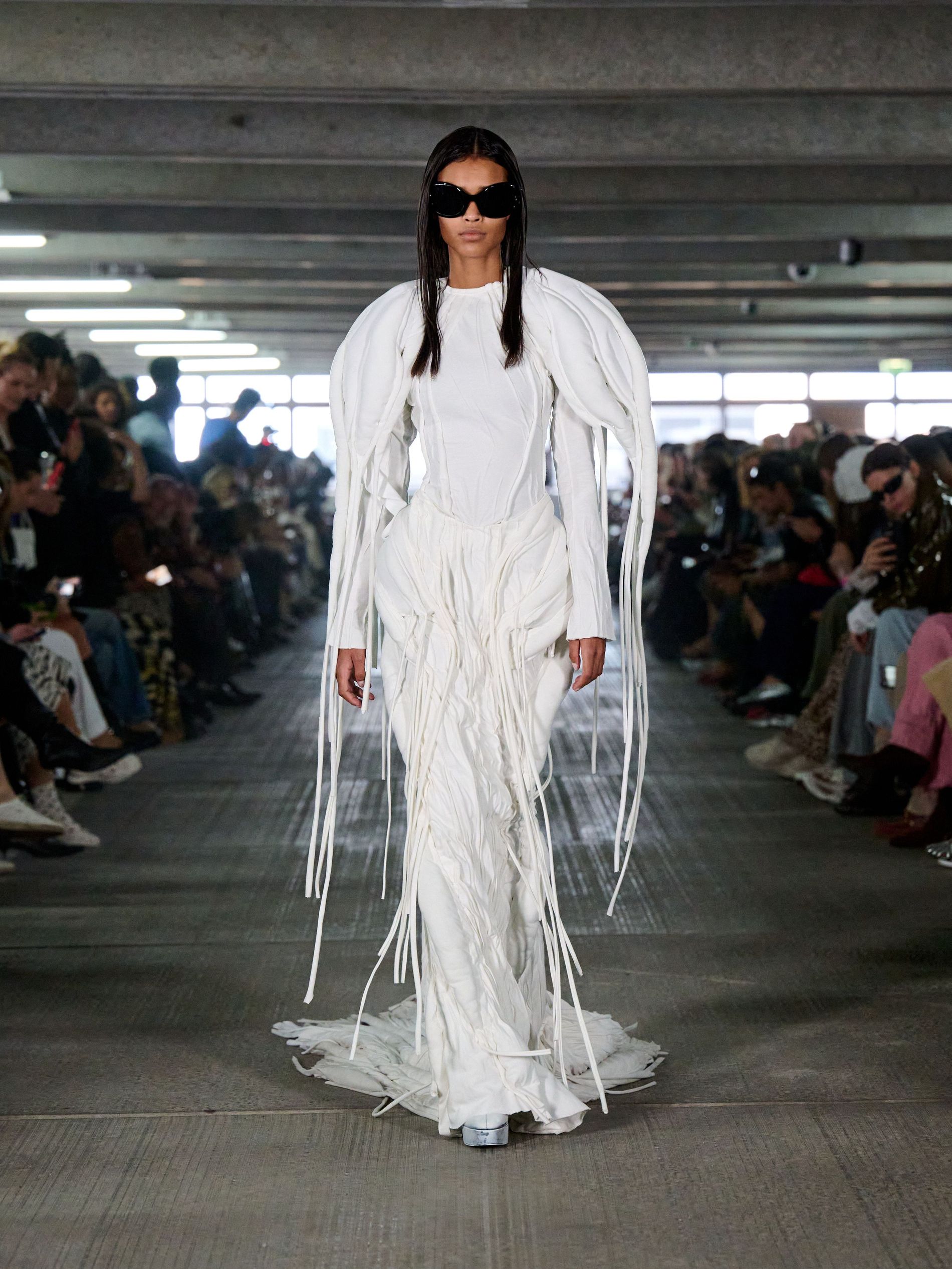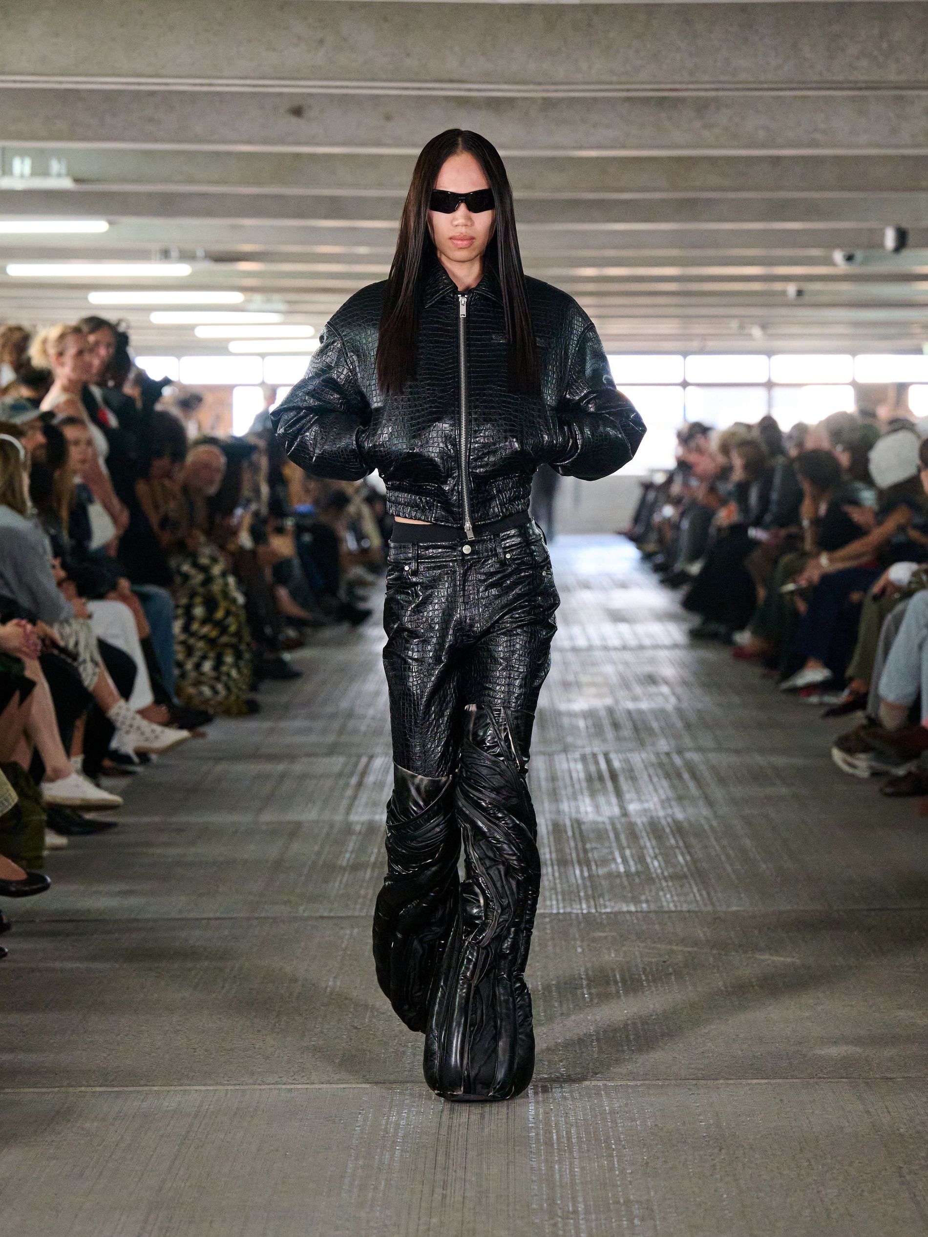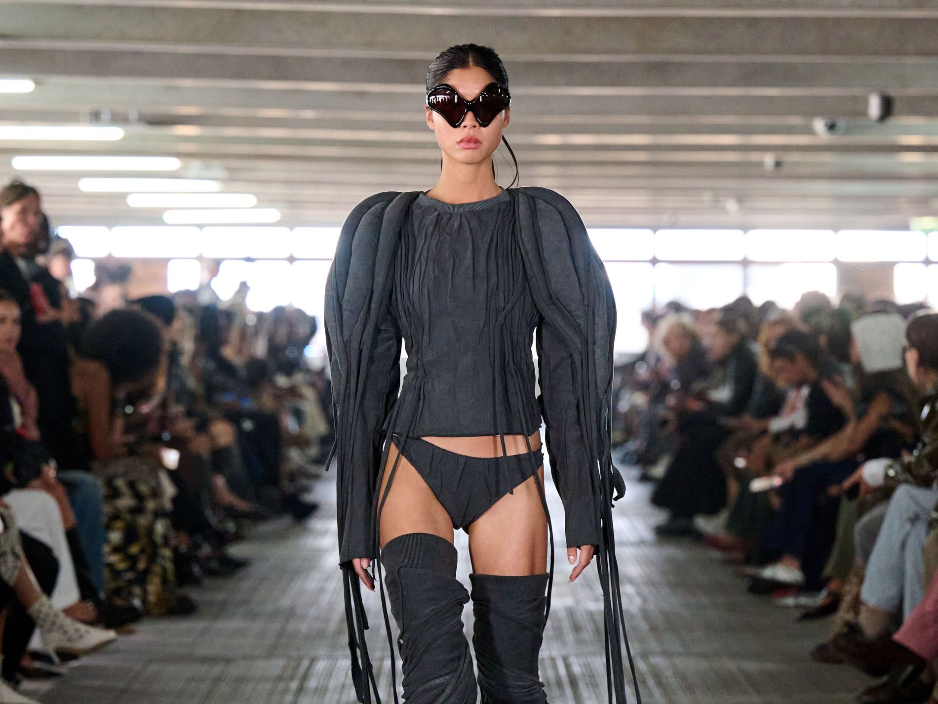Ceremonial streetwear gets couture treatment in Han Kjøbenhavn’s spring/summer '26 collection, 'Another Day', where fabric dangles from padded shoulders and hips, while collars and hoods protrude to engulf heads. Models shimmy down the runway in three dimensional mermaid skirts detailed with bulging fabric, shiny artificial feathers and clinging faux leather. Its all obvious and intentional, reflecting an exaggerated restraint.