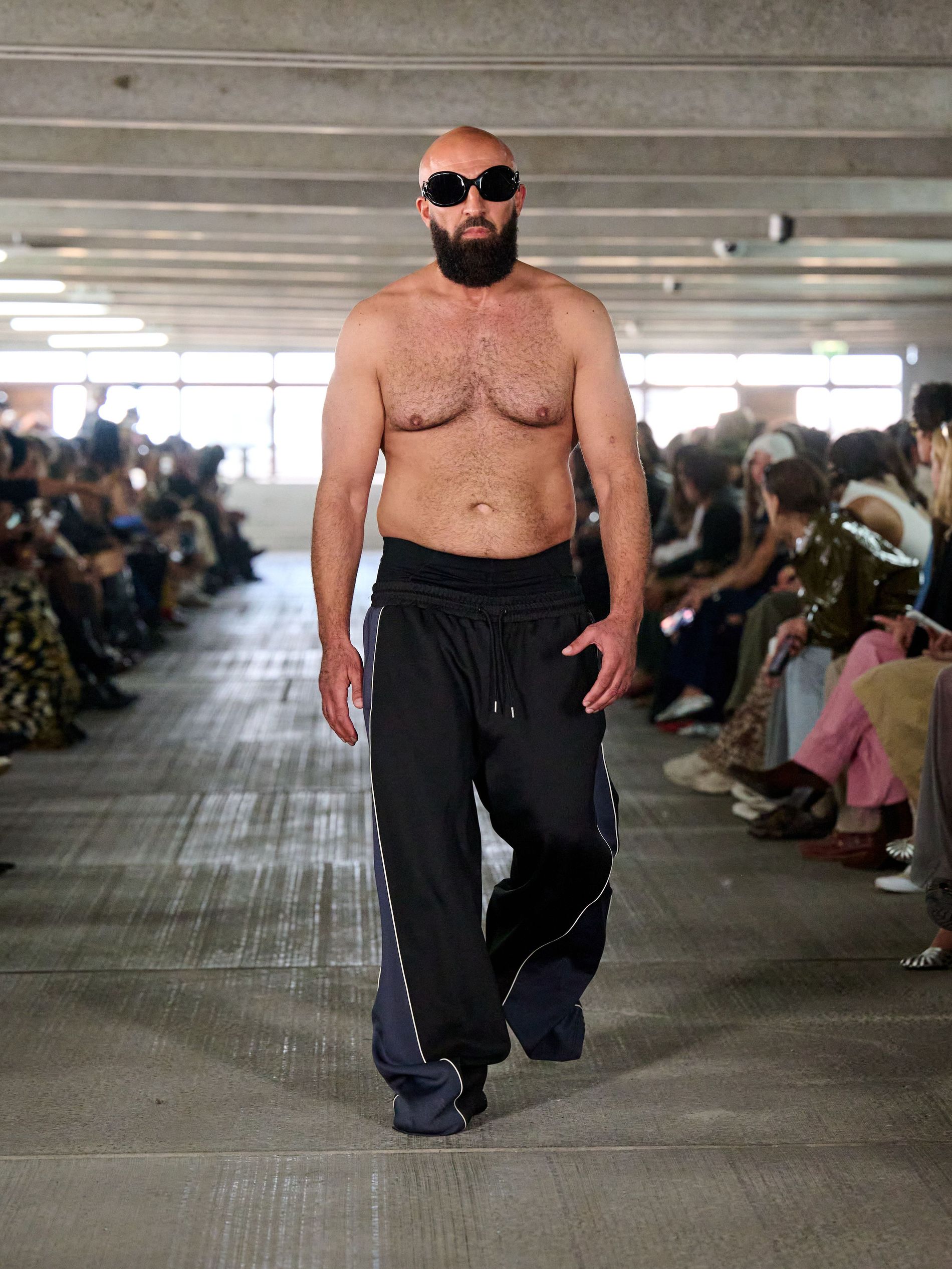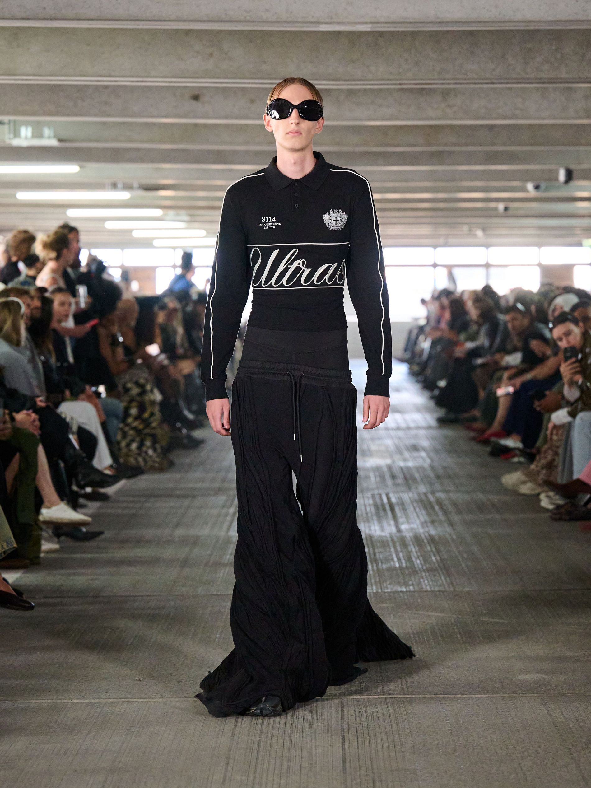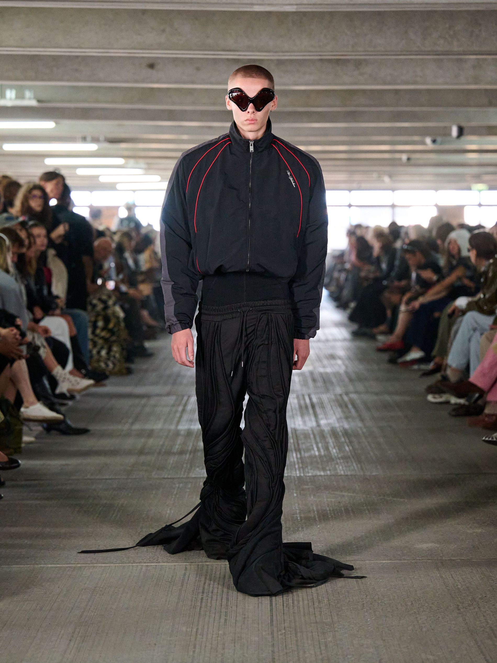 There's an alien likeness to the snug armour-like designs and bug-eyed glasses that stalk down the runway, but there’s nothing otherworldly behind Creative Director Jannik Wikkelsø Davidsen’s designs. 'Another Day' is a remembrance of his suburban youth, capturing the mundane of everyday activities. Jerseys sport logos of a döner shop and spray-tan salon. Tracksuits, while not quite meant for exercise, call forth fluorescent gym lights and trips to the corner shop. Together, they tell a story of suburban masculinity.