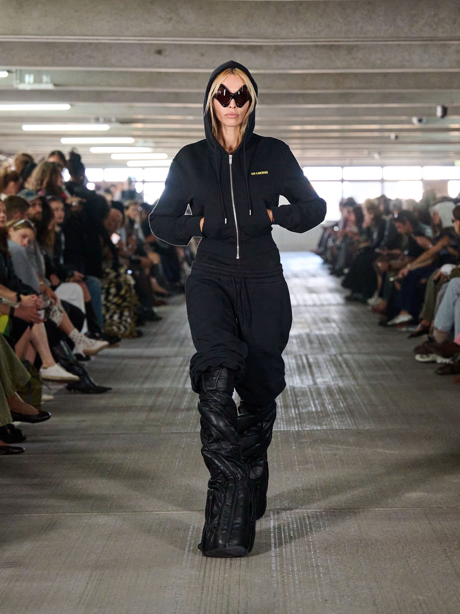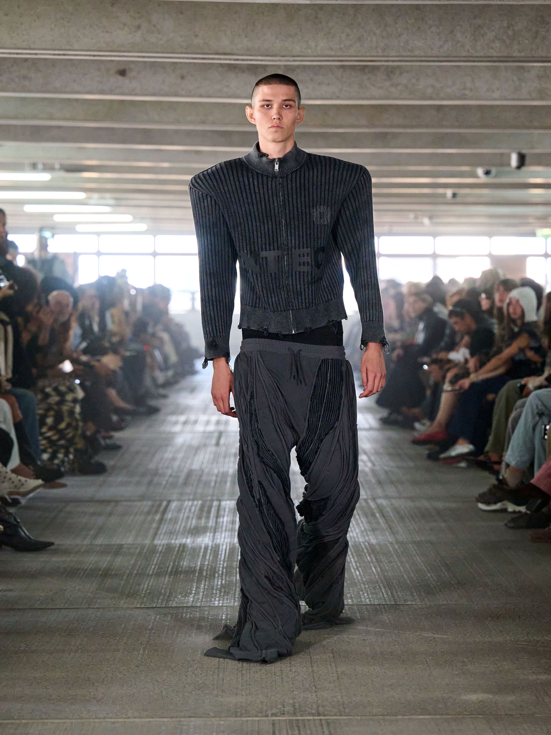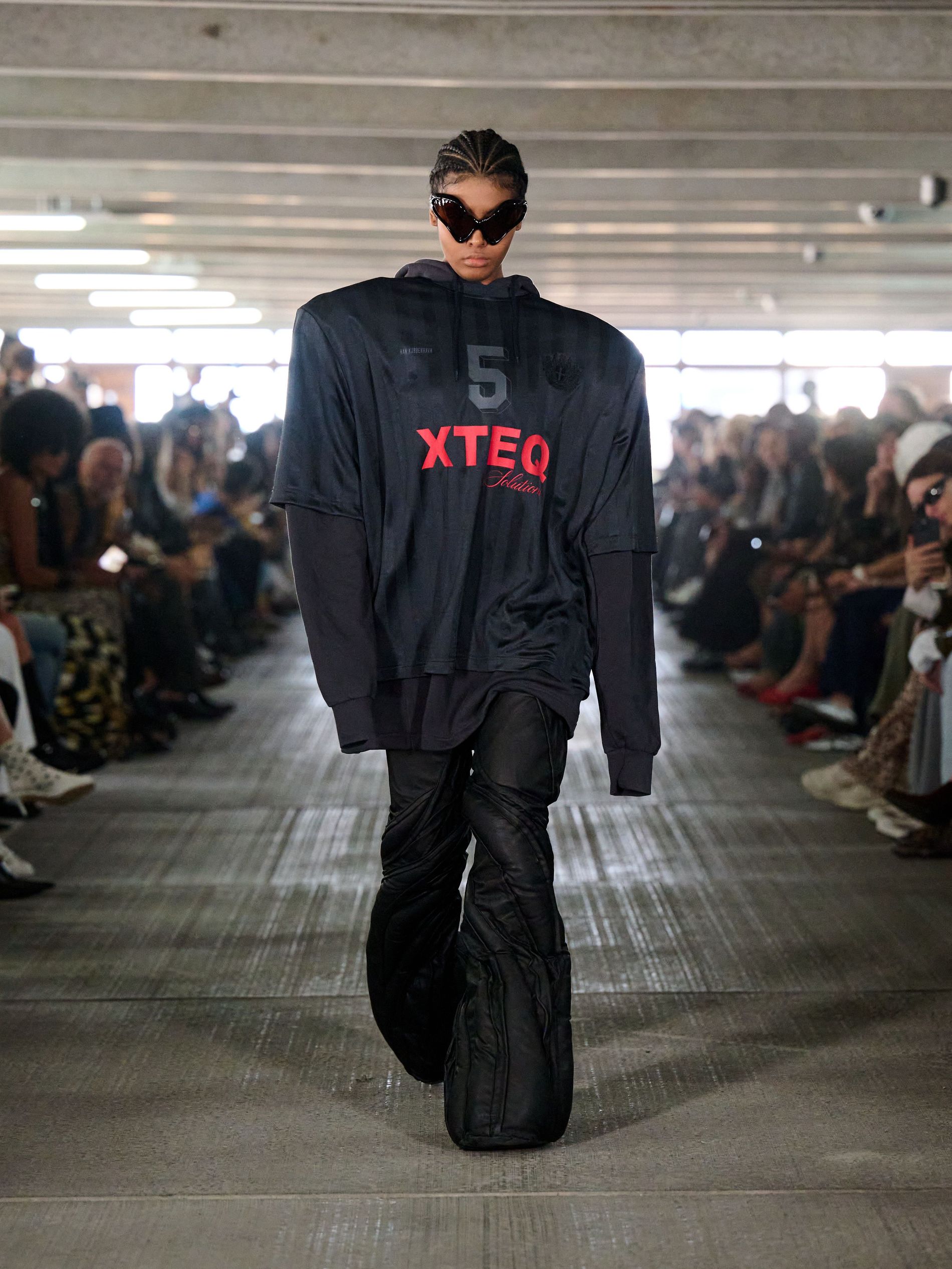 There's an alien likeness to the snug armour-like designs and bug-eyed glasses that stalk down the runway, but there’s nothing otherworldly behind Creative Director Jannik Wikkelsø Davidsen’s designs. 'Another Day' is a remembrance of his suburban youth, capturing the mundane of everyday activities. Jerseys sport logos of a döner shop and spray-tan salon. Tracksuits, while not quite meant for exercise, call forth fluorescent gym lights and trips to the corner shop. Together, they tell a story of suburban masculinity.