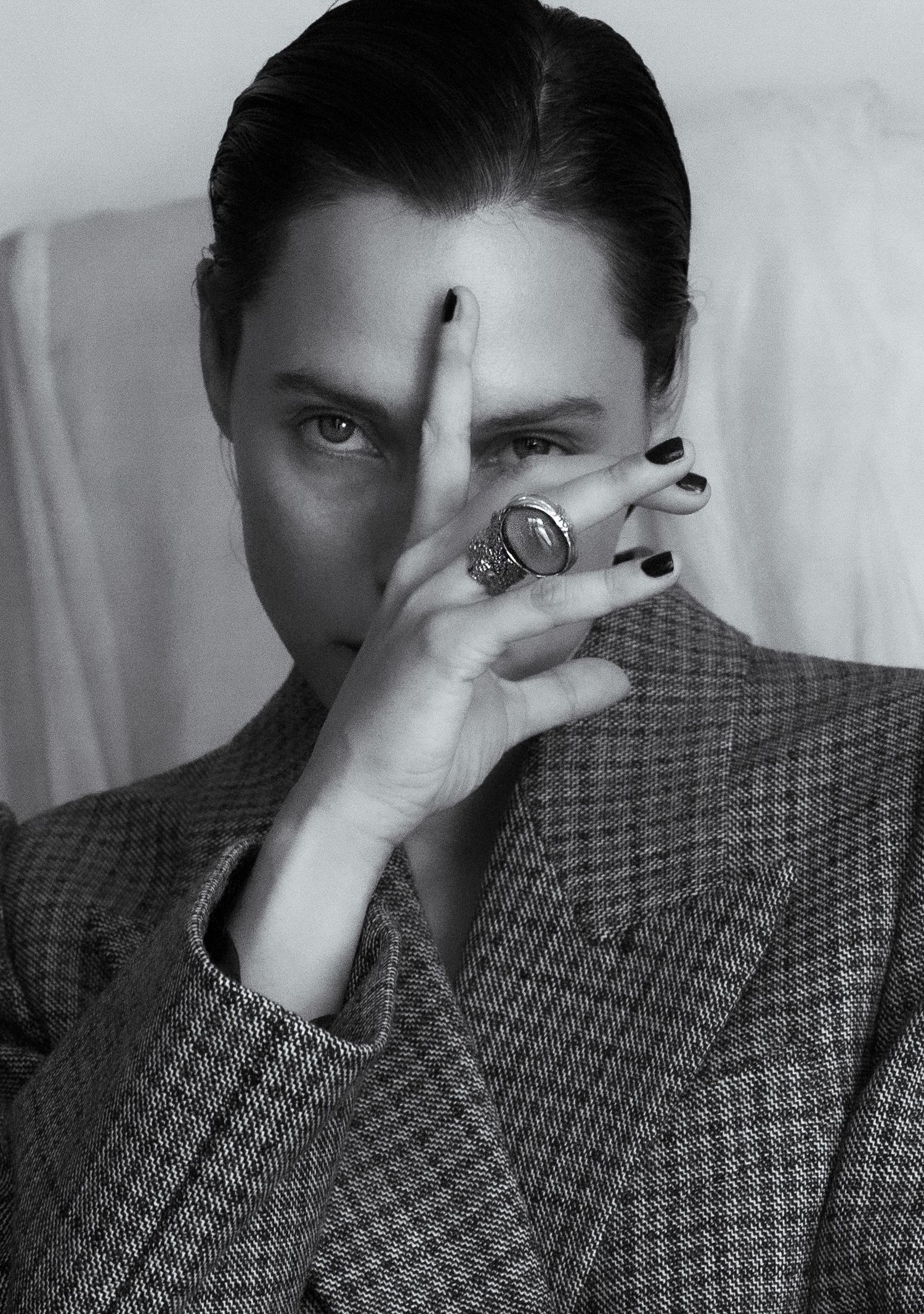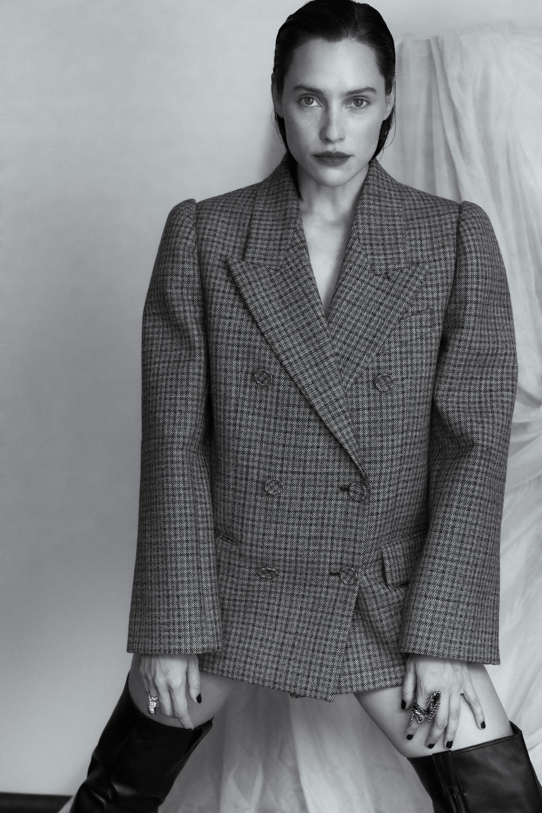 Wearing a grey checked Acne Studios jacket for this Vogue Scandinavia shoot gives me a lift in self-esteem. The accentuated shoulders are shaped to resemble the rounded shoulder of a plush teddy bear. It’s a playful idea executed with strong design, resulting in a jacket that carries power. The teddy bear comparison is not mine – it’s the brilliance of the house, building a collection with purpose and a surprising narrative. A piece like this can shift between silhouettes easily and becomes a solution when situational dressing feels frustrating. I took advantage of the length and paired it with unapologetically sexy over-the-knee boots and big jewellery.
