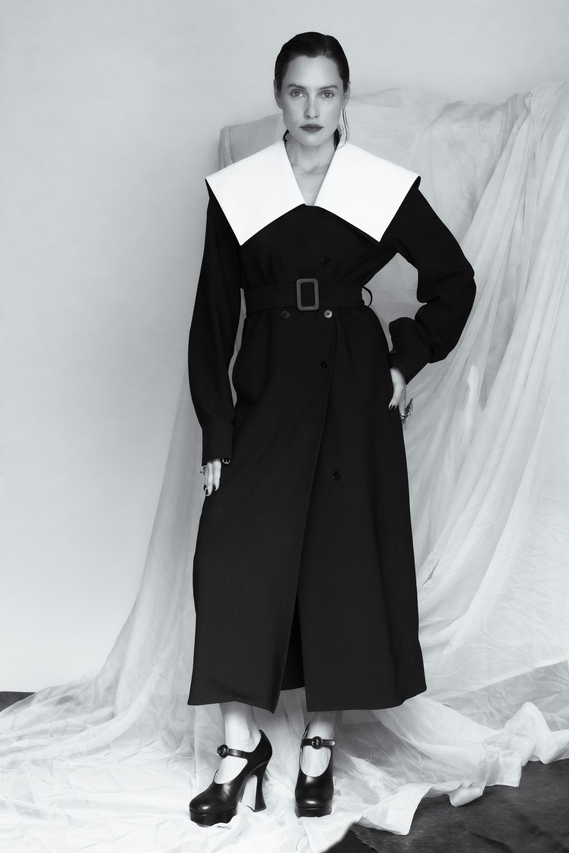 A sculptural double-breasted Jil Sander coat with Miu Miu's chunky Mary-Janes. Photo: Maria Eriksson