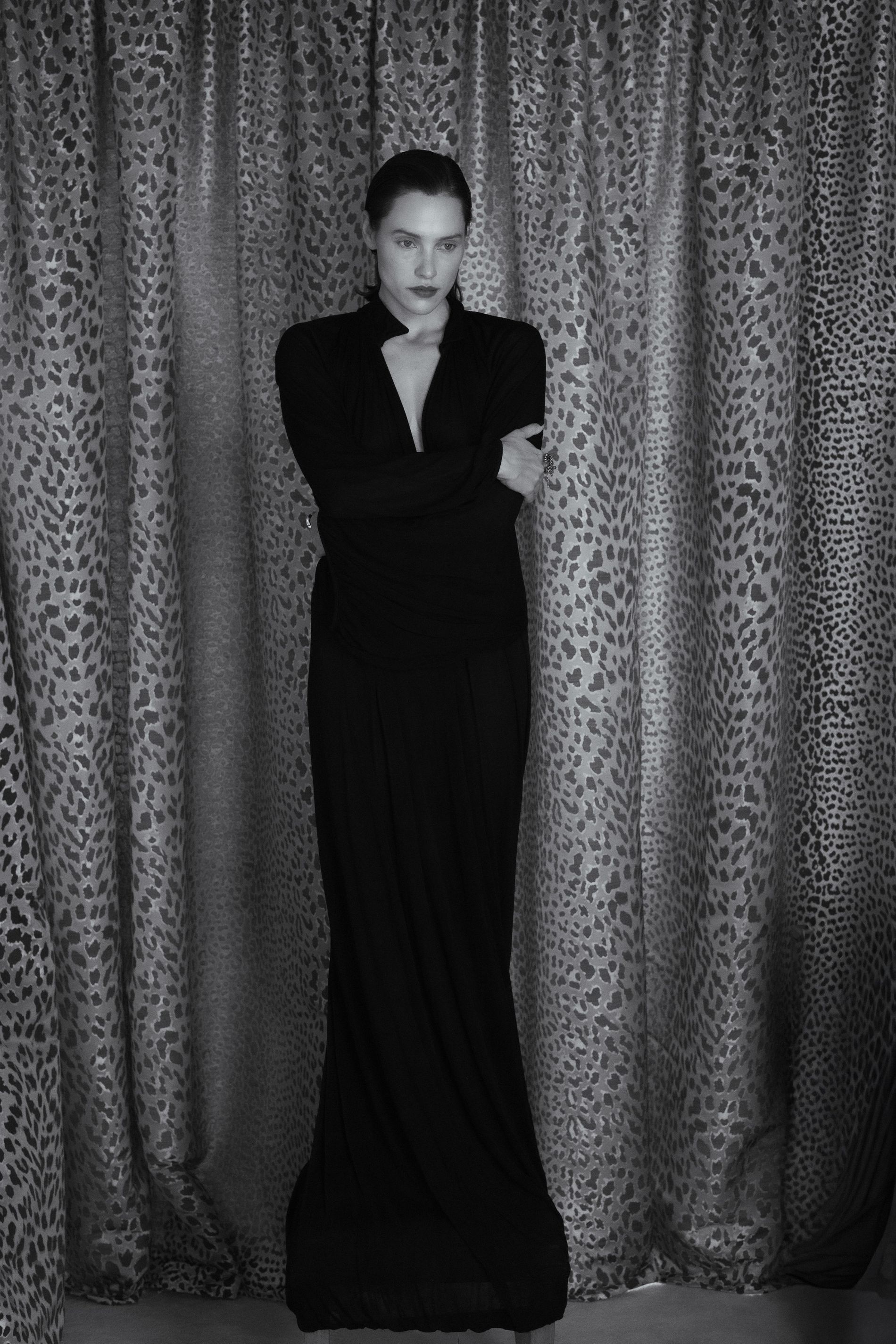 The black and white Jil Sander dress, worn for this shoot, always makes an impact. The construction of the collar and the double-breasted fastening blend the feminine and the masculine sides of tailoring. I love that. I paired it with chunky Miu Miu Mary-Janes. The shiny coat I wear against the leopard background – another standout piece from Jil Sander – secures that balance between soft and hard. Side note: good department store sales are full of treasures.