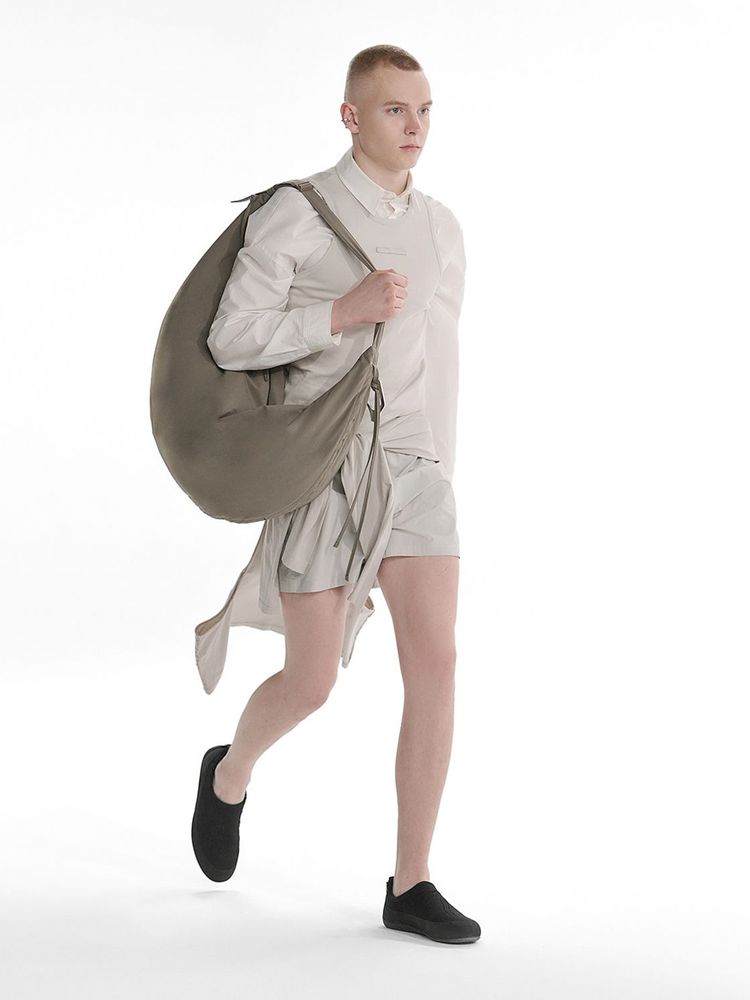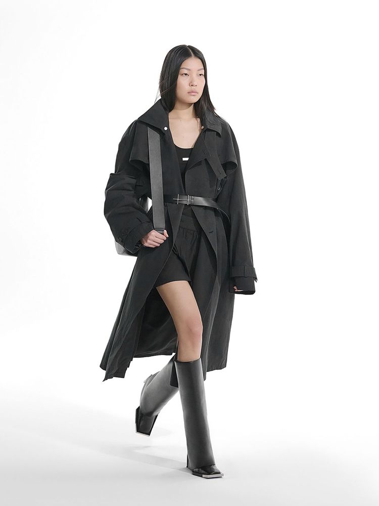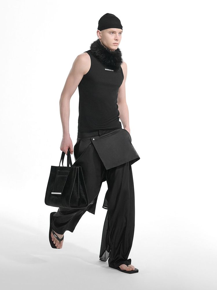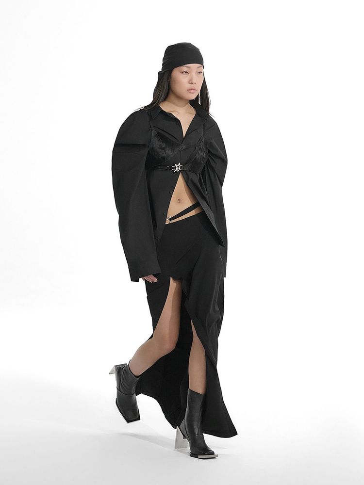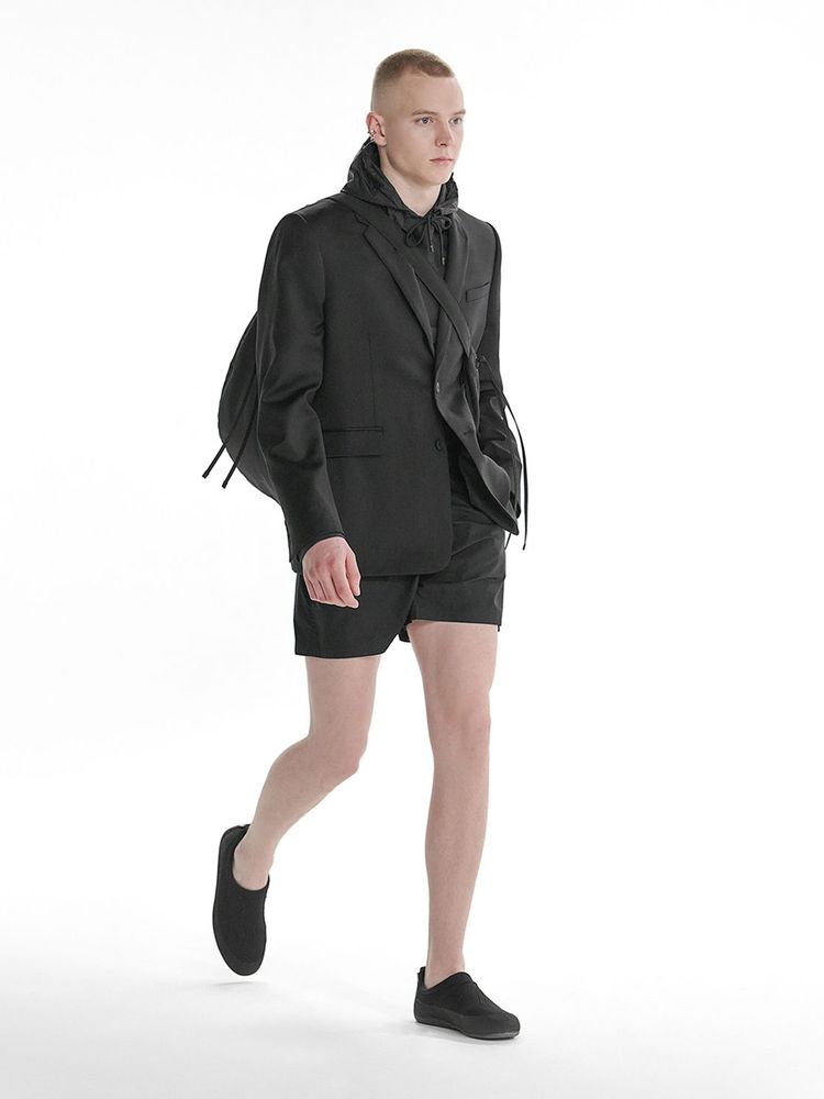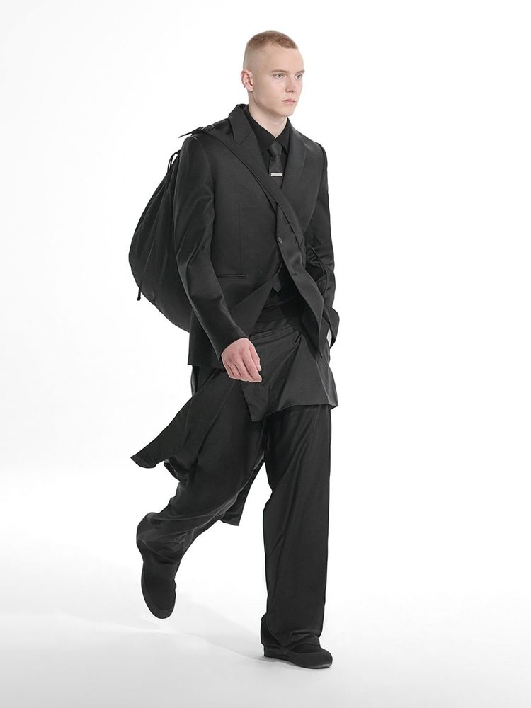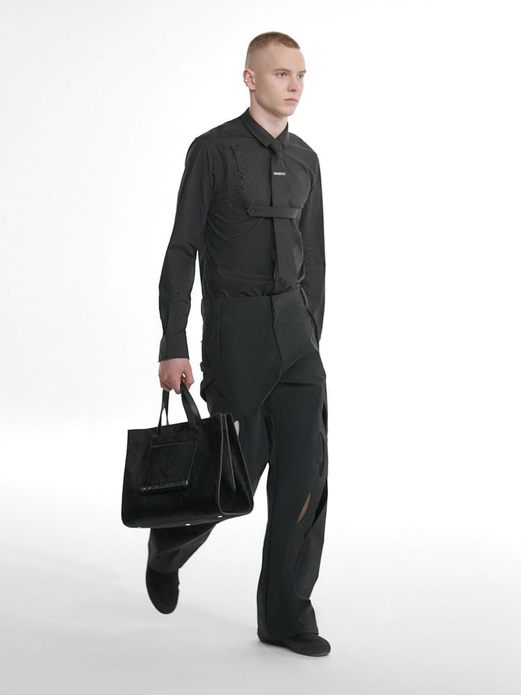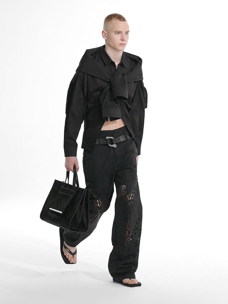 Overall, the looks are more pared back – less complex – than previous outings. Fewer straps and complications; sharply-tailored pieces with one signature flourish. “It’s always a balance, right?” says Juul. “Because you want to keep it interesting enough that people are intrigued, but not so complex that people are thrown off.” The women’s offering, meanwhile, leans closer to the men’s. Gone are the teeny tiny black dresses and bra tops (mostly, anyway) replaced with structured blazers and borrowed-from-the-boys shirting. “We’re growing up with our customers as well,” says Juul. “The customers we’ve had for years are getting into the era of having serious jobs and going places where they need to wear something formal.”
