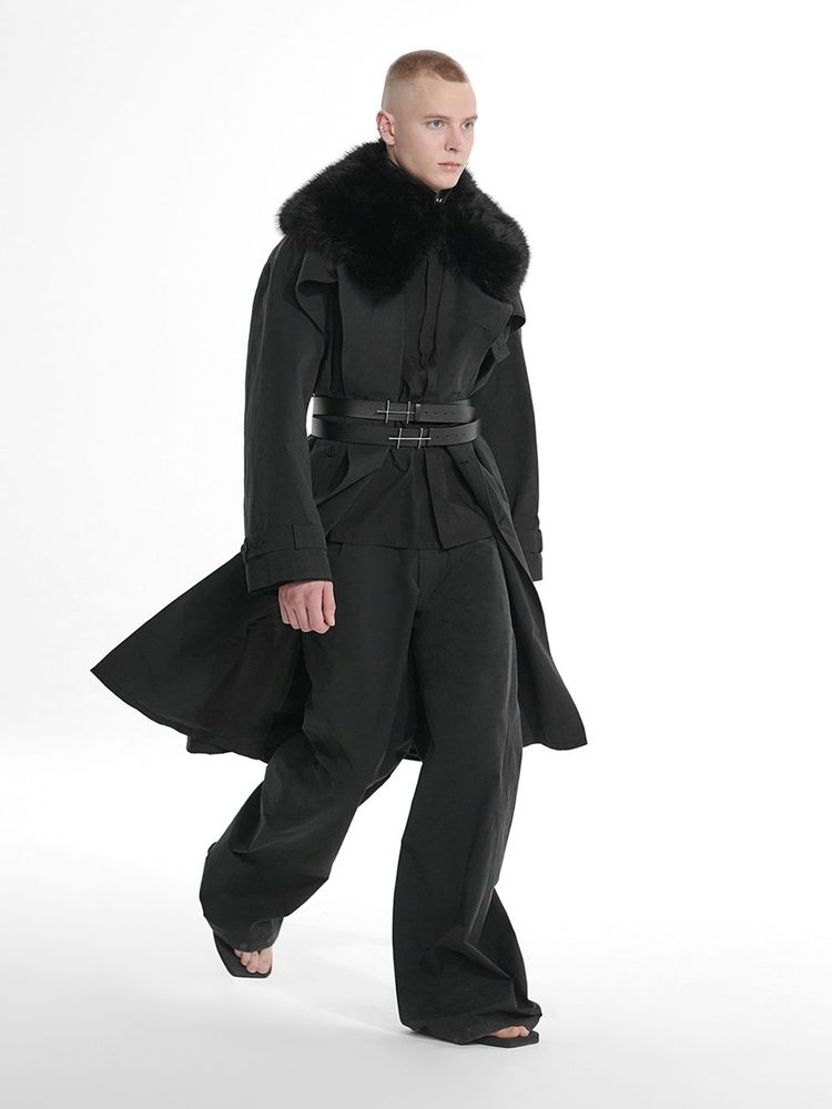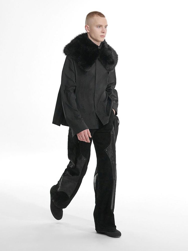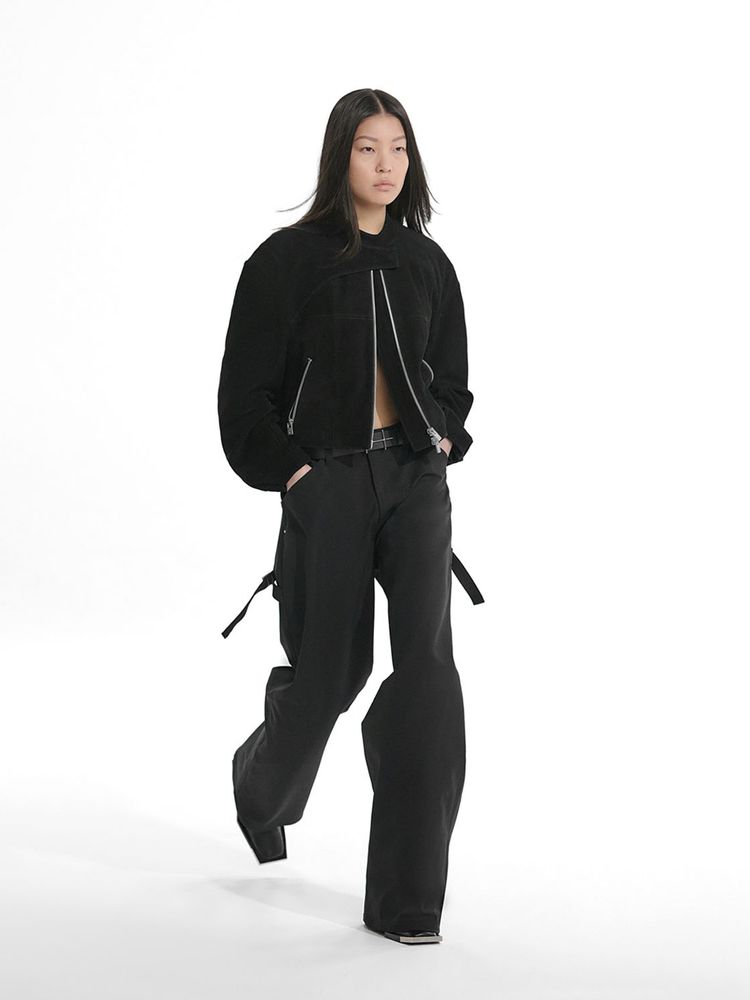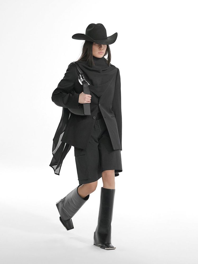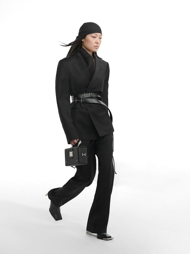 Wider ethos aside, the collection indeed draws direct inspiration from horses. Black shearling collars harken to a horse’s mane and sharply structured silhouettes speak to the animal’s powerful form. Elsewhere, leather harnesses and fastenings – a Heliot Emil signature – bring to mind bridles and reigns. In this fresh context, the brand’s signature covered leather boot instantly becomes footwear fit for a rider. There’s even a cowboy hat. “We thought, ‘Should we do this or is it too straightforward’,” admits Juul. “But I thought it was interesting, with the suit and the cowboy hat. It’s an interesting mix.” The look instantly brings to mind Ed Harris’ Man in Black in HBO’s Westworld adaptation.