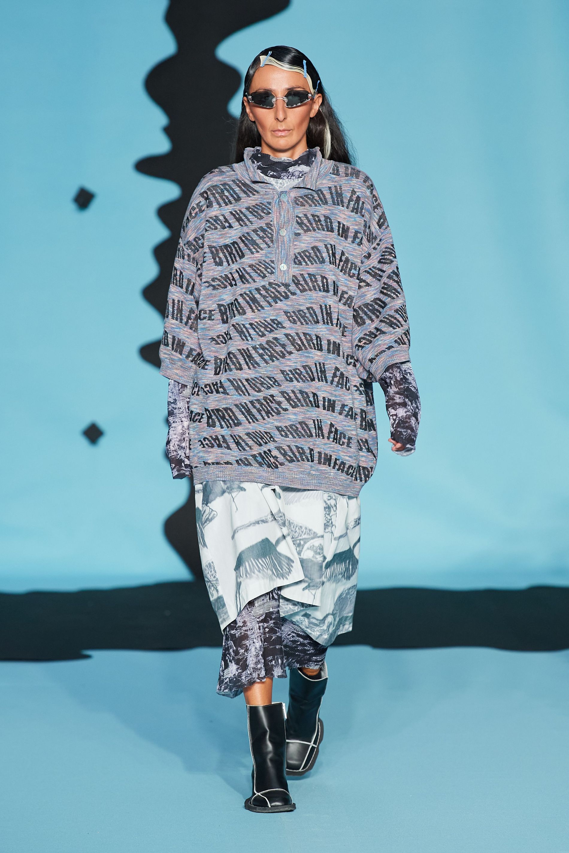 Henrik Vibskov is forthright about its own focus on bridges, with models intersecting across eight small bridge structures positioned on the runway. For the Danish designer, it’s more about the meeting point of humans and nature, with Vibskov fixated on the idea of a clash with bird, as a bridge "allows the feet to touch where only birds used to inhabit,” according to the show notes. “Through its lifespan the structure has moments of congestion and abandonment. The brutalistic materials of steel and concrete are able to transform into a romantic setting, making the structure a universal icon for metamorphosis.”