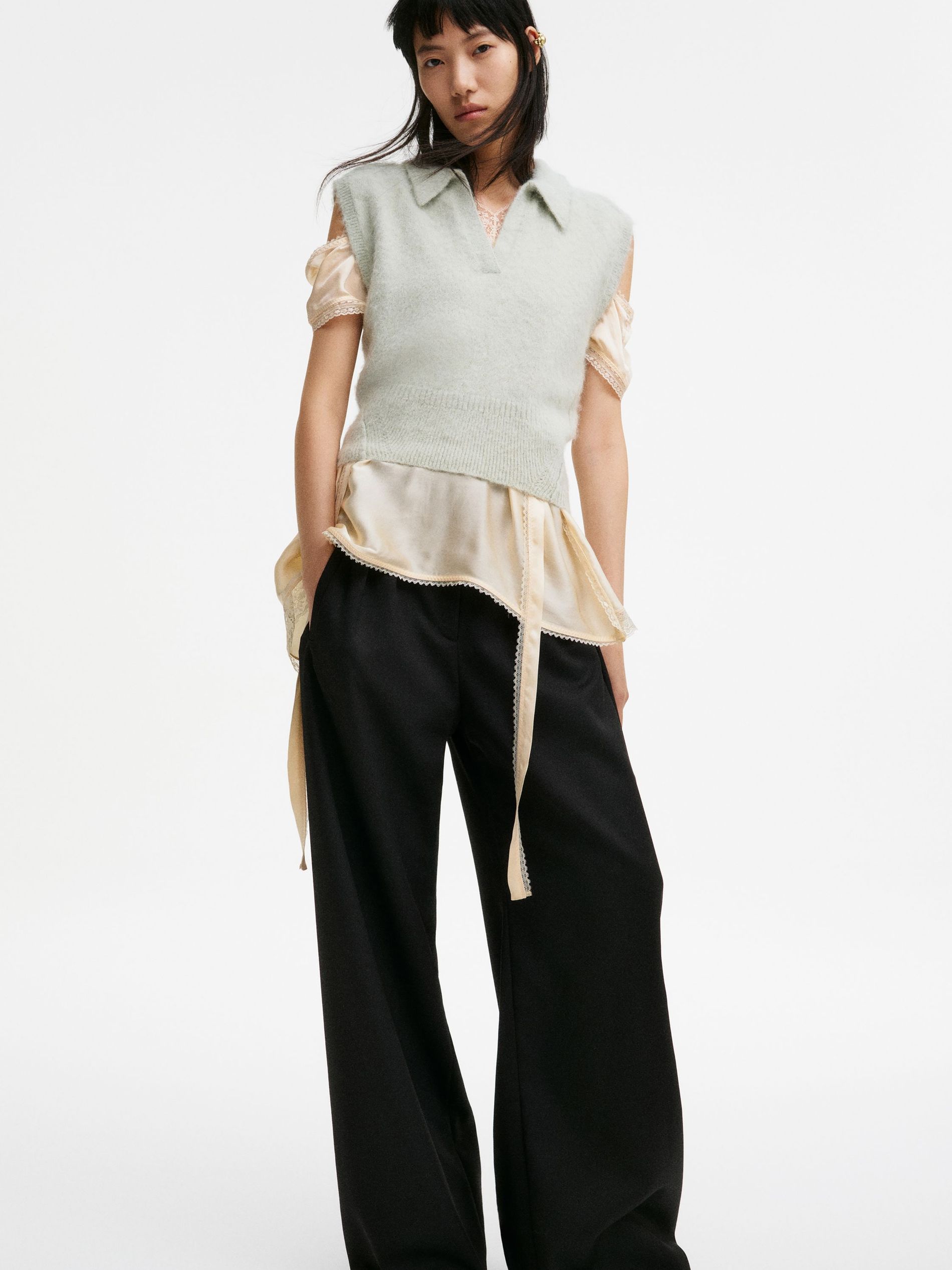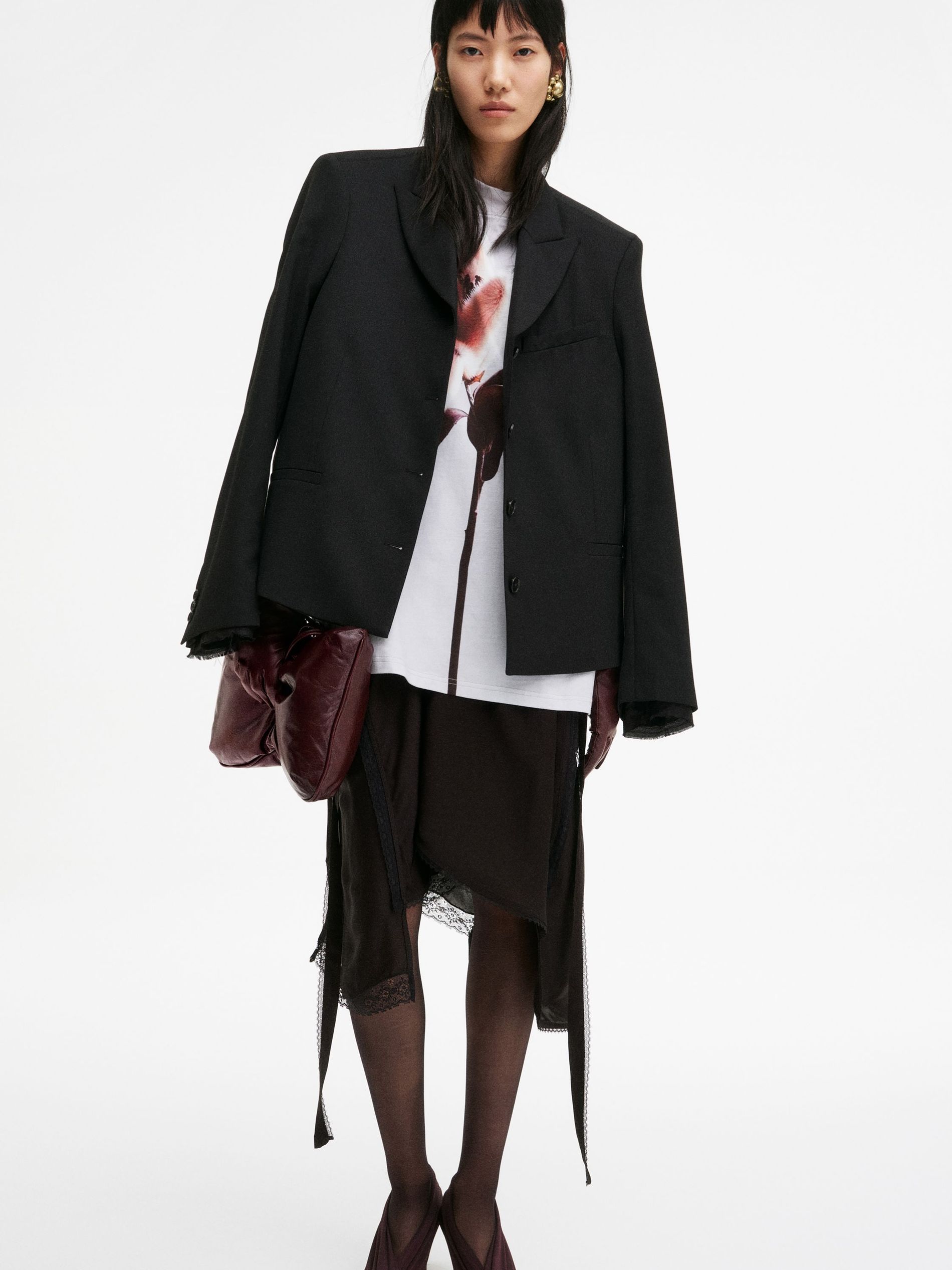 The team’s answers included asymmetric cuts (see uneven hems on slip skirts), raw edges, slits, shrunken lapels, and exaggerated lengths (pants that puddle around the feet). Tiny lingerie bows on pieces made from shapewear material in muted pastel colours referenced the kawaii culture of Japan, where the team traveled in search of inspiration this season. As usual, the tailoring pieces—particularly the funnel-neck jackets—were the standouts in a collection that was desirable, if more tame than offbeat.